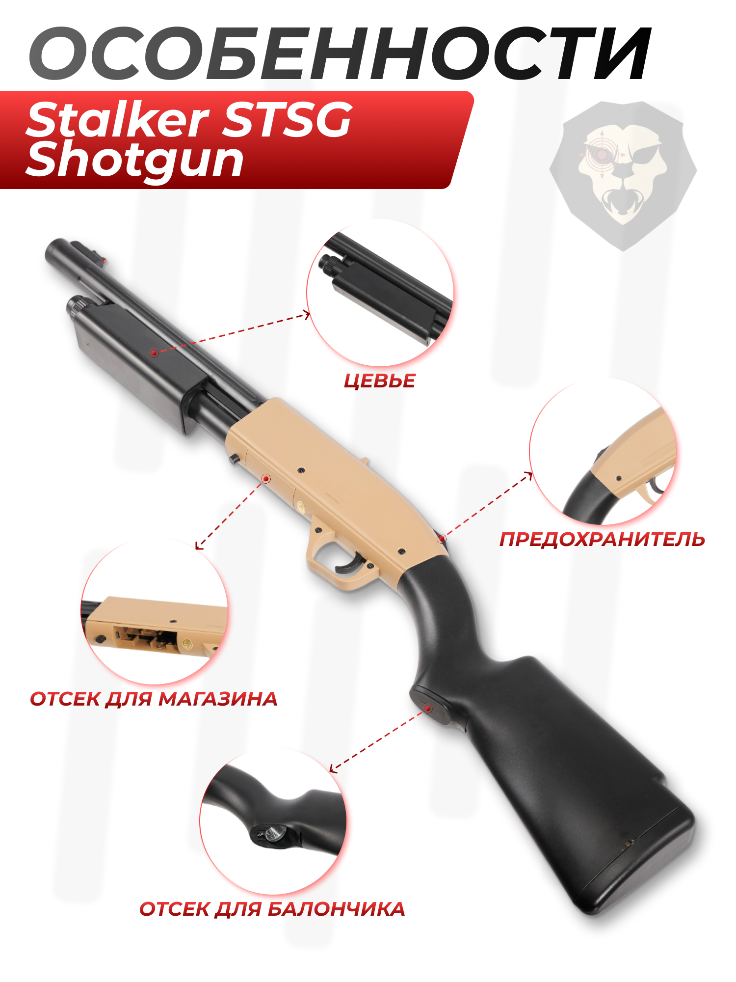 Изделие Stalker изготовлено из ударостойкого полимера и оформлено в двухцветной схеме - ствольная коробка окрашена в песочный оттенок, а ствольный блок с прикладом сделали черными. При этом ствол, газобаллонный агрегат и другие элементы механики изготавливают из металла, что увеличило ресурс рассматриваемого оружия. Масса дробовика составила 0.9 килограмма, благодаря чему им комфортно пользоваться не только взрослому мужчине, но и юношам с девушками.