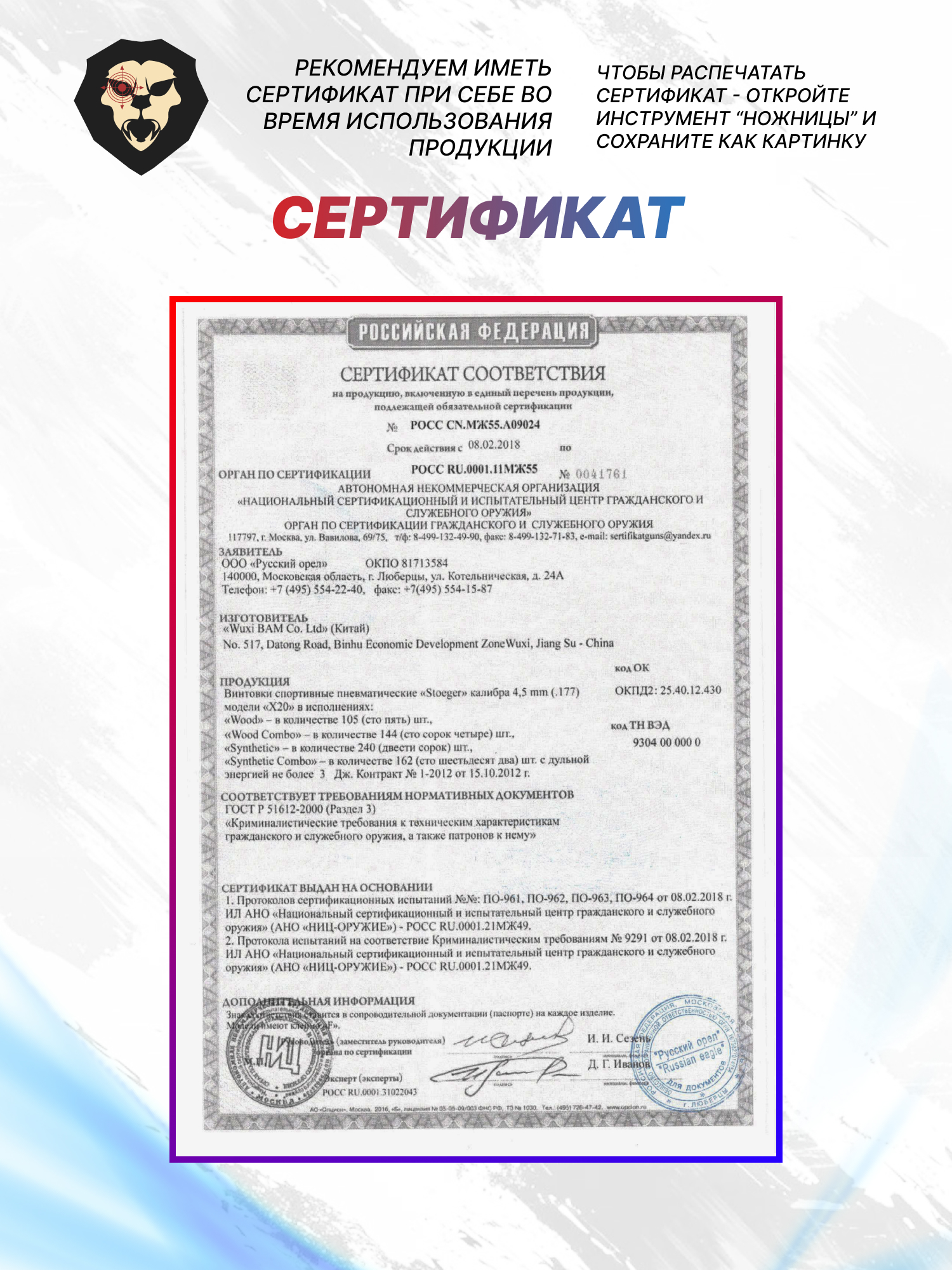 | Комплектация | Винтовка, упаковка, краткая документация, копия сертификата (по запросу покупателя) |