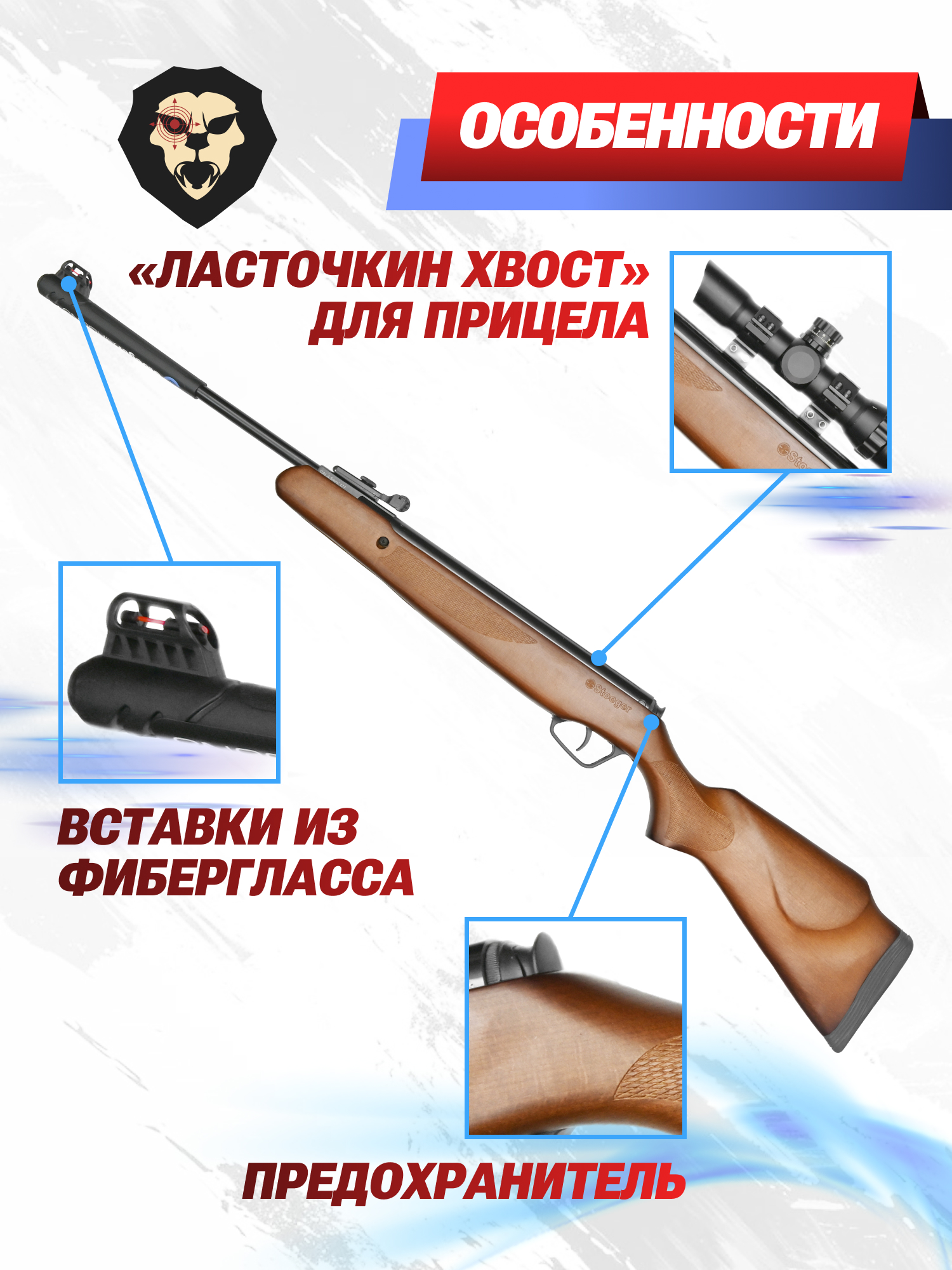 Ложе рассматриваемой пневматики Стоеджер х20 Вуд выполнено в классической компоновке и изготовлено из дерева, благодаря чему имеет эстетически привлекательный вид и эргономичный дизайн. На рукоять оружия нанесен текстурный ребристый рисунок для удобства хвата, аналогичная шершавая поверхность расположена на цевье. Приклад оборудован прорезиненным затыльником, который снижает создаваемый выстрелом импульс, а также двусторонним подщечником для удобства наведения на цель.