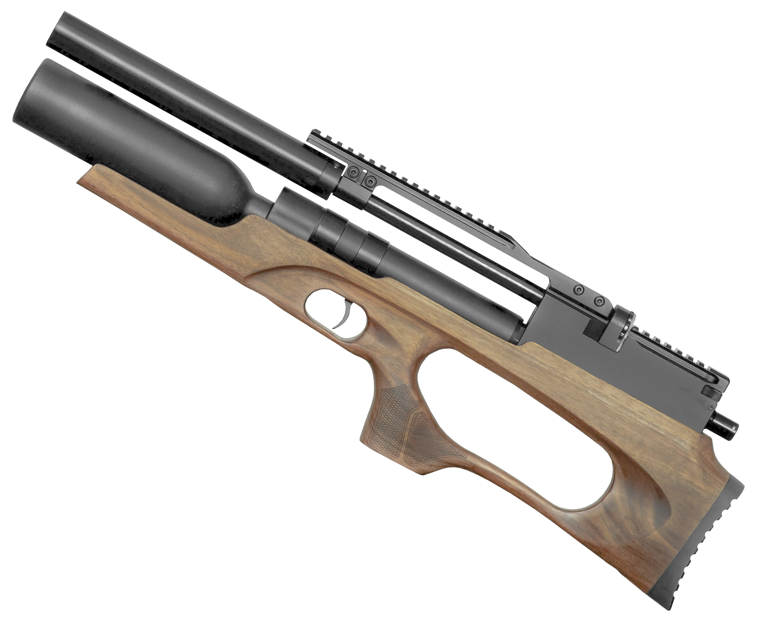 Компания представила серию мини БуллПап ПСП, которая сочетает скромные габариты с рабочими качествами старших флагманов. Рассматриваемый экземпляр Storm Atlas отличается наличием предустановленной колбы на 300 кубических сантиметров. Эта особенность позволяет пневматике совершать сопоставимое количество выстрелов с полноразмерными карабинами.