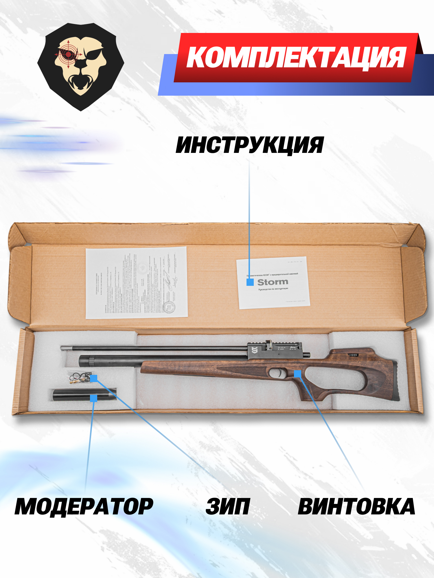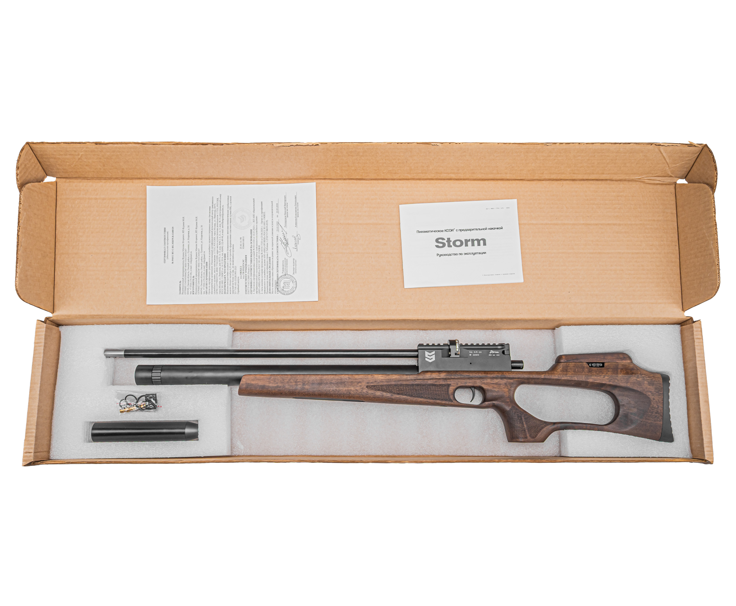 | Комплектация | Винтовка, заправочный штуцер, магазин, антибздун, пульный лоток, комплект РТИ, упаковка, краткая документация, копия сертификата (по запросу покупателя) |