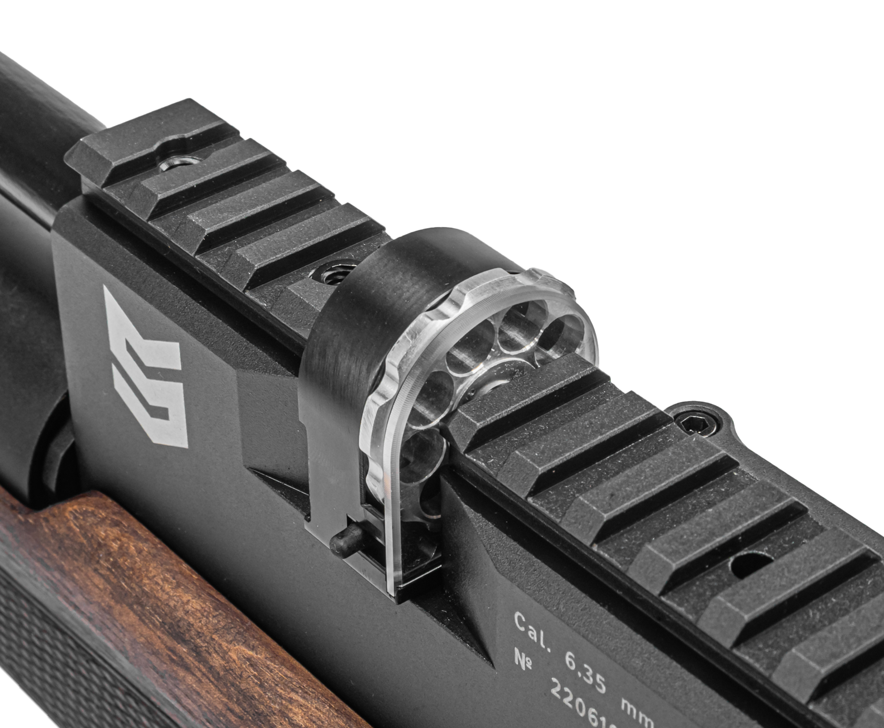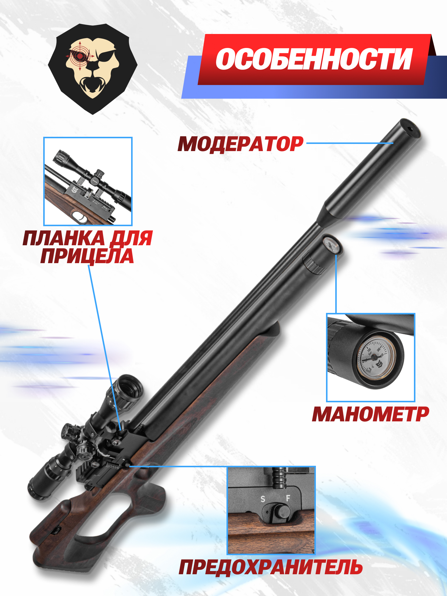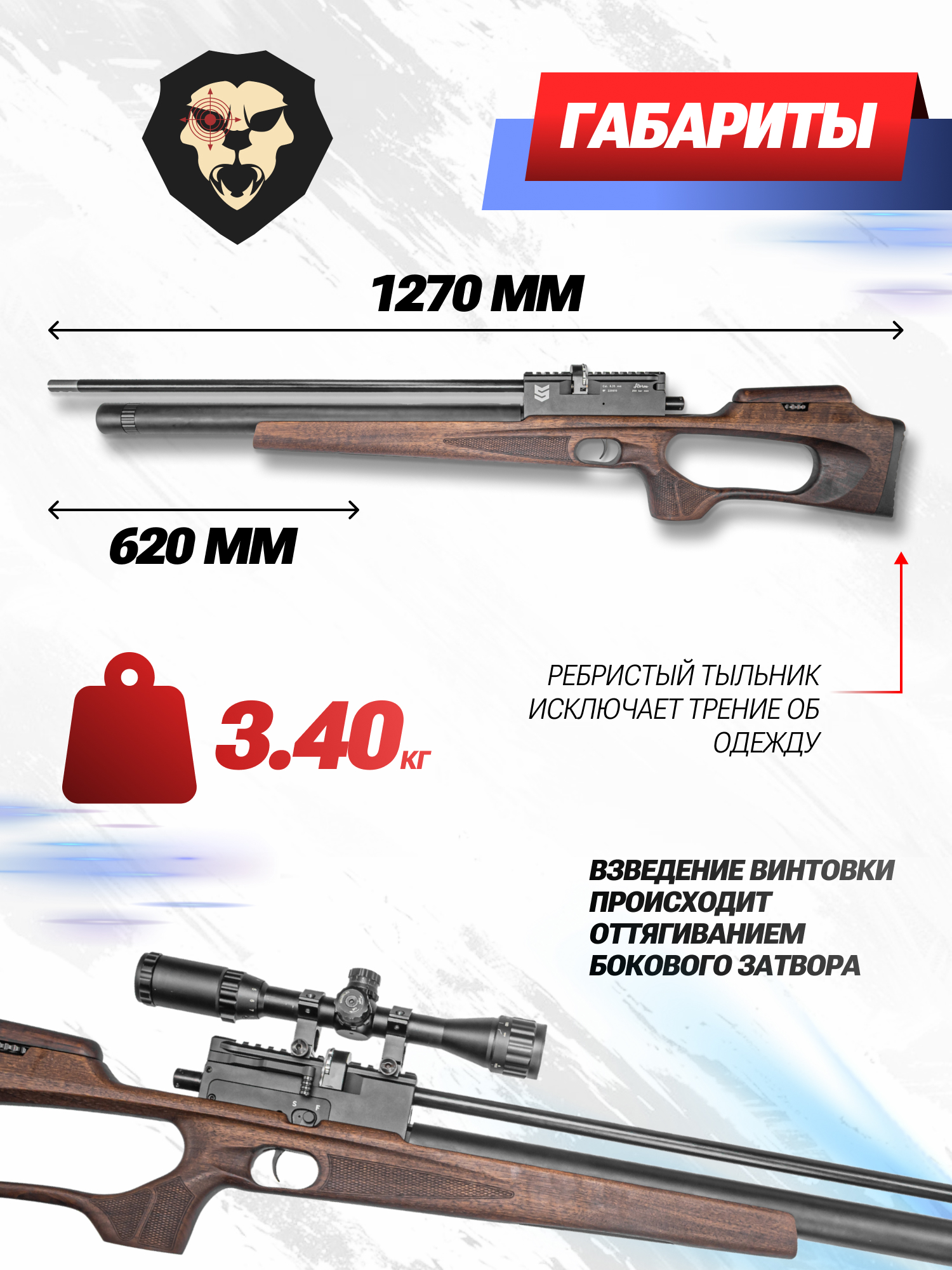 Само хранилище выполнено в линейном форм-факторе и имеет повышенную вместимость 310 кубических сантиметров. Винтовка построена по прямоточной схеме и оснащается манометром, чтобы стрелок смог оперативно контролировать текущую степень заполнения системы. Датчик встроен в нижней части цевья.