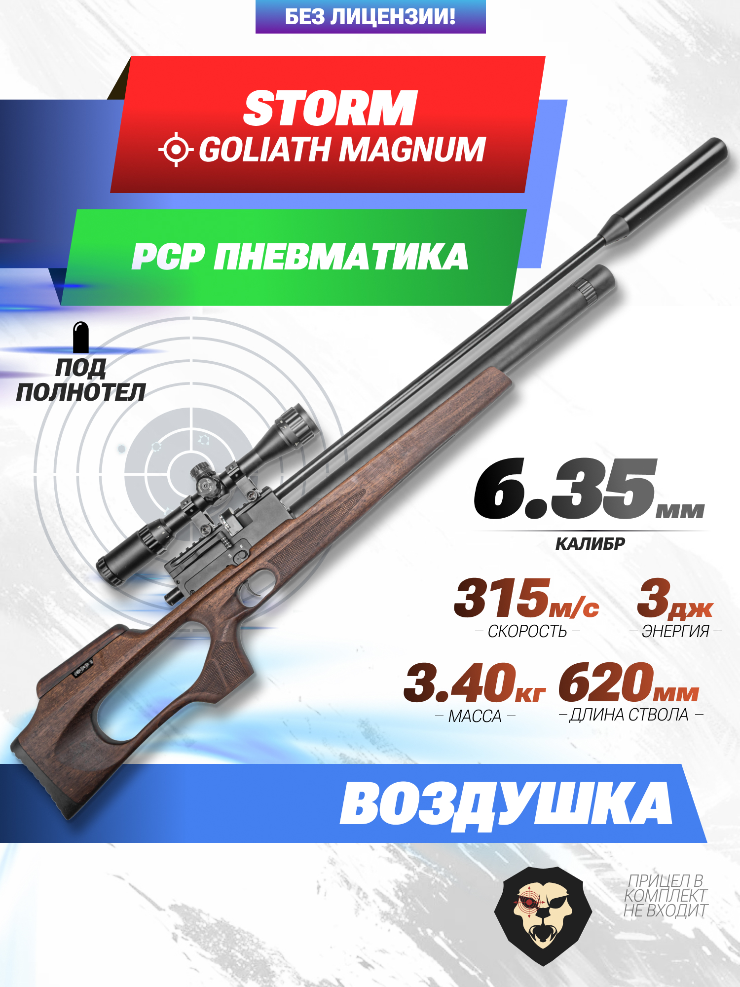 Информация о товаре "Пневматическая винтовка Storm Goliath Magnum 6.35 мм (полнотел, 620 мм, PCP)" носит ознакомительный характер, и не является публичной офертой, определяемой положениями Статьи 437 Гражданского кодекса Российской Федерации, характеристики, внешний вид, цвет и комплектация могут быть изменены производителем без уведомления.