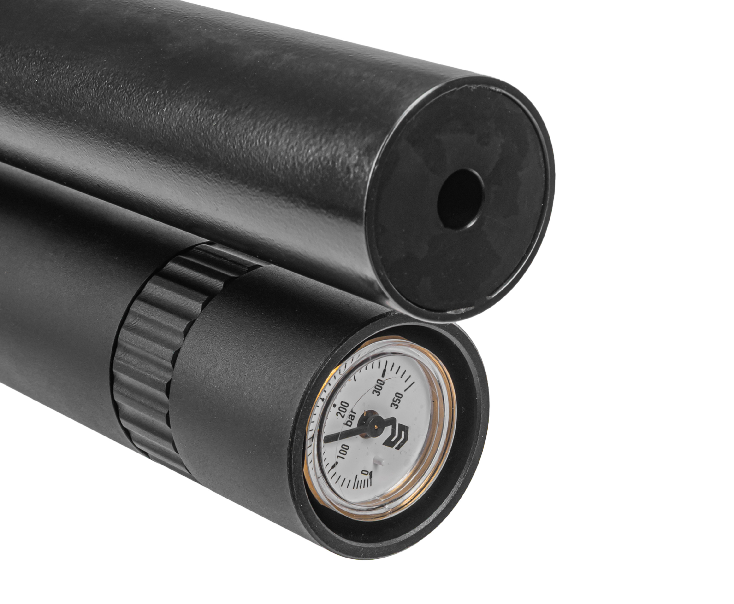 Его объем при этом составляет 310 кубических сантиметров, что больше, чем у большинства альтернативных моделей на рынке в той же ценовой категории. Хранилище заправляется газом при помощи подключаемых насосов ВД - совместимость компрессорного оборудования с разъемом на корпусе обеспечивает штуцер, входящий в комплектацию. Текущее давление, в свою очередь, отслеживается встроенным манометром.