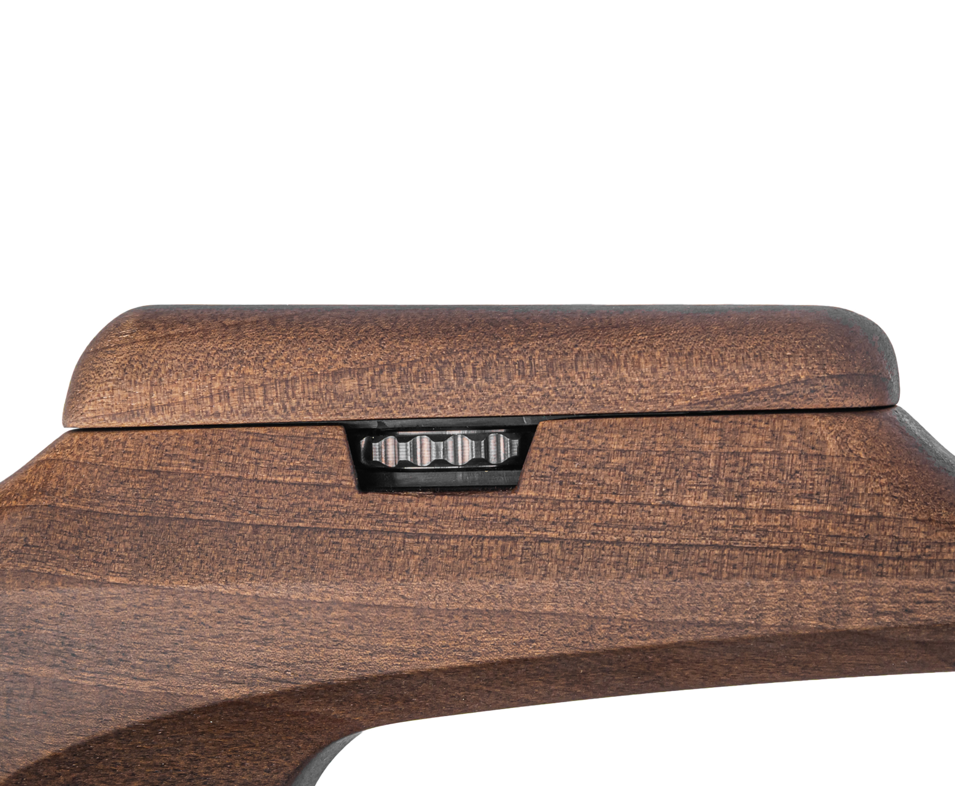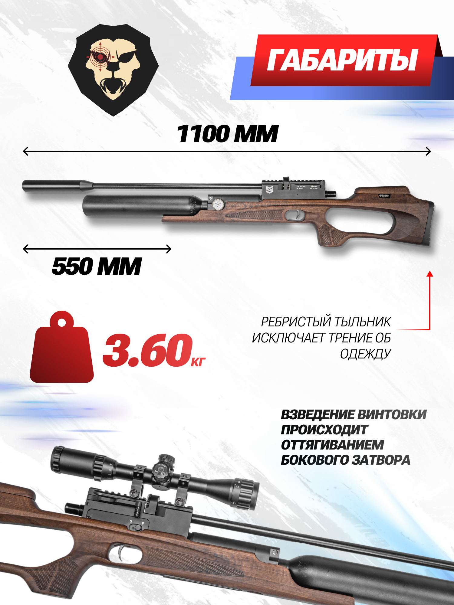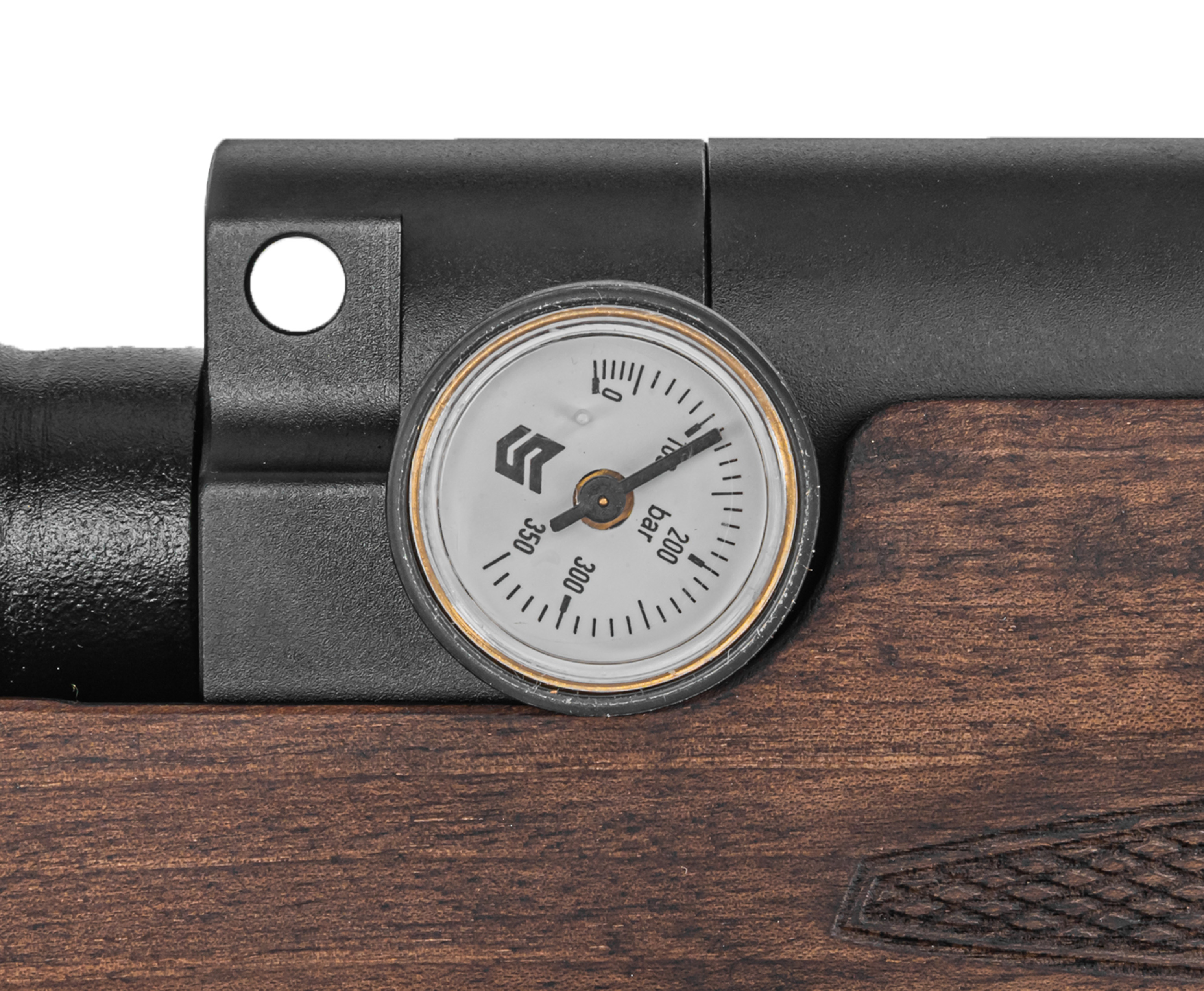 Максимальное рабочее давление в системе при этом составляет 300 Бар. С правой стороны у основания резервуара встроен датчик - манометр с информативной шкалой позволяет вести оперативный контроль текущей степени заполнения. Винтовка рассчитана на эксплуатацию в одиночном режиме с предварительного взведения при помощи рычага затвора.