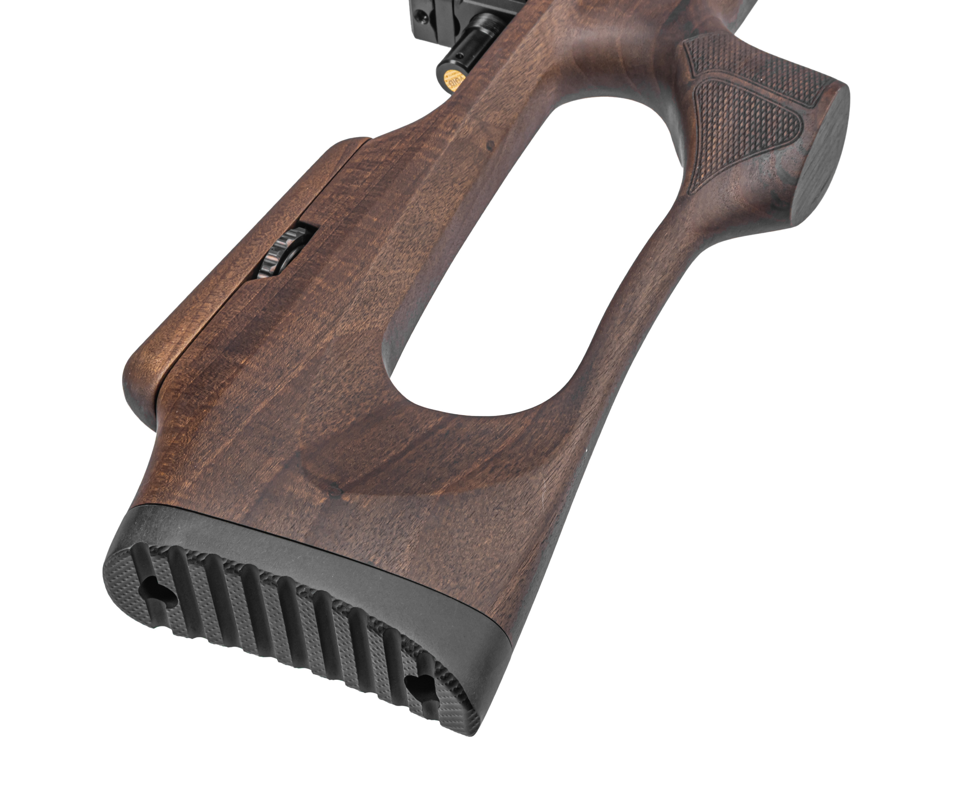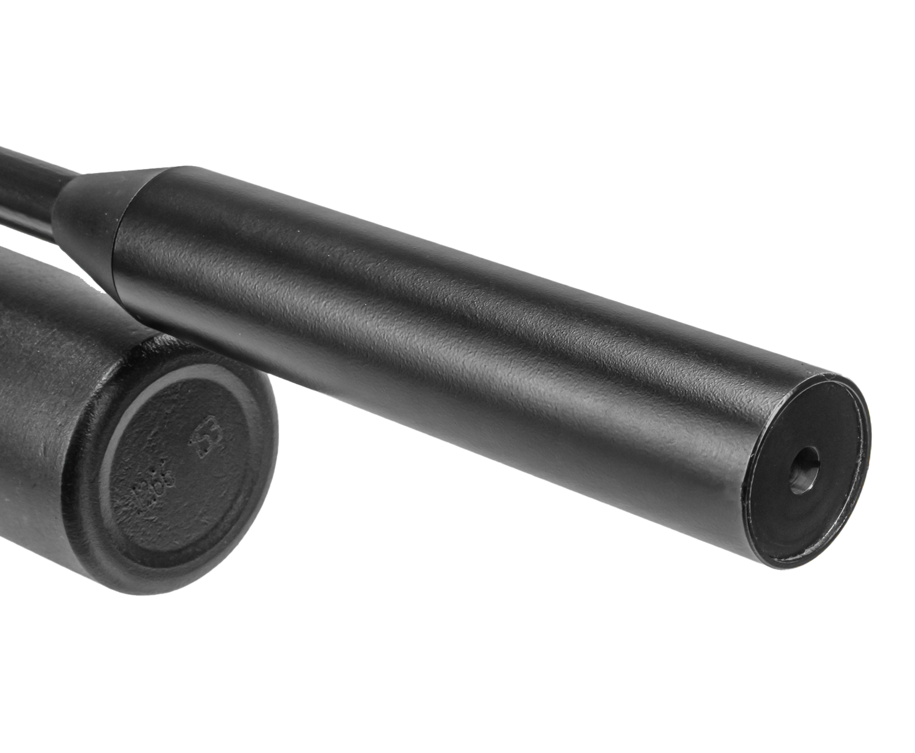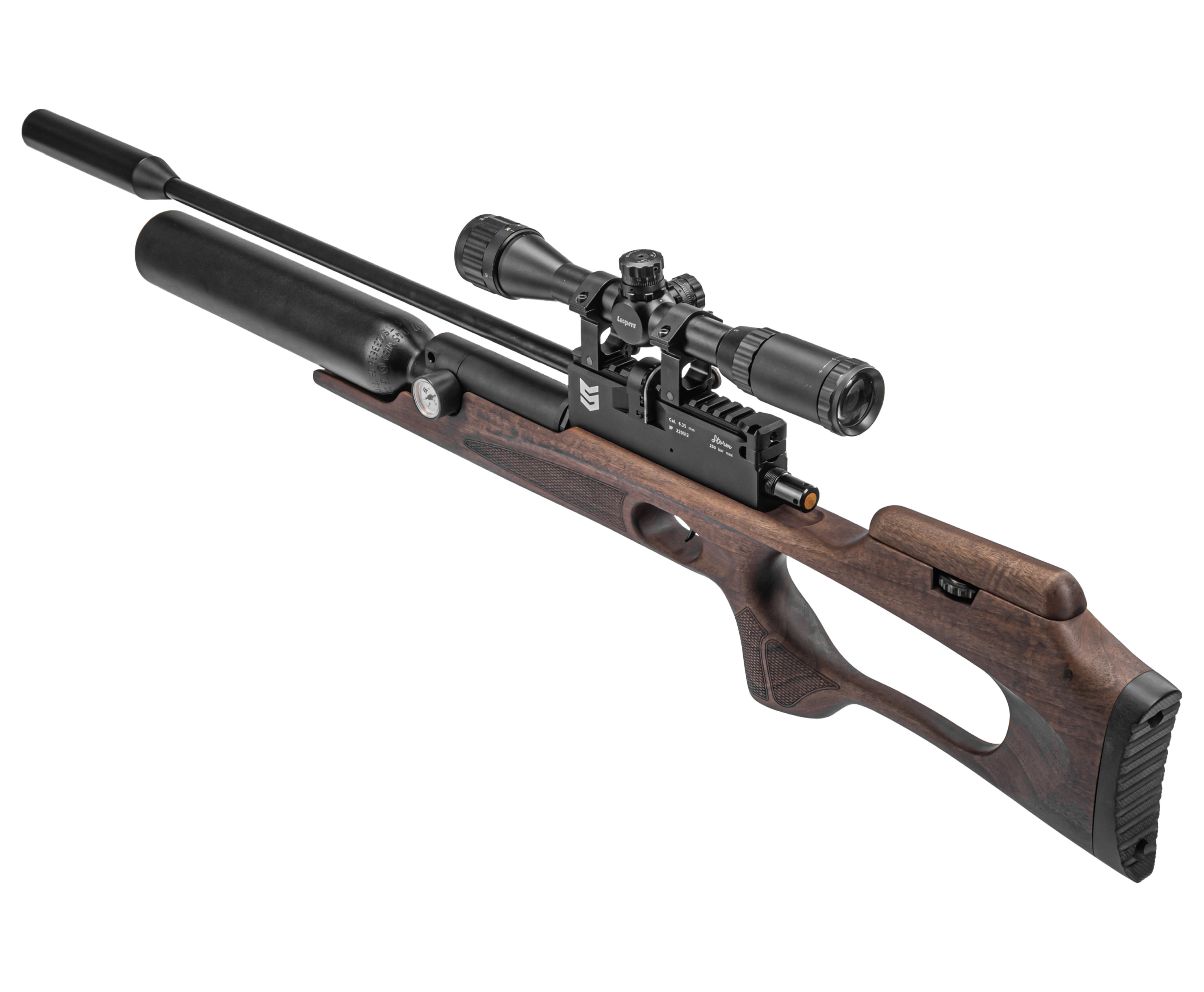 Максимальное рабочее давление в системе при этом составляет 300 Бар. С правой стороны у основания резервуара встроен датчик - манометр с информативной шкалой позволяет вести оперативный контроль текущей степени заполнения. Винтовка рассчитана на эксплуатацию в одиночном режиме с предварительного взведения при помощи рычага затвора.