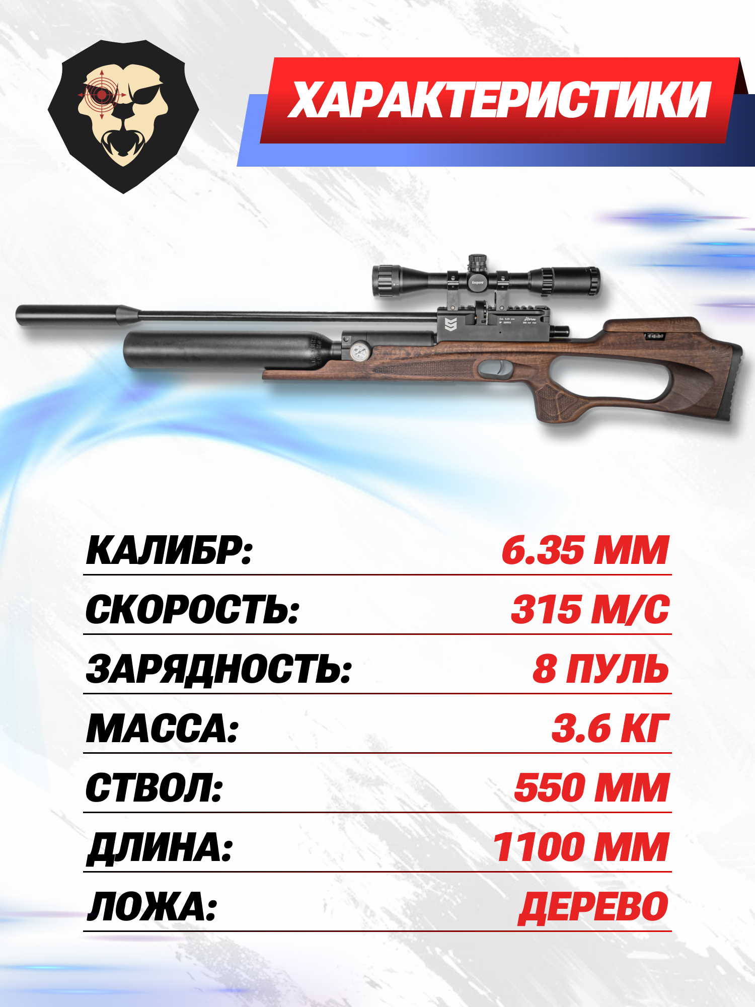 Таким образом, пневматика выделяется не только высокой точностью, но и бесшумной работой. Вдобавок к этому заложенный в конструкцию потенциал мощности дает вести эффективную стрельбу полнотелыми пулями. Карабин предусматривает заряжание боеприпасов калибром 6.35 мм - для этого в комплекте идет барабанный магазин на 8 мест.