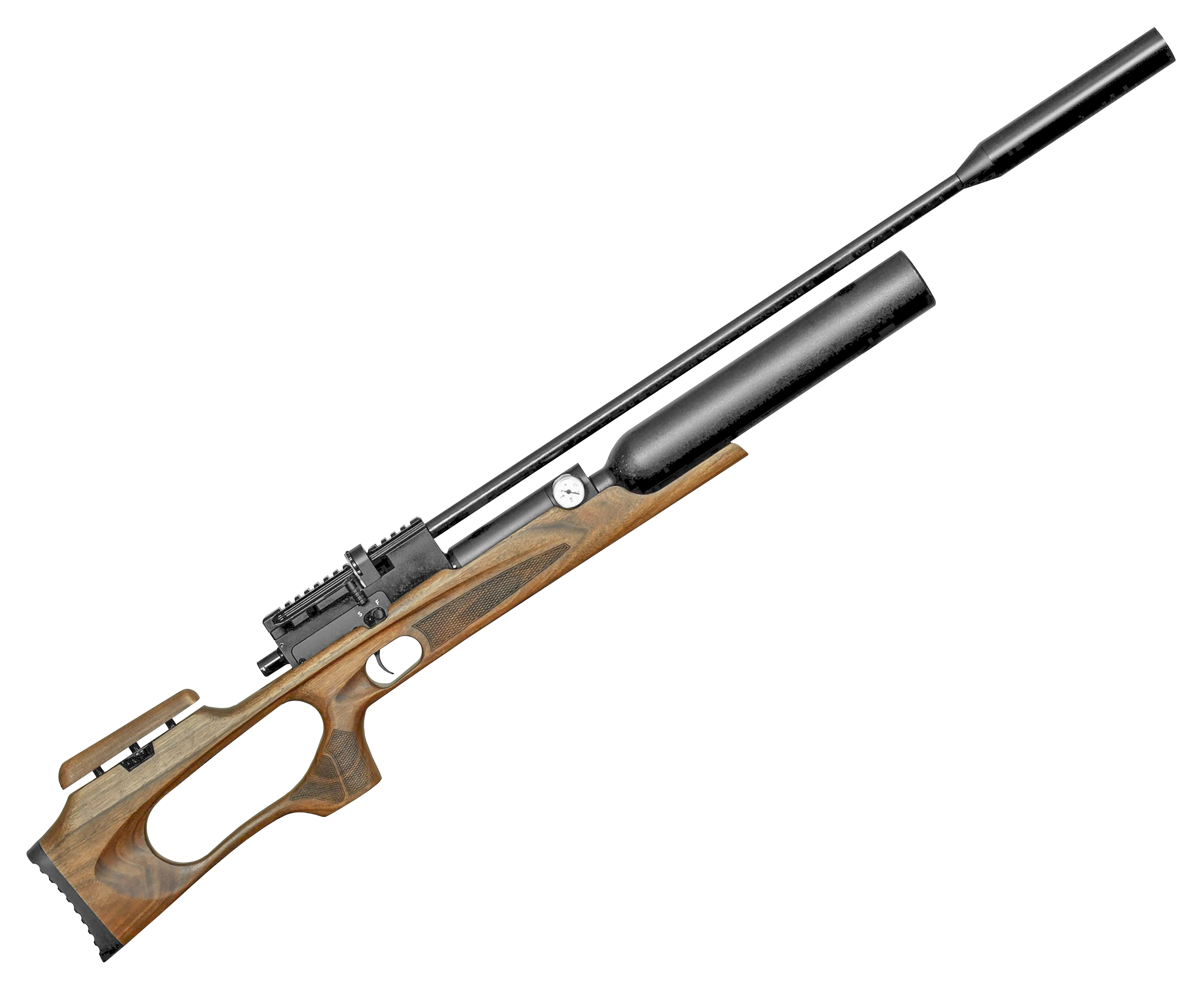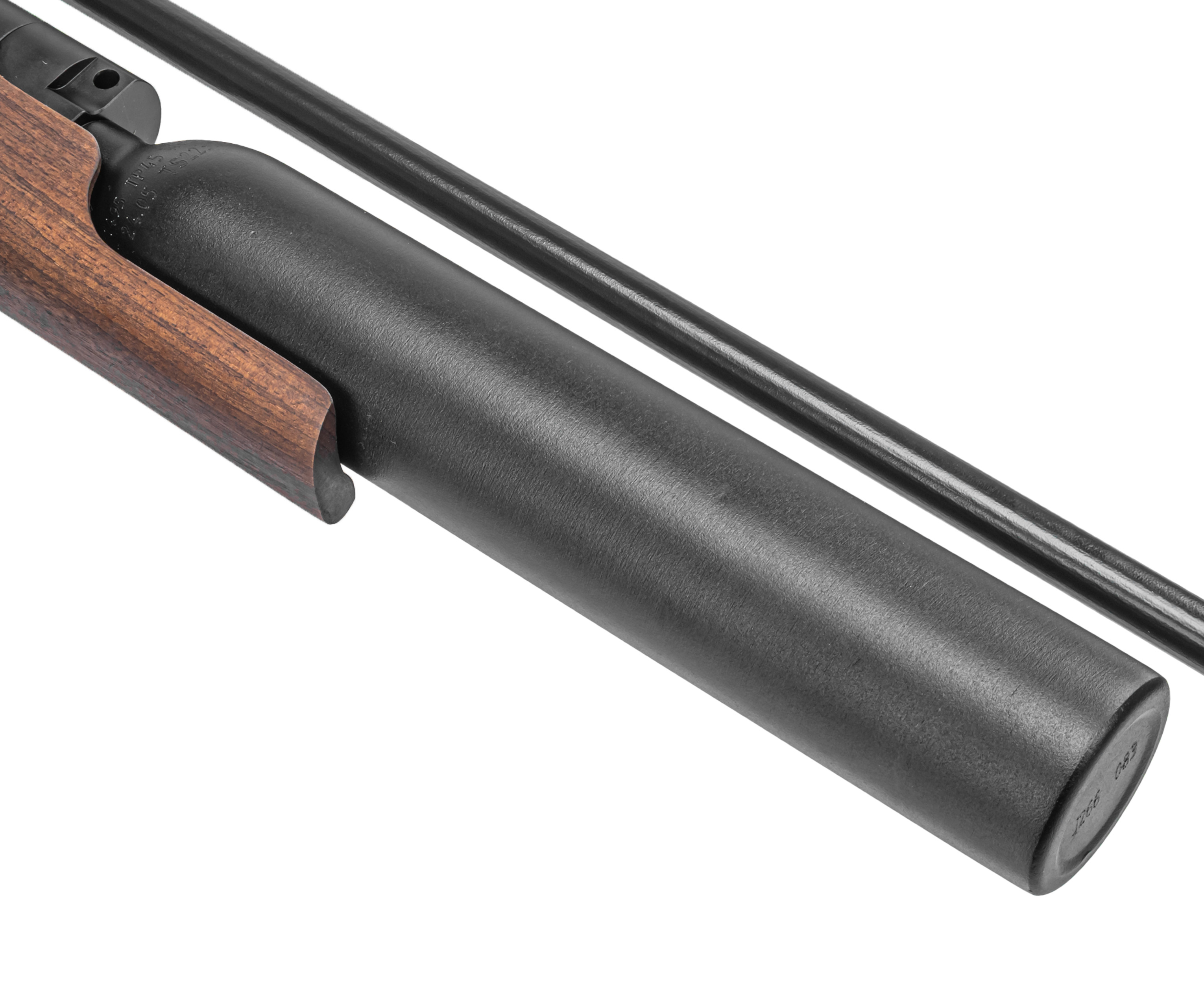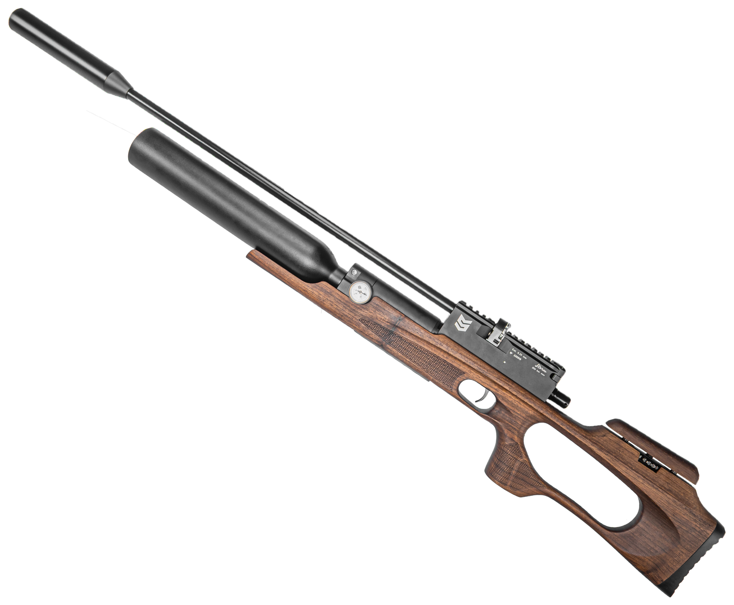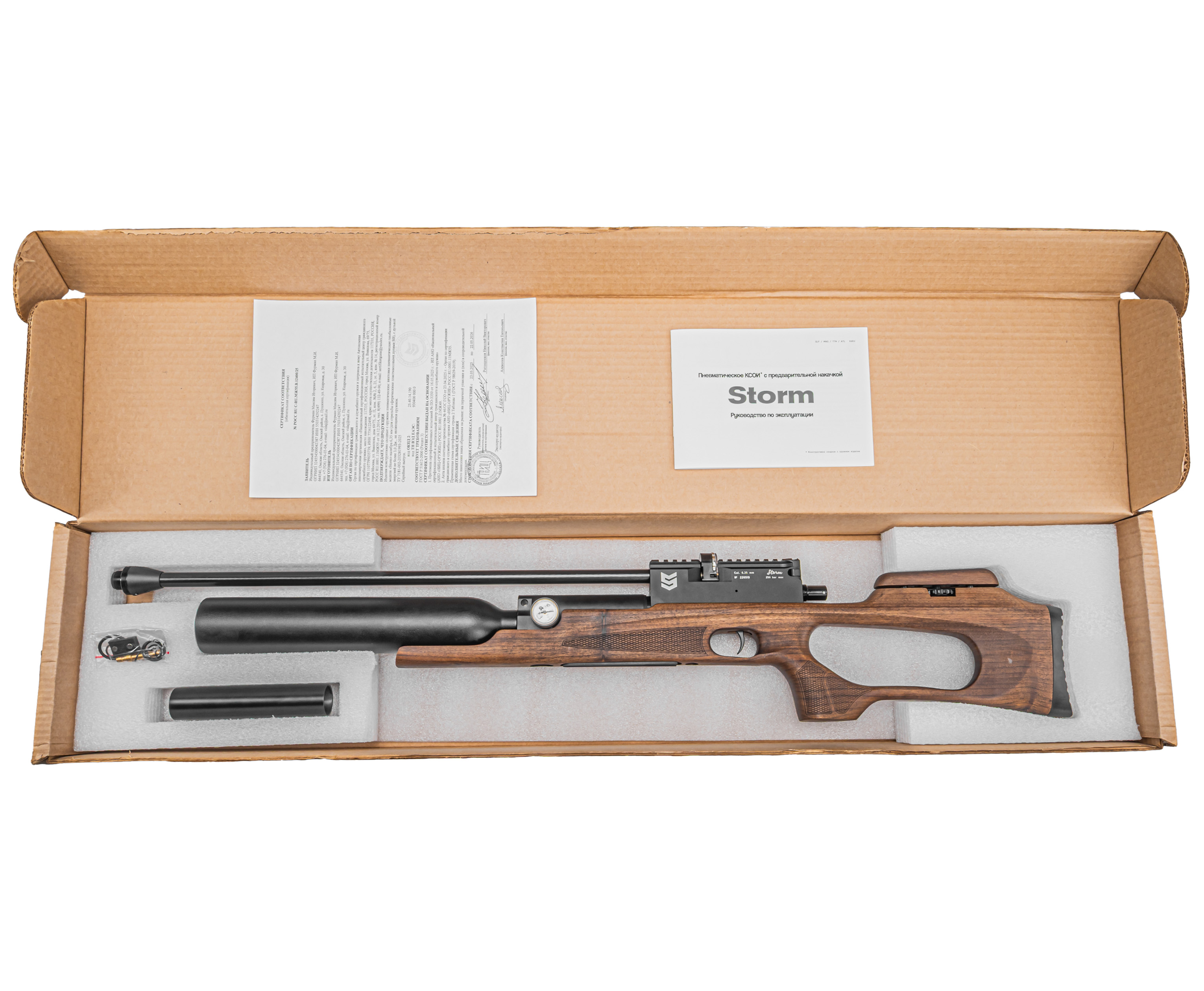 Для работы с полнотелом также требуется увеличенный запас сжатого воздуха, без чего сложно добиться автономности оружия. В этой модификации пневматическая винтовка Шторм 6.35 мм получила колбовый резервуар, отличающийся от линейного вдвое большей емкостью - размер пространство для закачки газа повысился до 500 кубических см, а работает узел в прямоточном режиме. Заправку рассматриваемого баллона производят посредством ВД оборудования в виде насоса, электрического компрессора или предварительно наполненного баллона - подключение выполняют через штуцер, а проследить за процессом можно с помощью манометра.