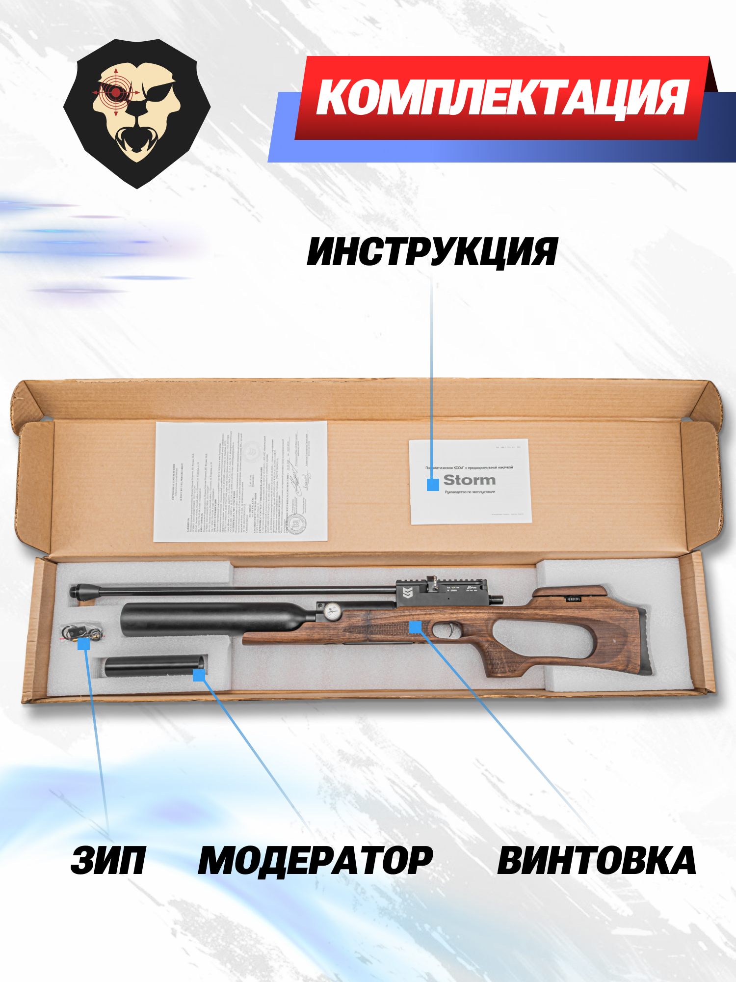 | Комплектация | Винтовка, заправочный штуцер, магазин, антибздун, пульный лоток, комплект РТИ, упаковка, краткая документация, копия сертификата (по запросу покупателя) |