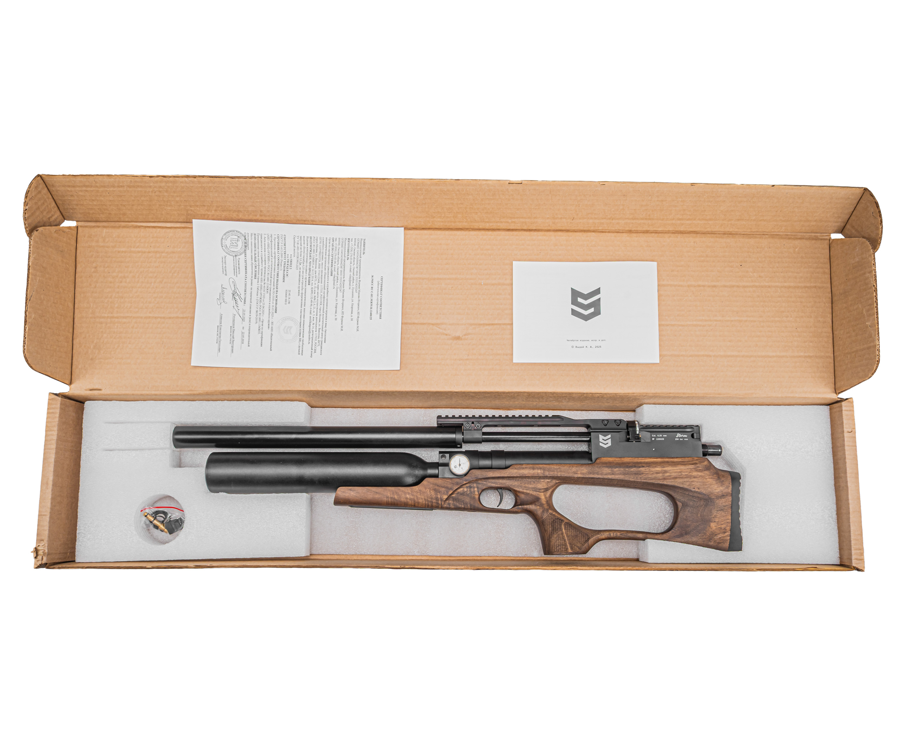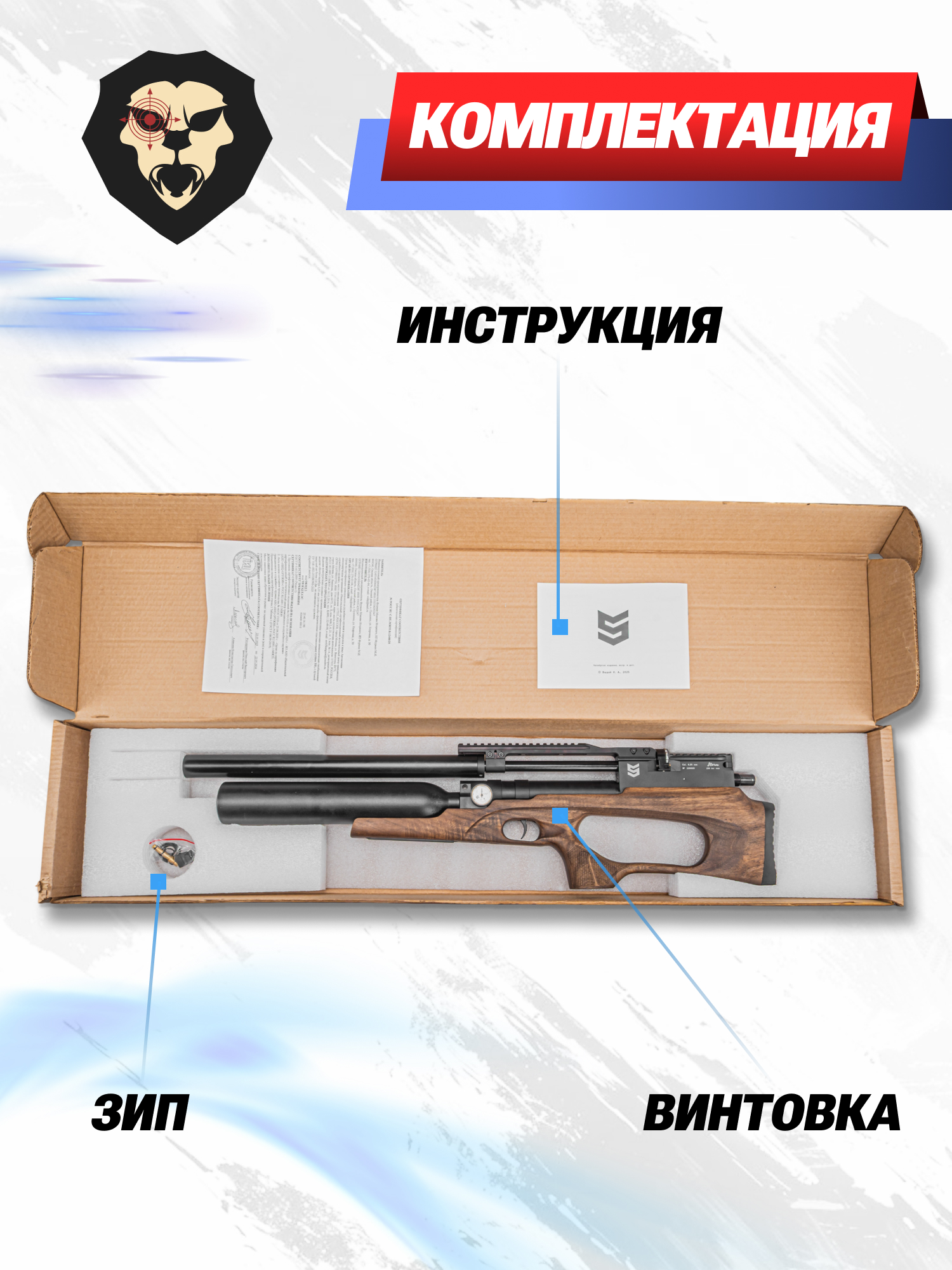 | Комплектация | Винтовка, заправочный штуцер, магазин, антибздун, пульный лоток, комплект РТИ, упаковка, краткая документация, копия сертификата (по запросу покупателя) |
