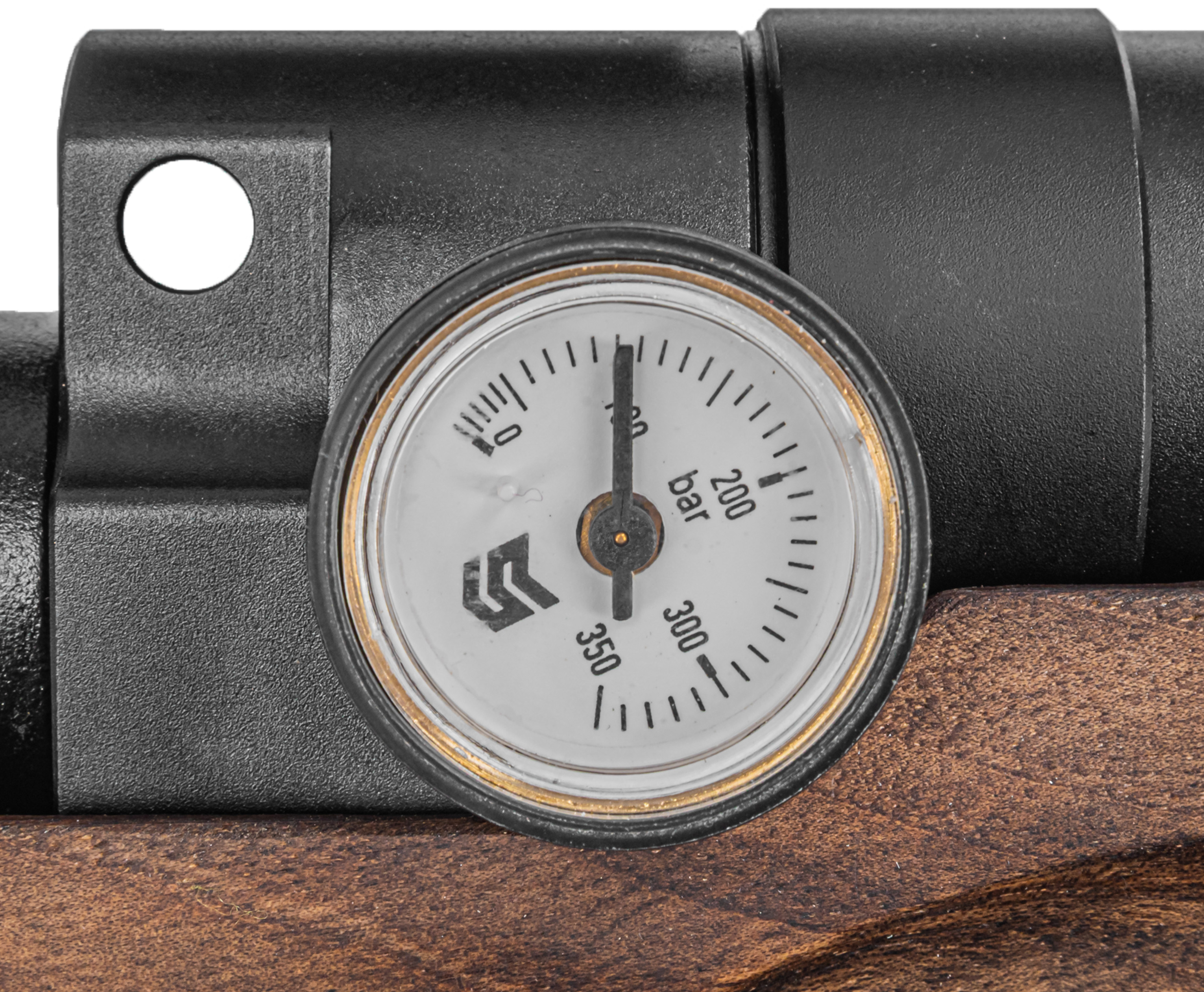 В обозреваемом исполнении винтовка Titan характеризуется прямоточным устройством, то есть газ из резервуара при нажатии на триггер поступает через клапан сразу в ствол. Верхний порог рабочего давления, при котором заявлена штатная эксплуатация изделия, составляет 300 Бар. Накачка выполняется насосами ВД, подсоединяемыми к разъему на корпусе через штуцер - в цевье при этом интегрирован манометр для отслеживания текущего состояния системы.