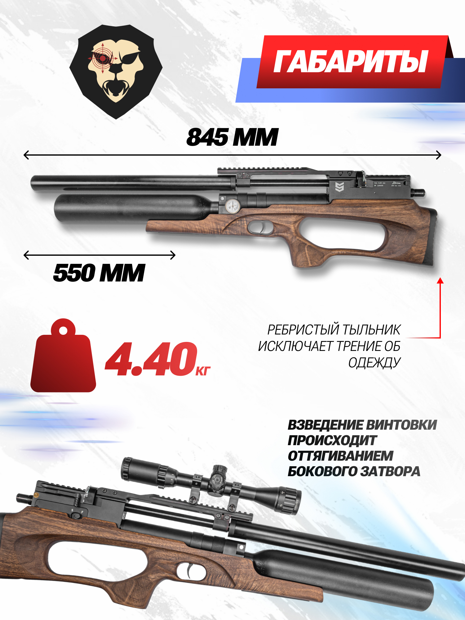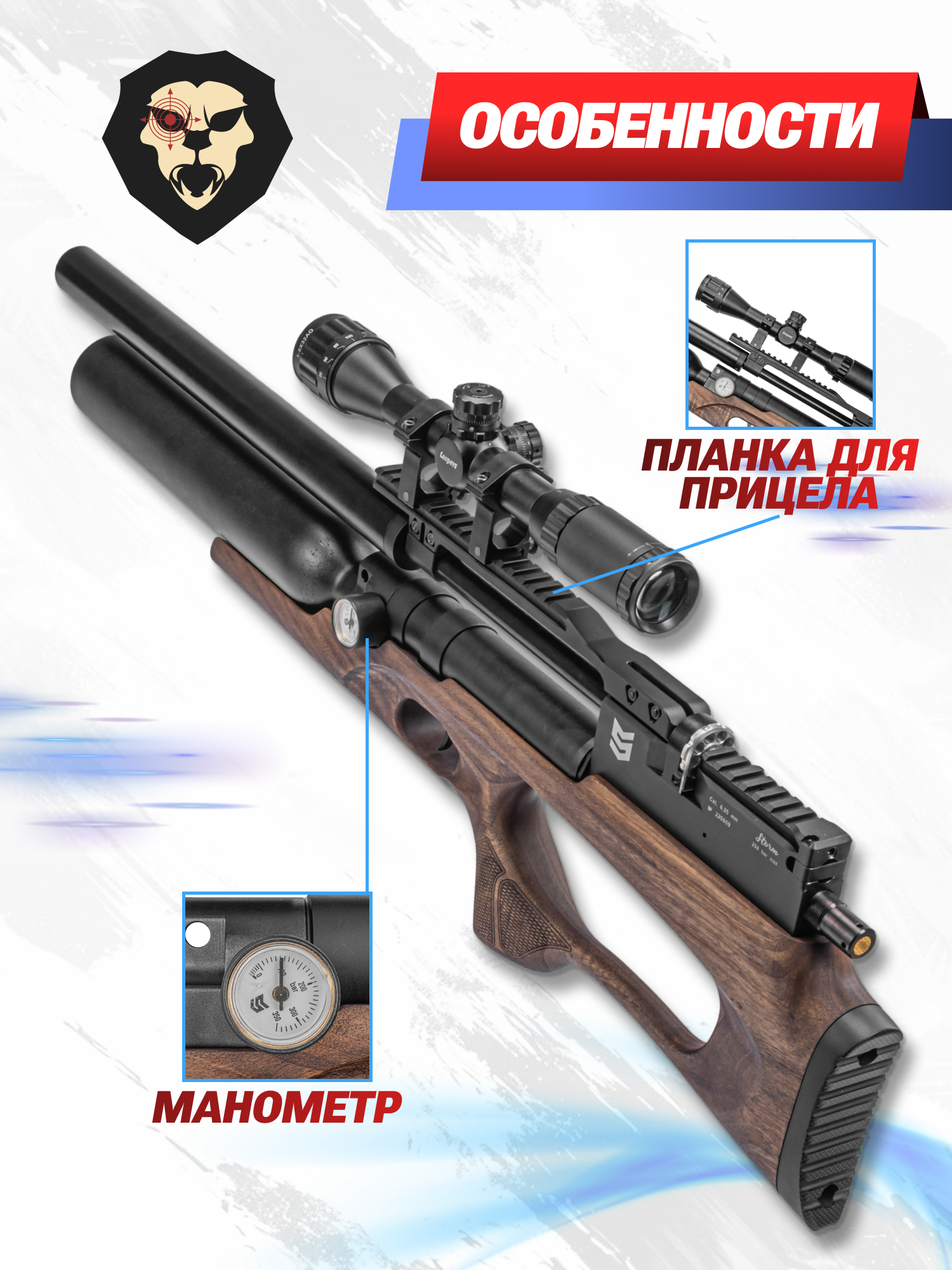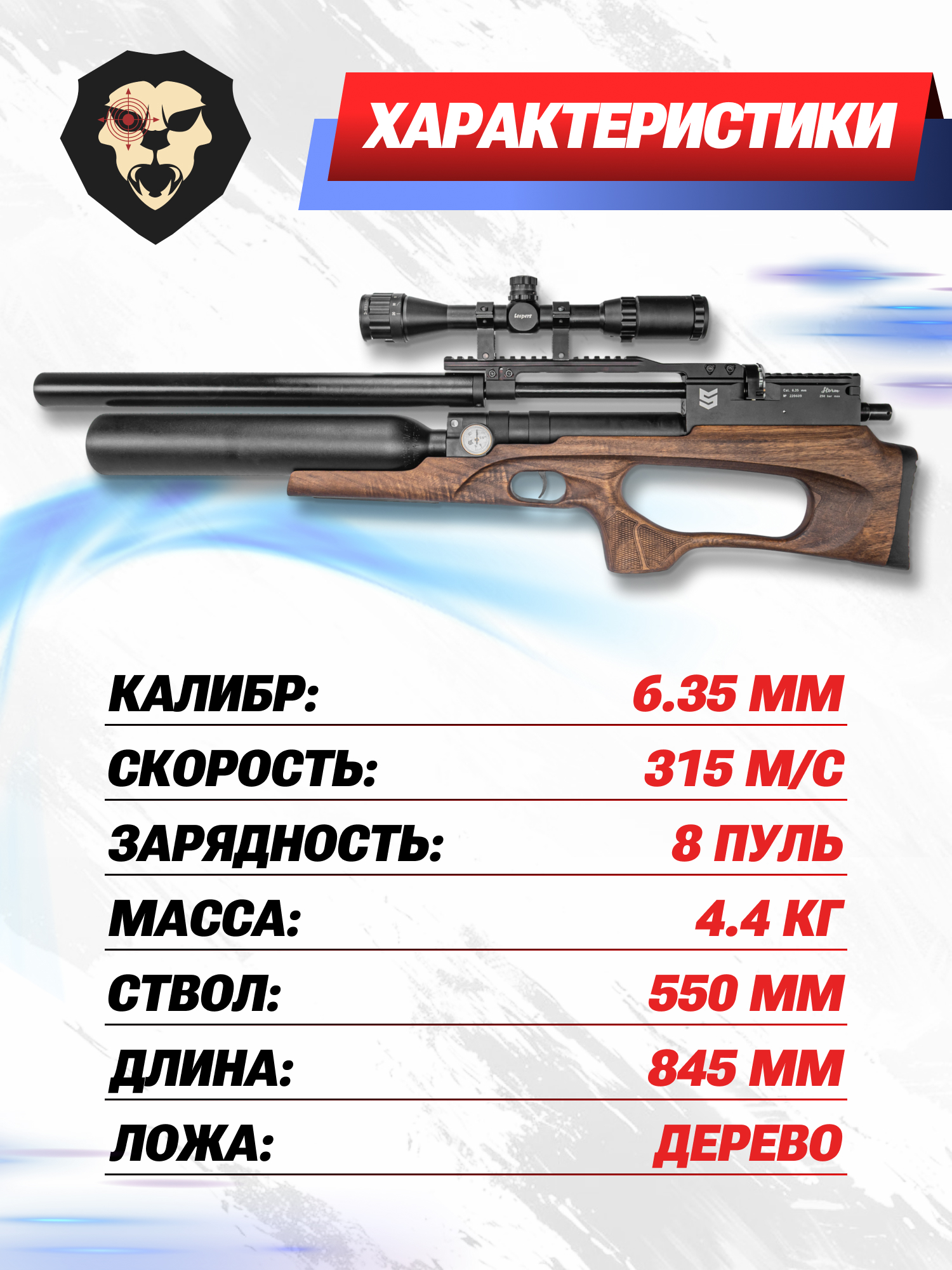 Для наведения рекомендуется дооснастить винтовку оптикой. Докупаемый отдельно прицел желаемой кратности устанавливается на кронштейн с посадочным интерфейсом Weaver 22 мм. При прочих достоинствах пневматика характеризуется привлекательным дизайном и обладает ложей из натурального дерева - с учетом материала вес оружия не превышает 4.4 кг при общей длине конструкции 845 миллиметров.