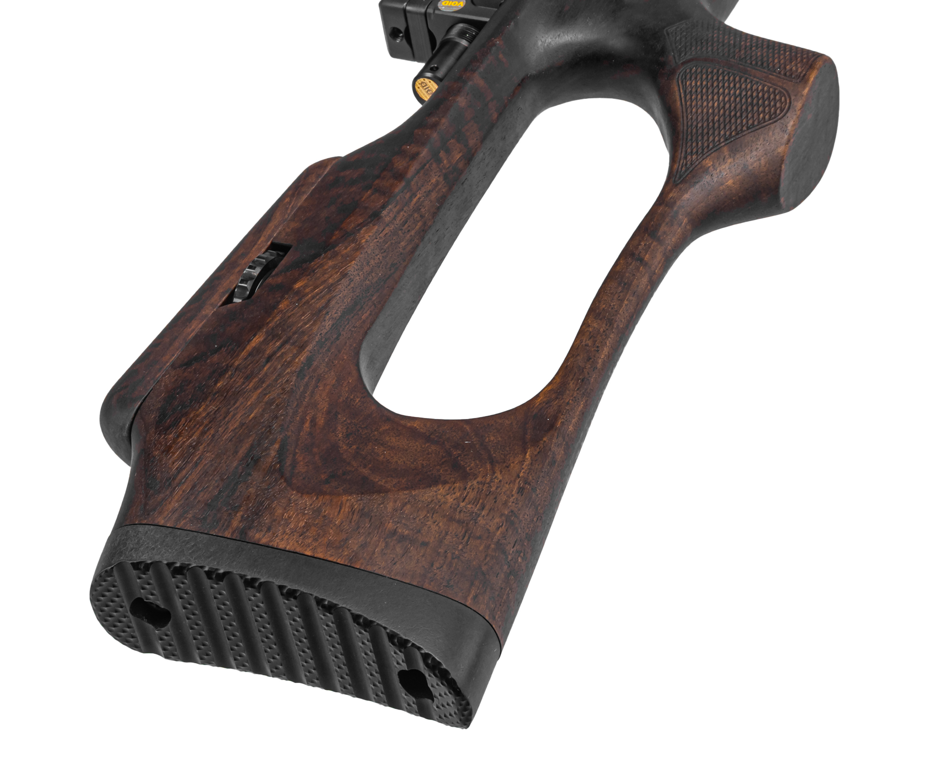 Это проявляется не только в компоновке и длине ствола, но и типе установленного ресивера, от чего зависит максимальный объем накачки. Компания Шторм предлагает винтовки как со стандартным линейным хранилищем, так и колбой. Альтернативным баллоном на 550 кубических сантиметров оснащается рассматриваемый экземпляр Titan Sport с деревянной эргономичной ложей.