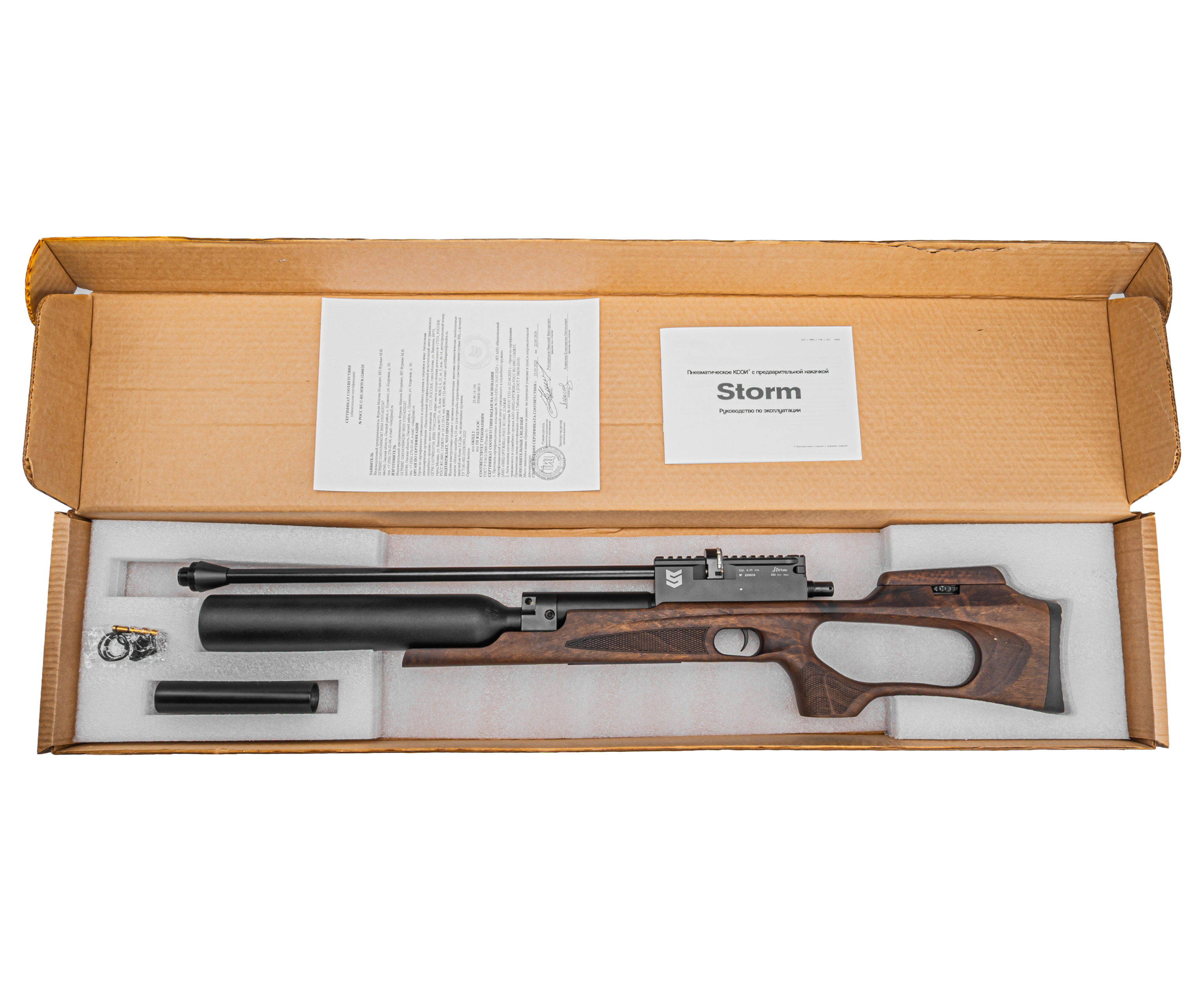 | Комплектация | Винтовка, заправочный штуцер, магазин, антибздун, пульный лоток, комплект РТИ, упаковка, краткая документация, копия сертификата (по запросу покупателя) |