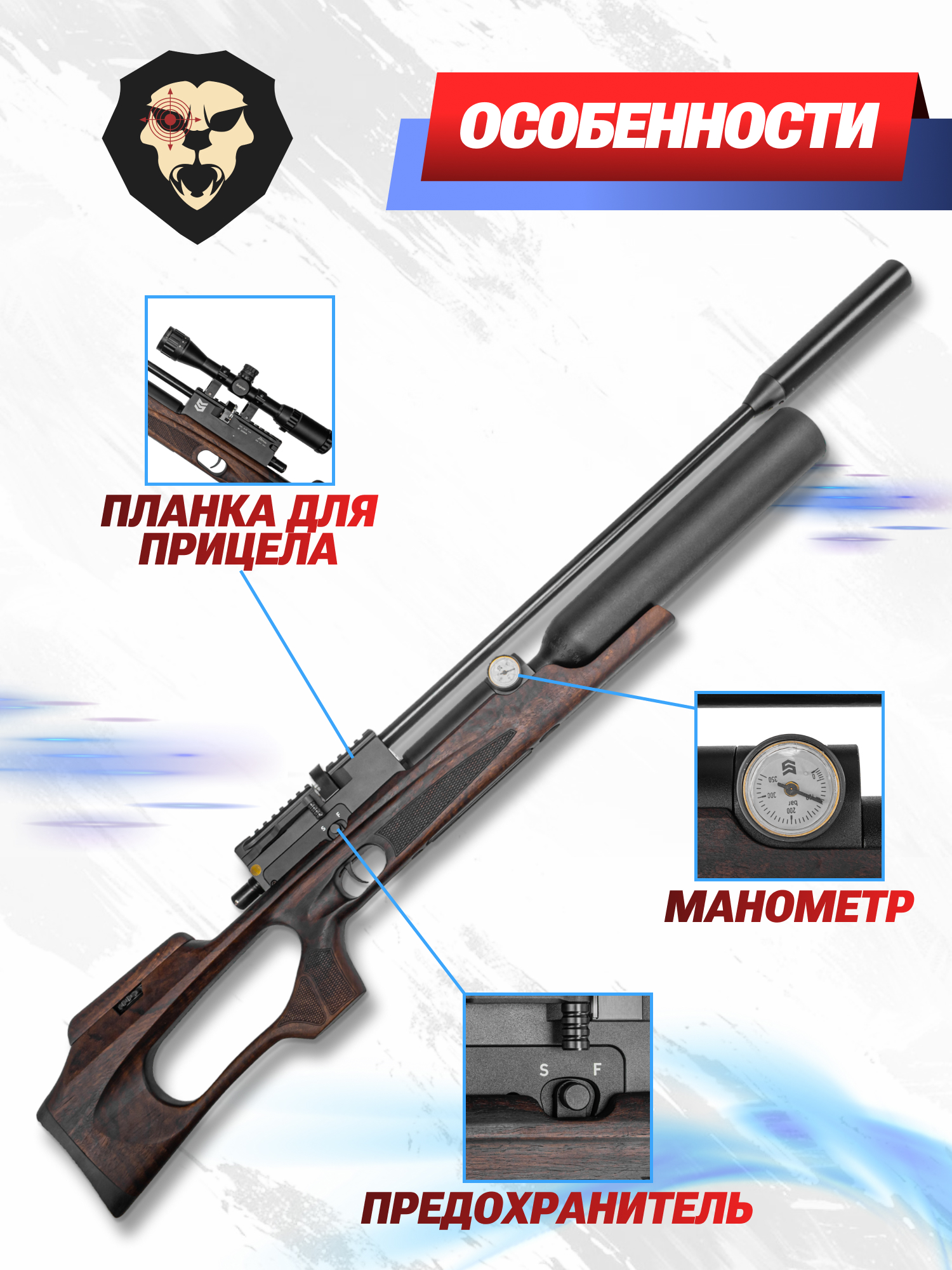 Степень накачки можно оперативно отследить при помощи шкалы бокового манометра, наклонив винтовку. Вдобавок модификация Титан Спорт оснащается редуктором - схема газораспределения, включающая указанный узел, подразумевает гибкую настройку в зависимости от предпочтений владельца. Так регулировкой давления пропускаемого в ствол воздуха достигается предсказуемая эксплуатация оружия, что положительно отражается на повторяемости выстрела.