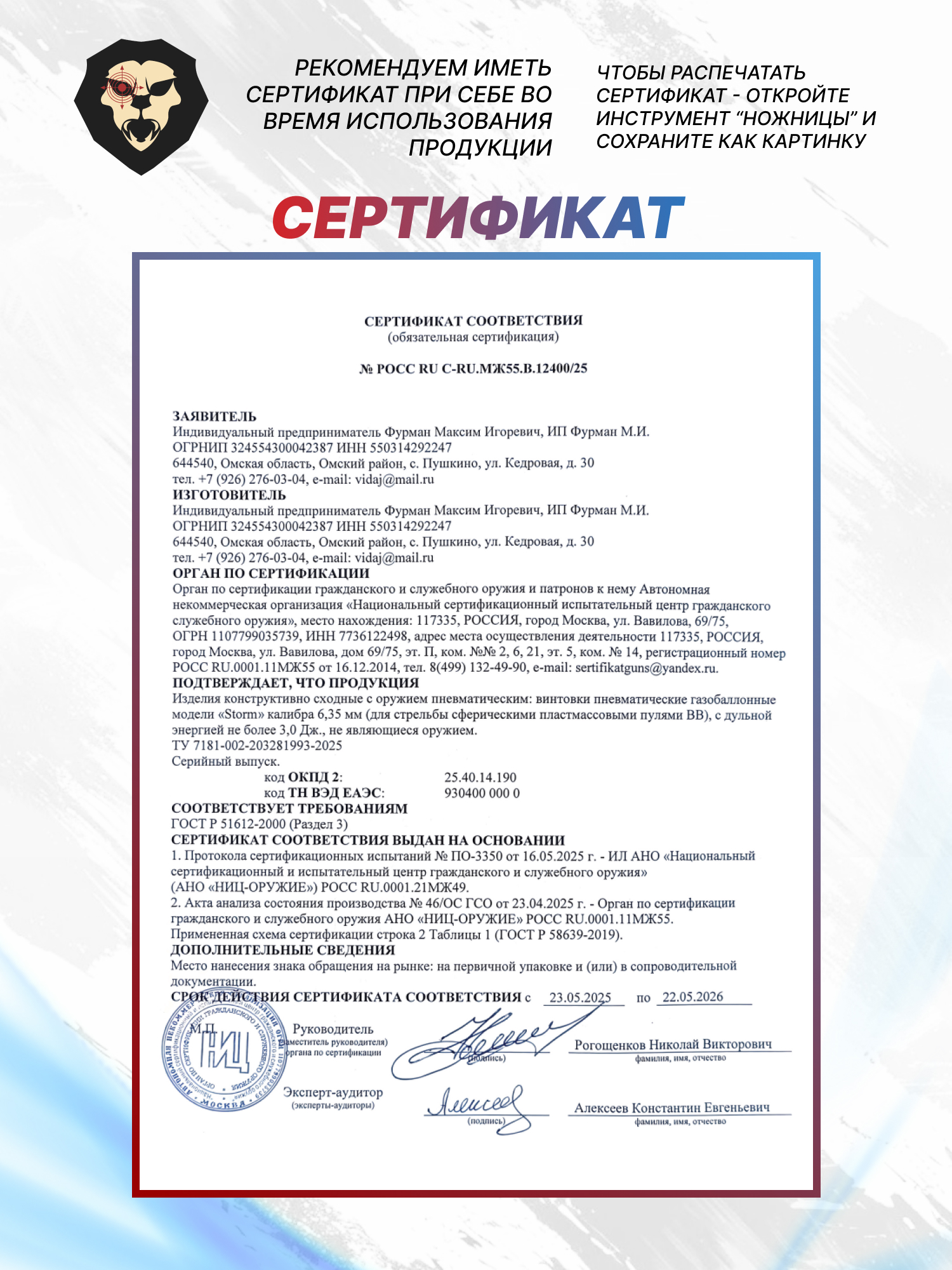 | Комплектация | Винтовка, заправочный штуцер, магазин, антибздун, пульный лоток, комплект РТИ, упаковка, краткая документация, копия сертификата (по запросу покупателя) |