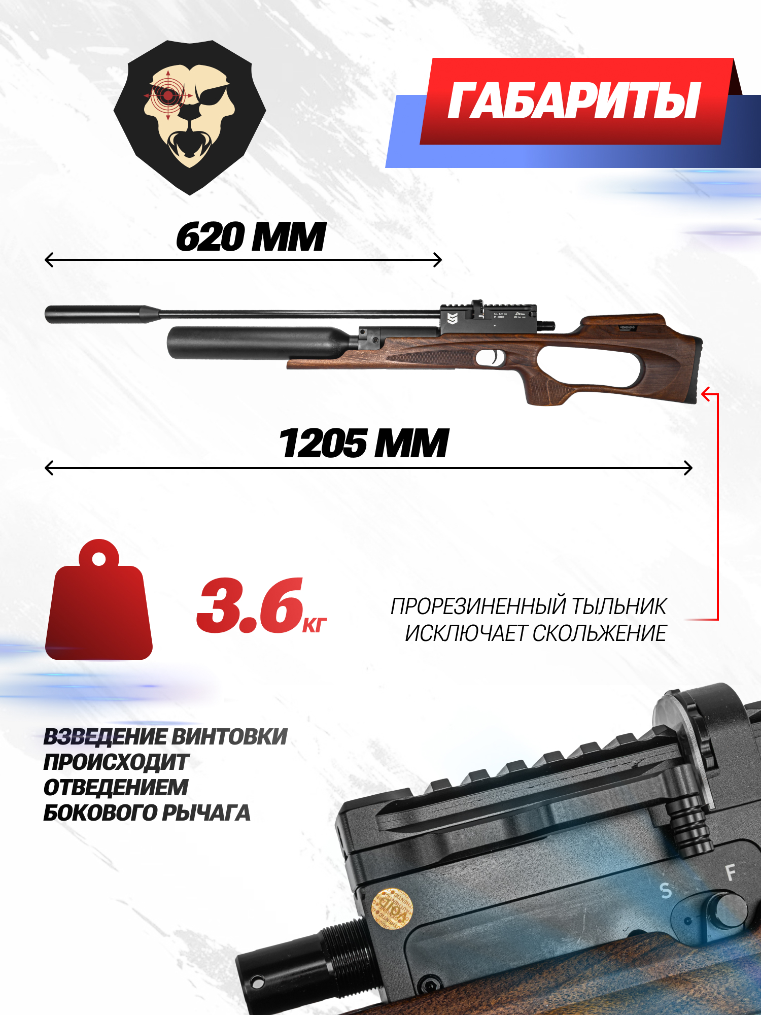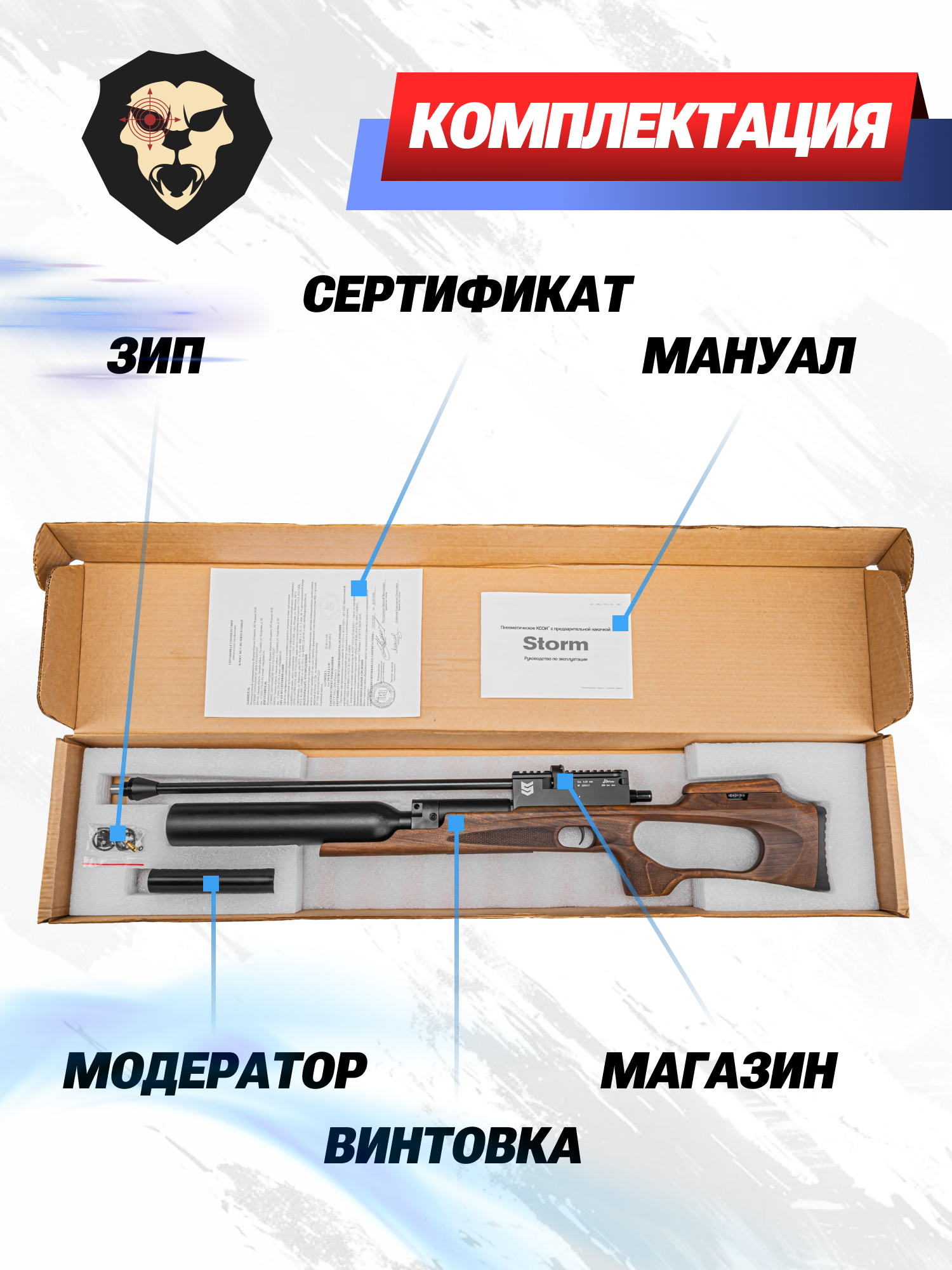 | Комплектация | Винтовка, заправочный штуцер, магазин, антибздун, пульный лоток, комплект РТИ, упаковка, краткая документация, копия сертификата (по запросу покупателя) |