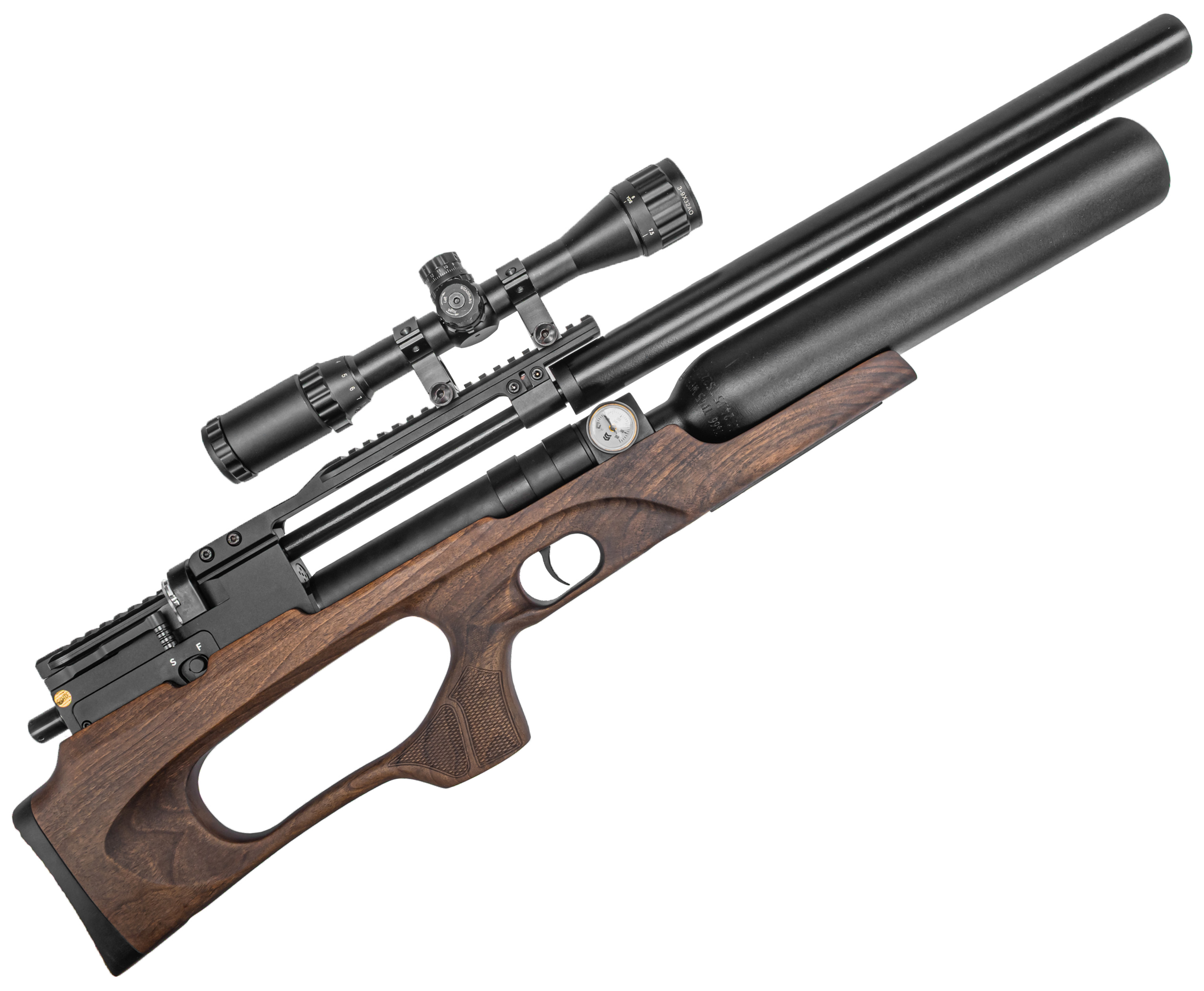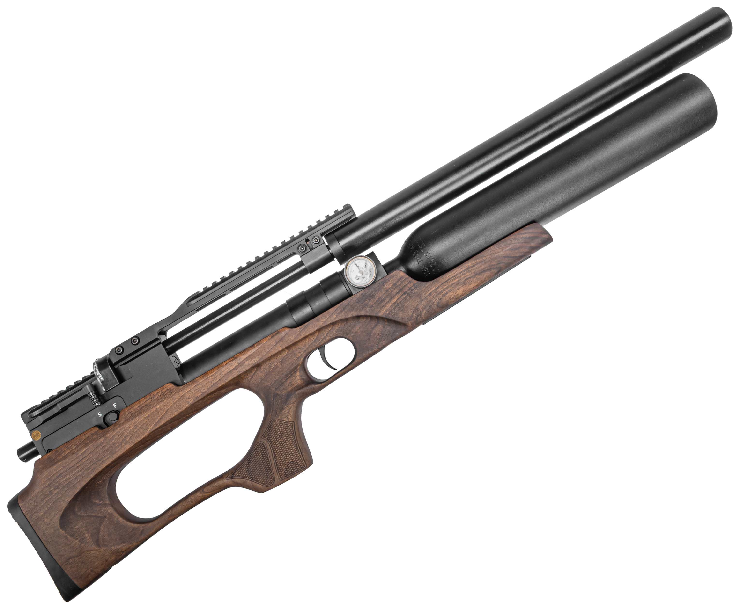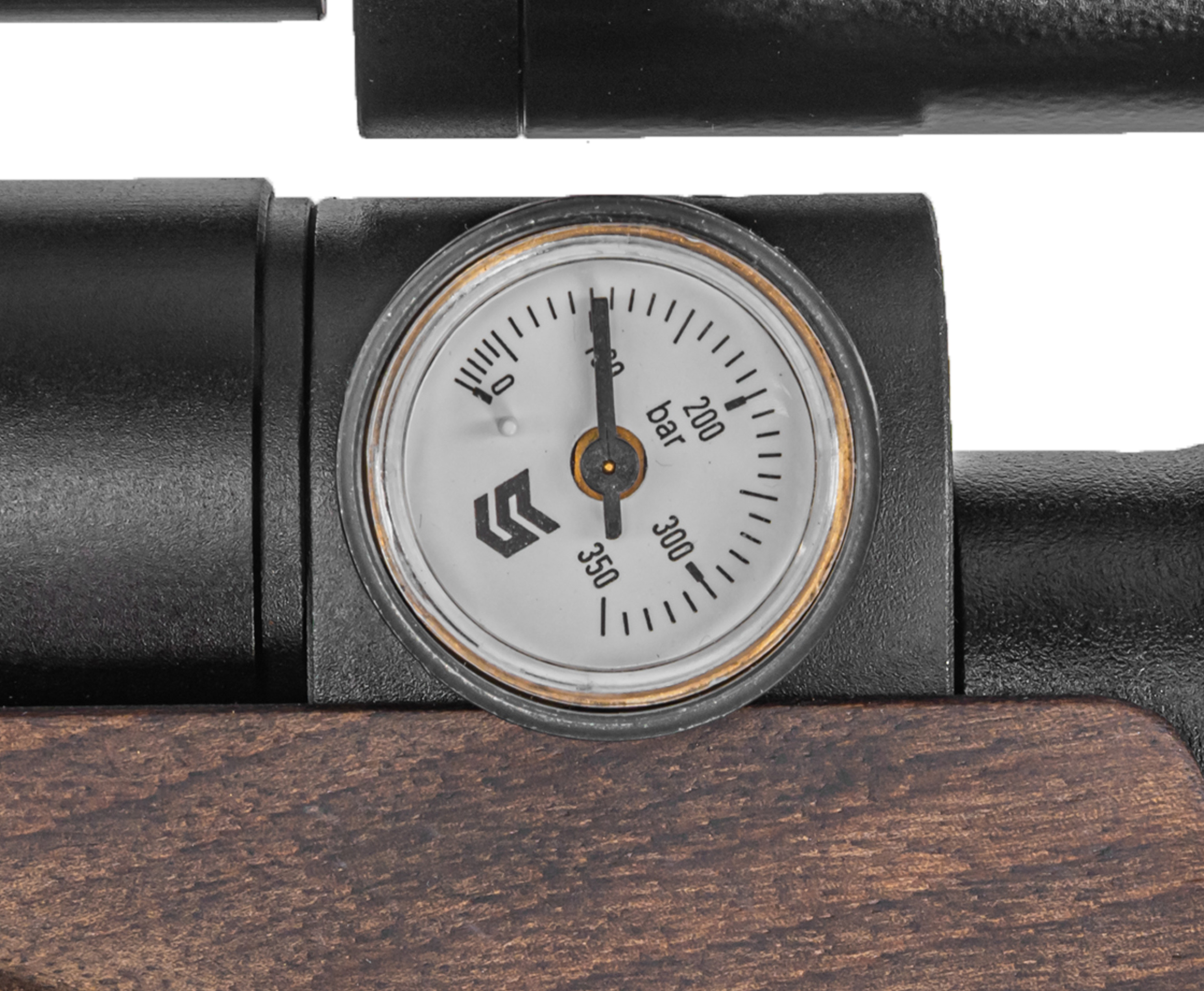 Рекомендованное максимальное давление в резервуаре составляет 300 Бар. Заправка осуществляется компрессором ВД, шланг которого подсоединяется к коннектору у основания колбы посредством комплектного штуцера. В цевье при этом вмонтирован манометр, позволяющий оперативно отслеживать текущую степень наполнения.