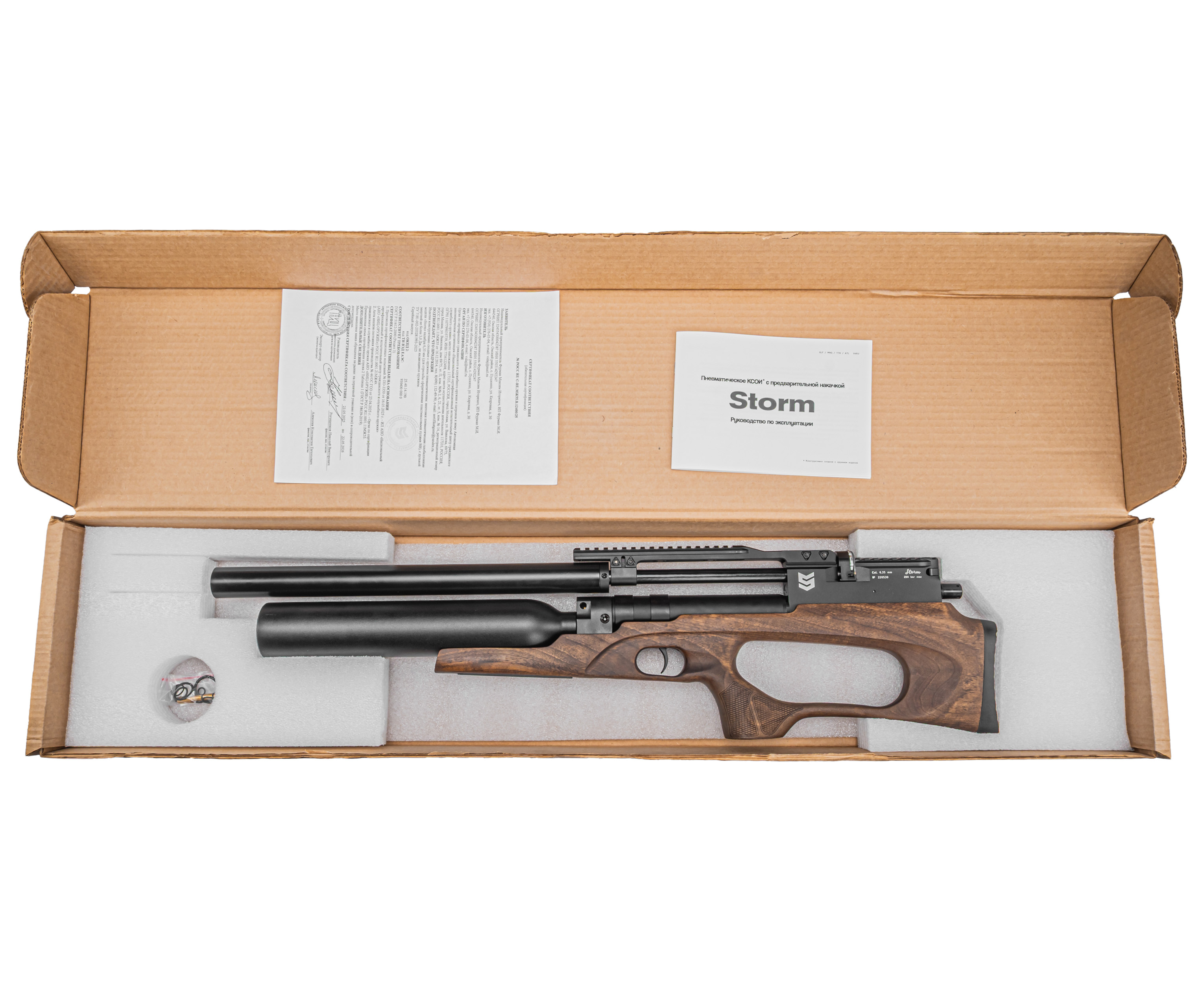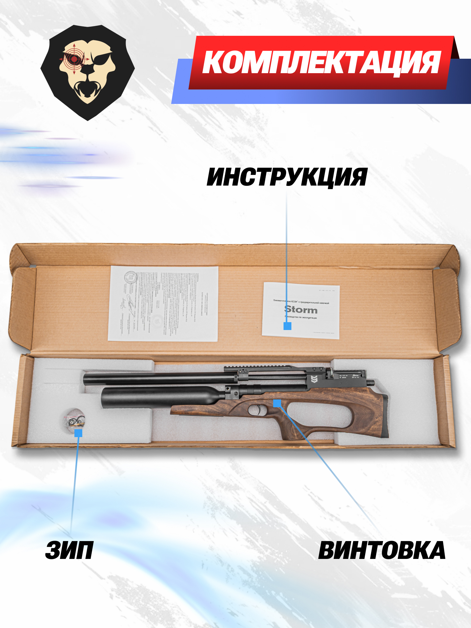 | Комплектация | Винтовка, заправочный штуцер, магазин, антибздун, пульный лоток, комплект РТИ, упаковка, краткая документация, копия сертификата (по запросу покупателя) |