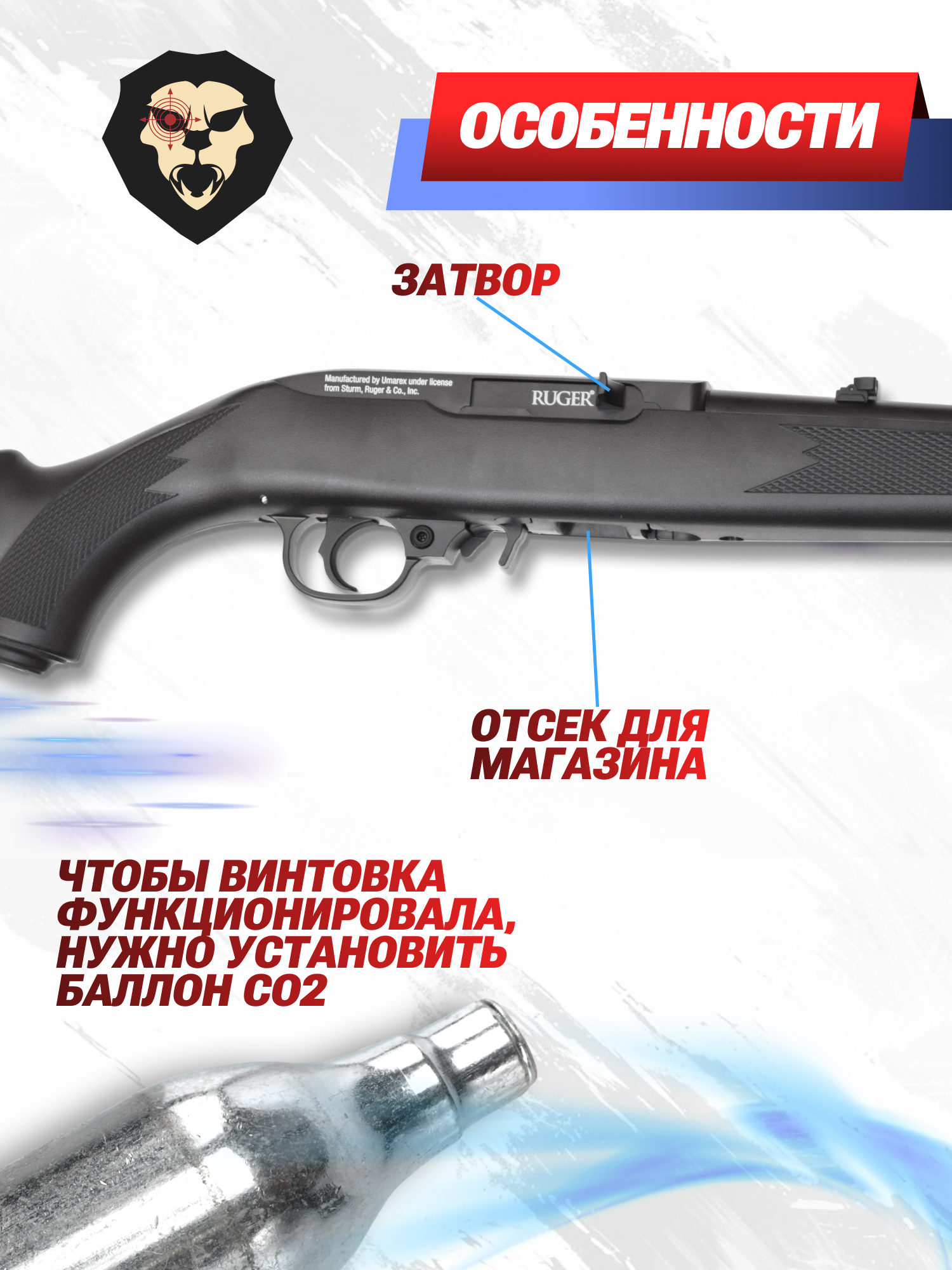 Во-вторых, резиновые соединения конструкции не вступают в контакт с углекислотой, а значит пневматическая винтовка Ruger 10 22 CO2 может находиться в заправленном состоянии неограниченное время.