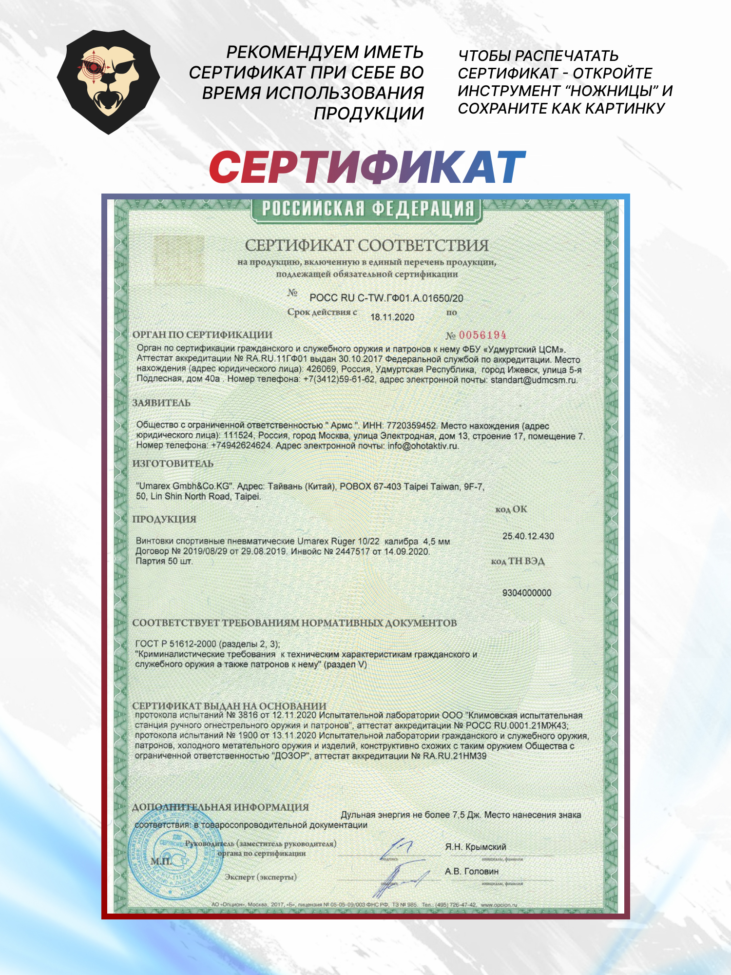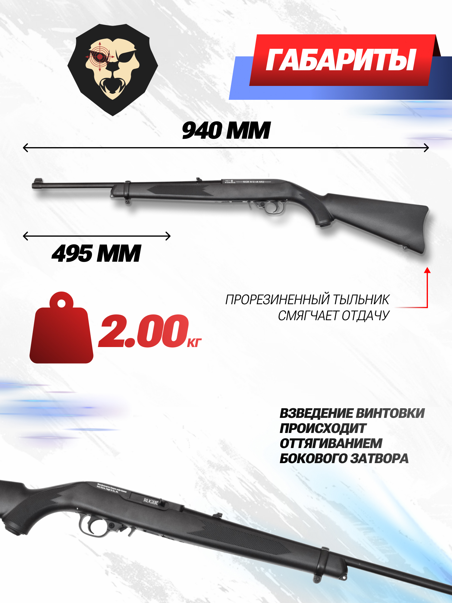 Информация о товаре "Пневматическая винтовка Umarex Ruger 10/22 4.5 мм" носит ознакомительный характер, и не является публичной офертой, определяемой положениями Статьи 437 Гражданского кодекса Российской Федерации, характеристики, внешний вид, цвет и комплектация могут быть изменены производителем без уведомления.