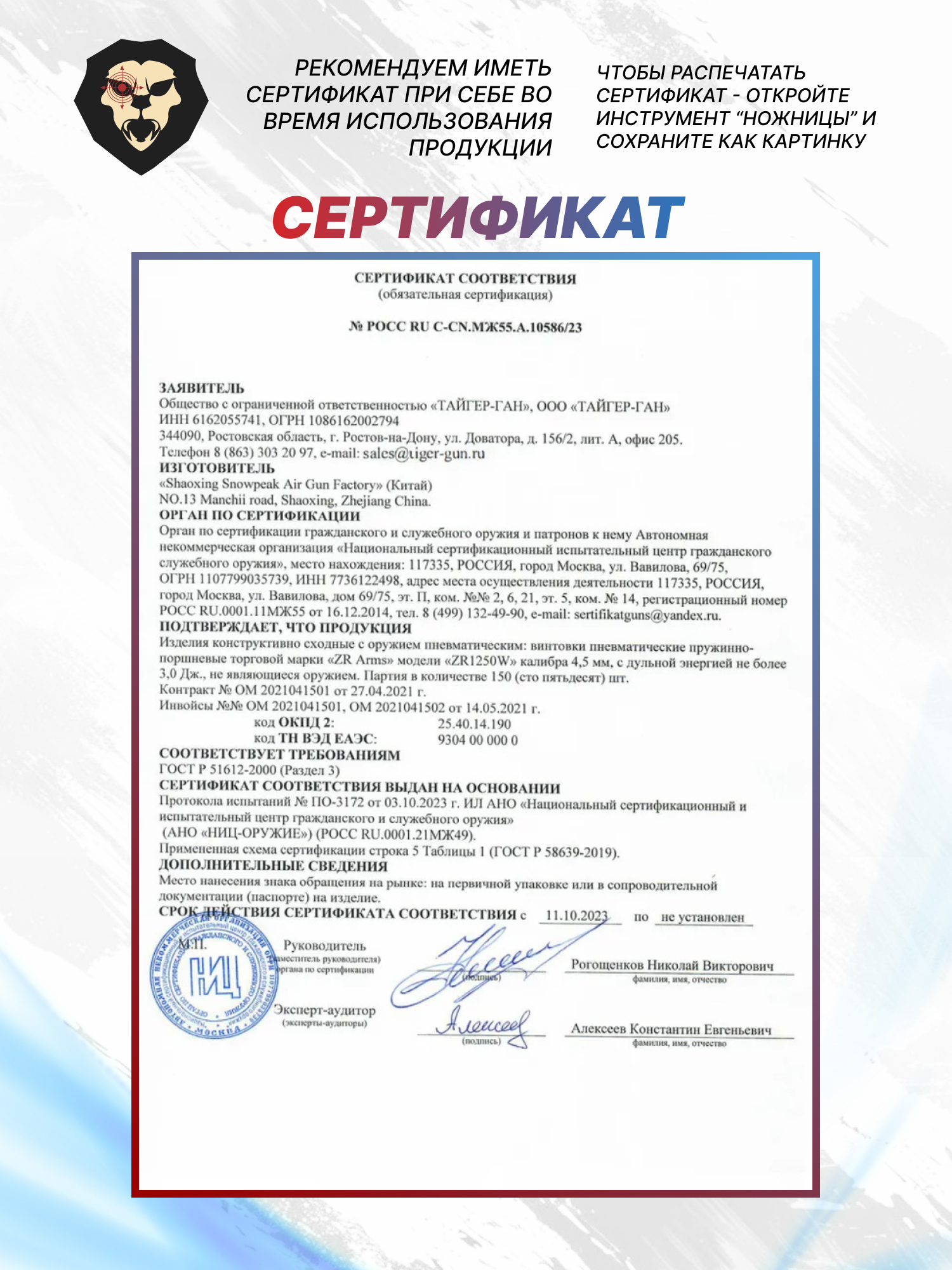 Информация о товаре "Пневматическая винтовка ZR Arms 1250W 4.5 мм (переломка, бук, 3 Дж)" носит ознакомительный характер, и не является публичной офертой, определяемой положениями Статьи 437 Гражданского кодекса Российской Федерации, характеристики, внешний вид, цвет и комплектация могут быть изменены производителем без уведомления.