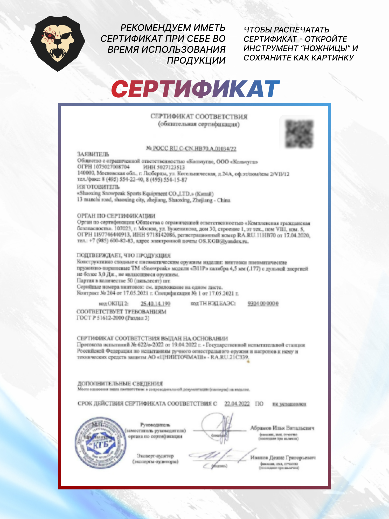 | Комплектация | Винтовка, упаковка, краткая документация, копия сертификата (по запросу покупателя) |