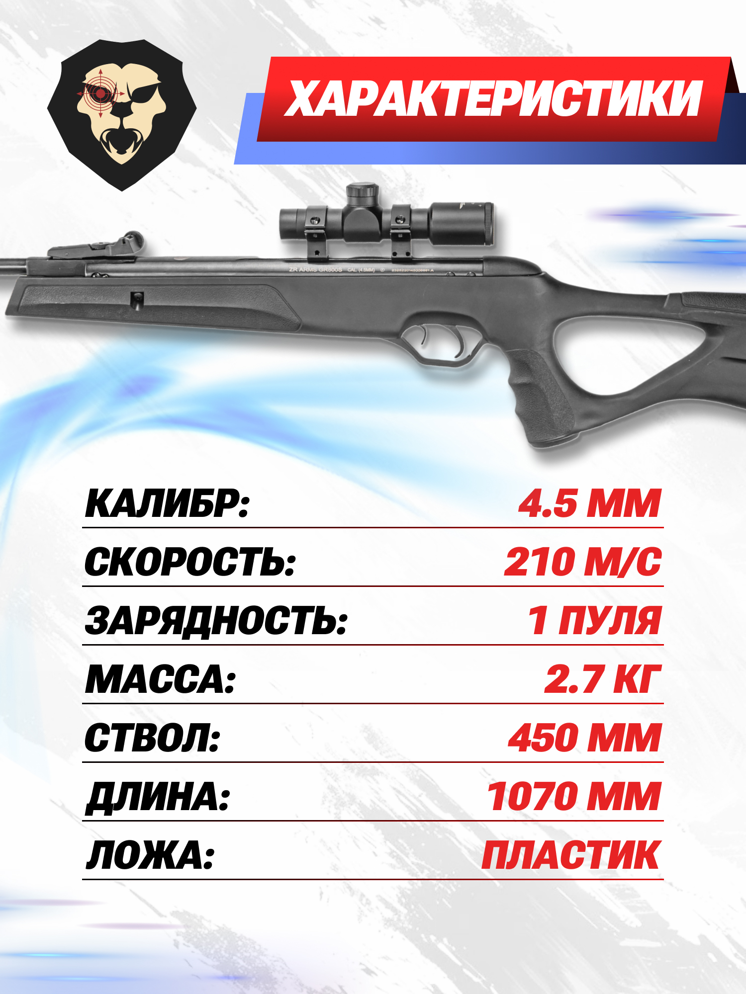 Указанные характеристики, в сочетании с 450-миллиметровым стволом, внутренний канал которого предусматривает 12 стандартных нарезов, позволяют достигать лучших показателей точности стрельбы на дистанциях 50-100 метров. Калибр упомянутого бланка 4.5 миллиметров, а в качестве боеприпаса пневматика использует традиционные свинцовые воланчиковые пули соответствующего размера.