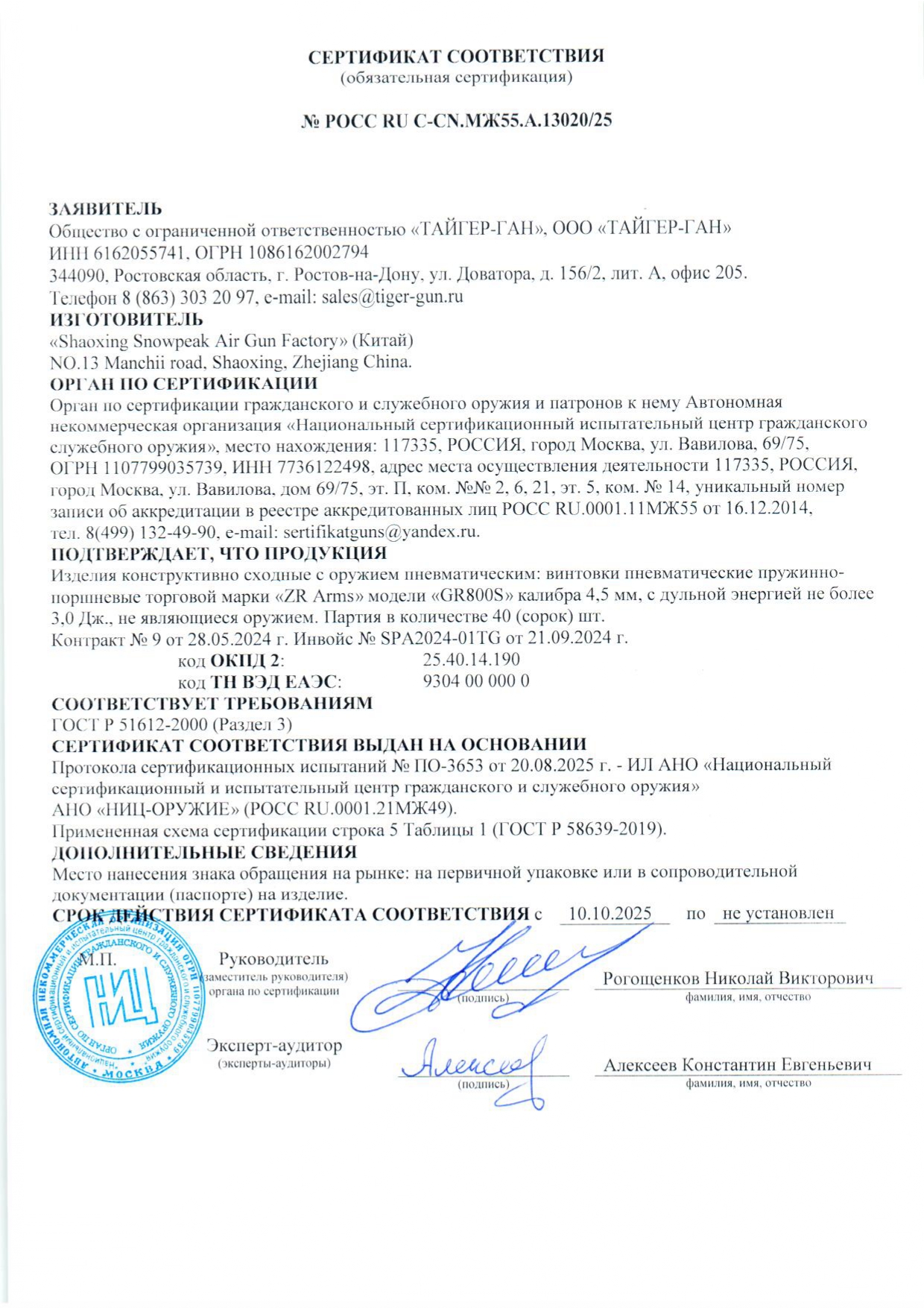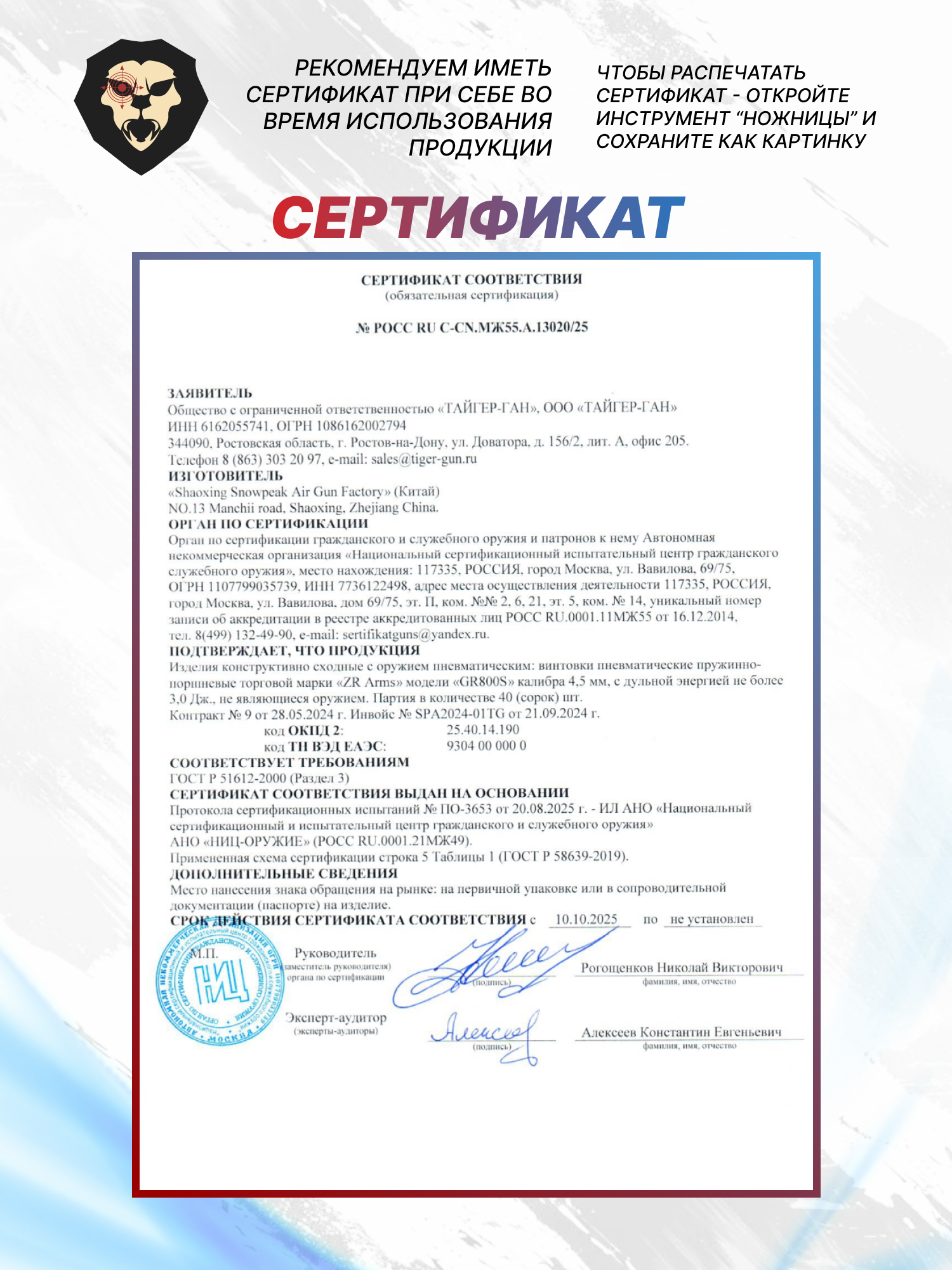 | Комплектация | Винтовка, упаковка, краткая документация, копия сертификата (по запросу покупателя) |
