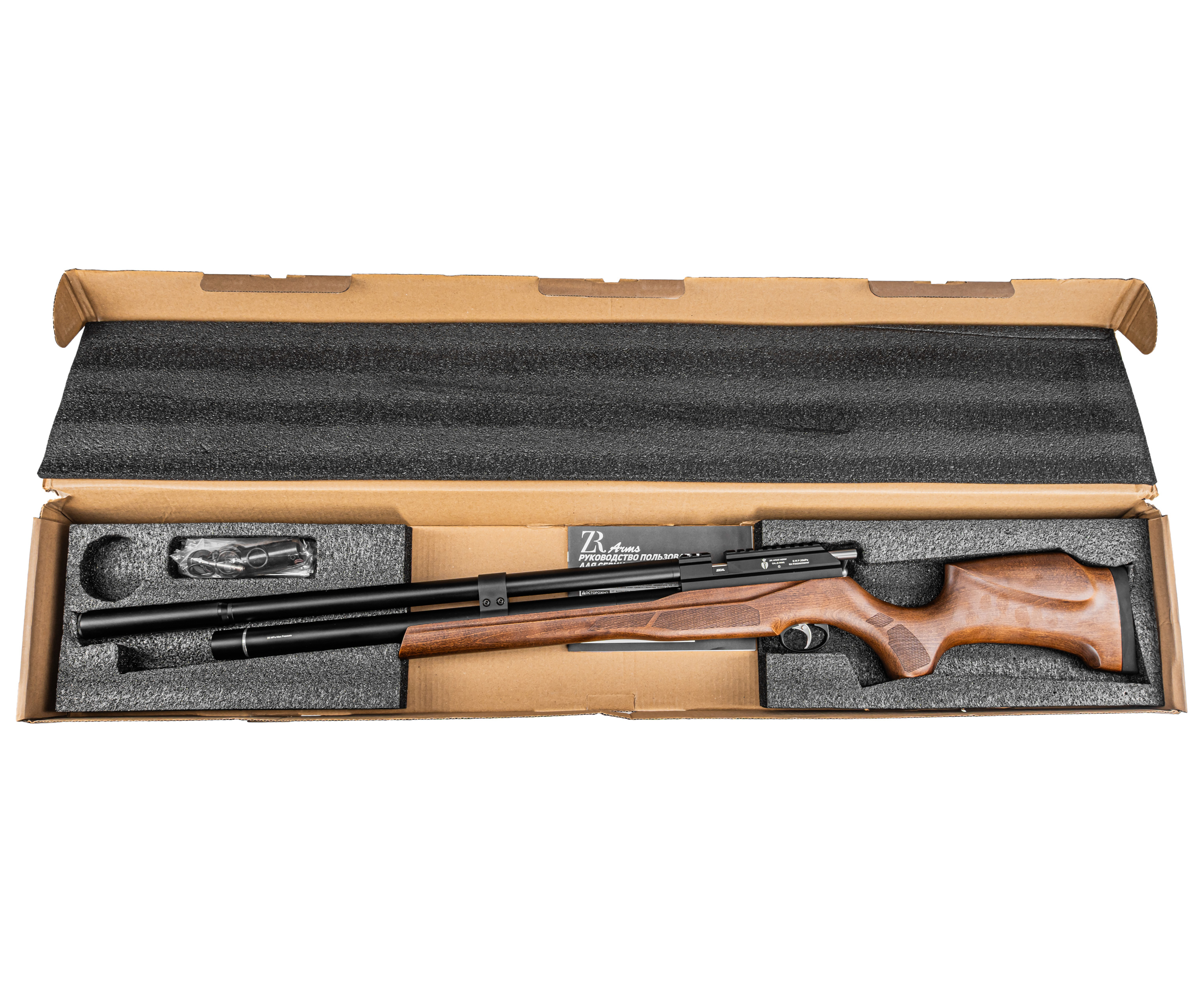 Размер винтовки ЗР Армс составляет 114 сантиметров, а ее вес не превышает 3.3 кг. Пневматика комфортна в удержании, чему способствует эргономичная ложа, которая вырезается из бука. Для точного наведения понадобится оптика - прицел желаемой кратности фиксируется кольцами на планку стандарта Вивер.