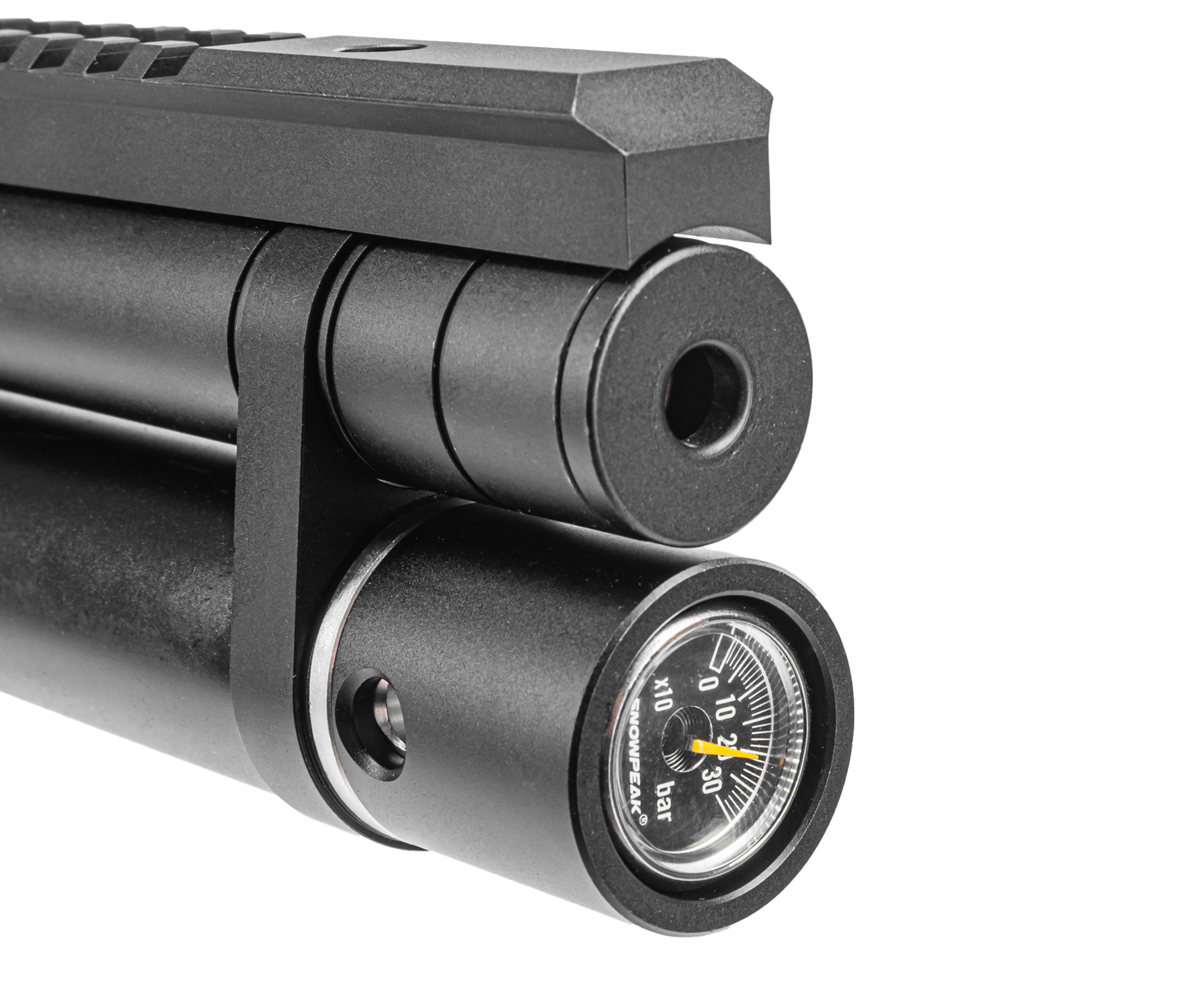 Линейный резервуар М40 имеет объем 260 кубических сантиметров. С торца баллона встроен манометр, при помощи которого оперативно контролируется текущая степень заполнения. В то же время схема газораспределения включает редуктор, что дает стрелку выставить желаемое давление пропускаемого в ствол воздуха.