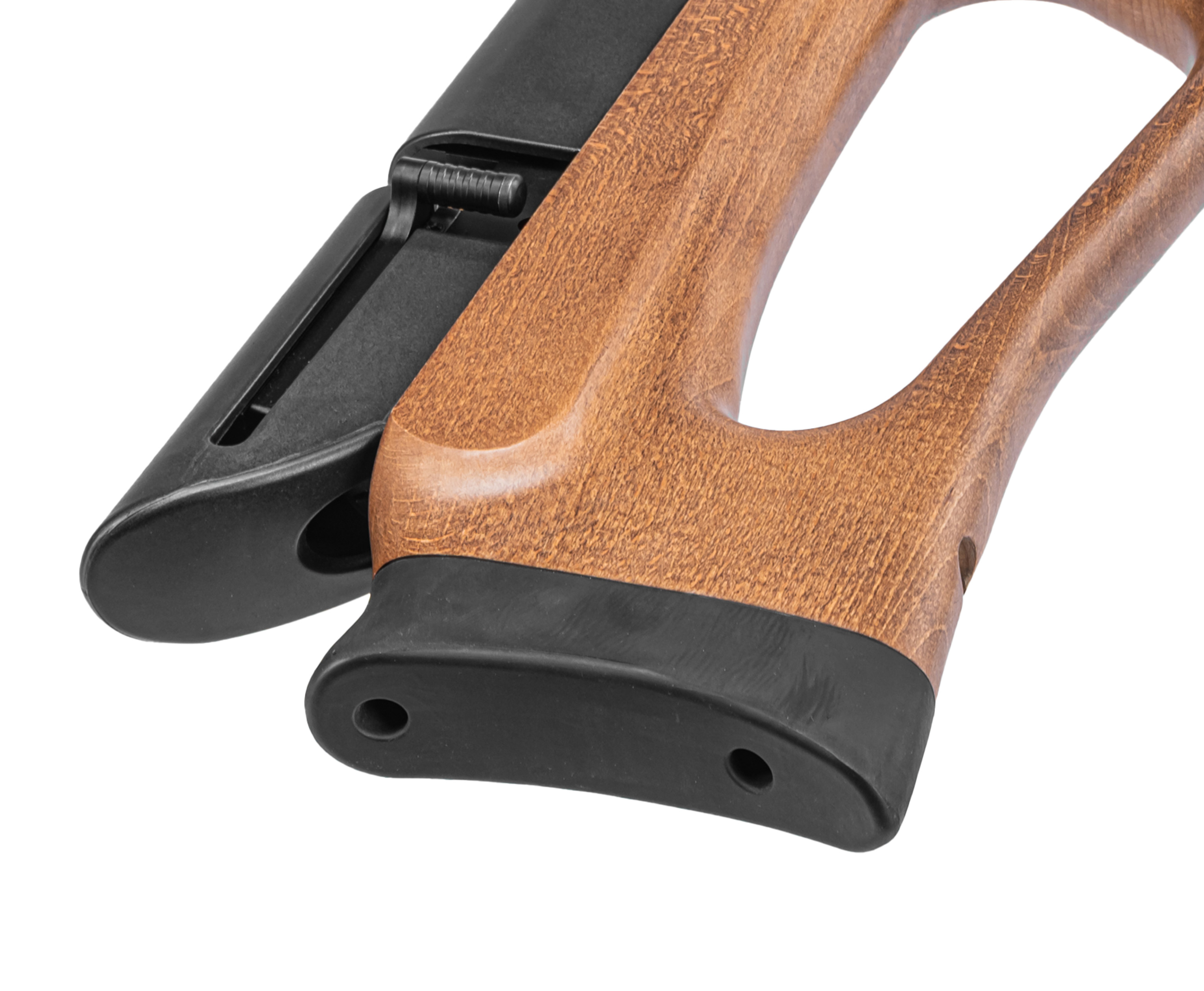 Фурнитура вырезается из бука - она способствует привлекательному внешнему виду и создает условия для комфортного удержания. Со стороны приклада предусмотрен резиновый тыльник, который исключает скольжение по плечу. Габарит изделия при этом составляет 820 миллиметров, а масса не превышает 3.35 кг.