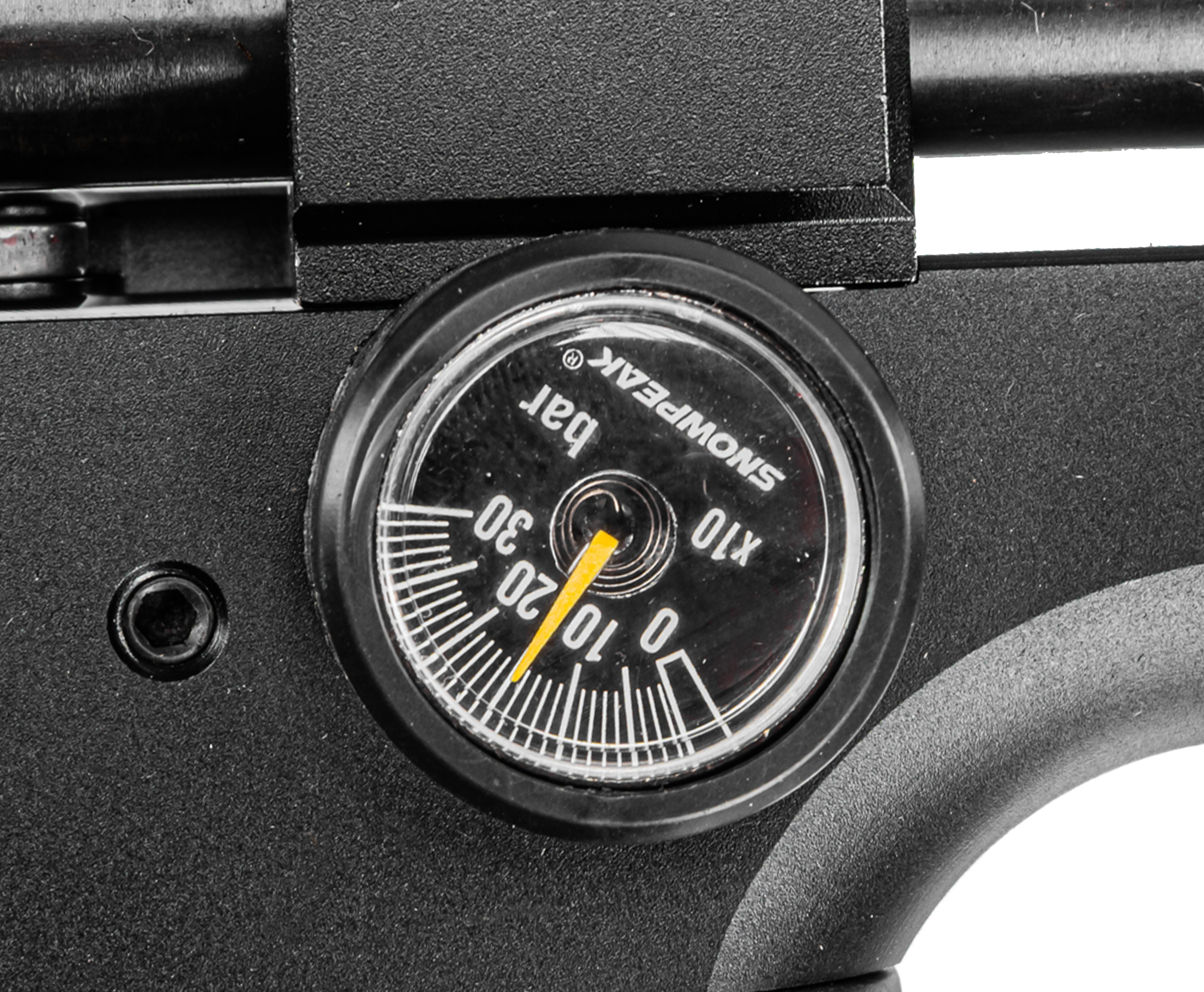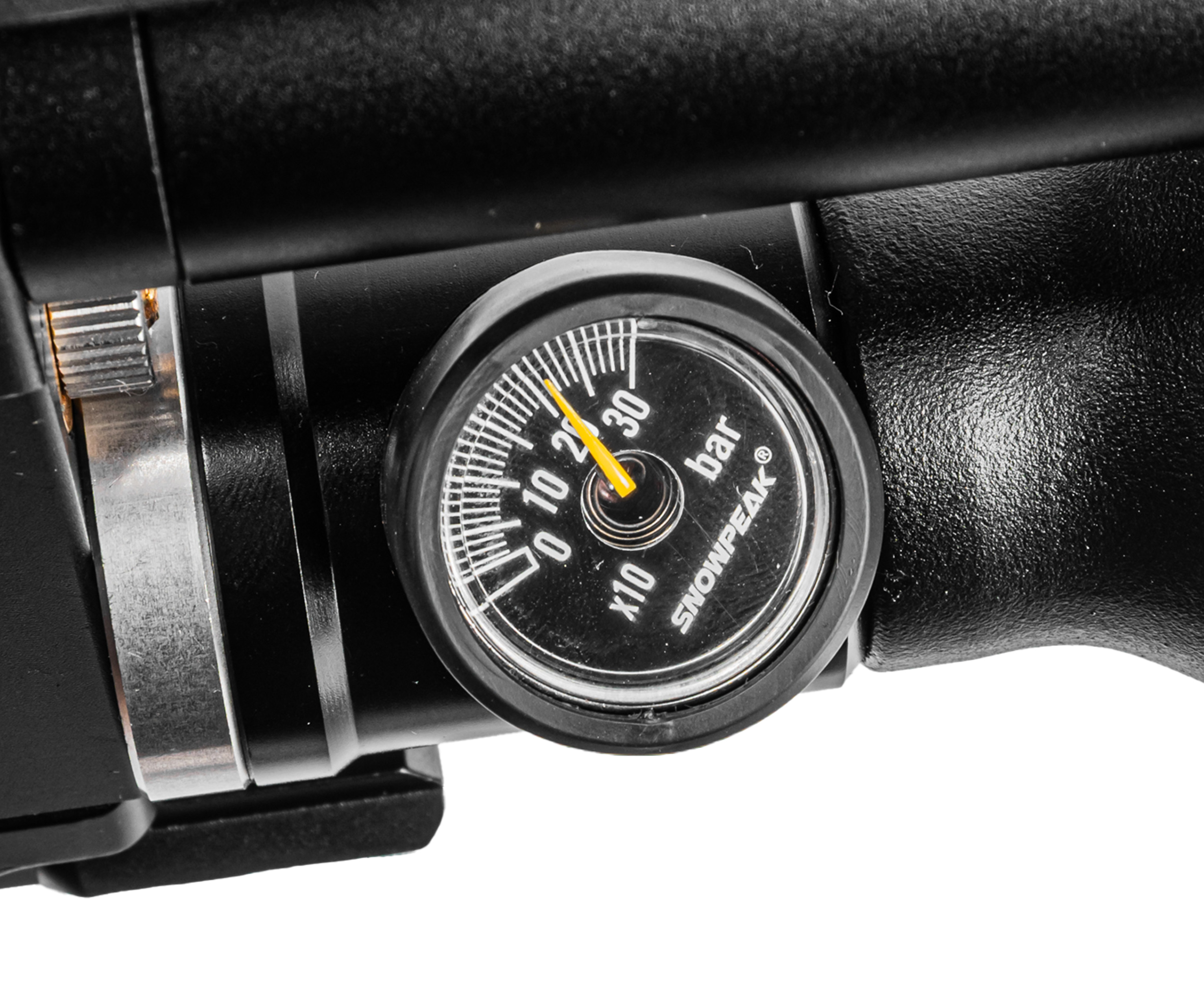 В системе газораспределения предусмотрен редуктор - при помощи него выставляется требуемое давление воздуха, пропускаемого в канал ствола через клапан. Таким образом, настройкой узла достигается более стабильная эксплуатация изделия. Сама колба рассчитана на максимальную накачку в 250 Бар, что контролируется манометром.