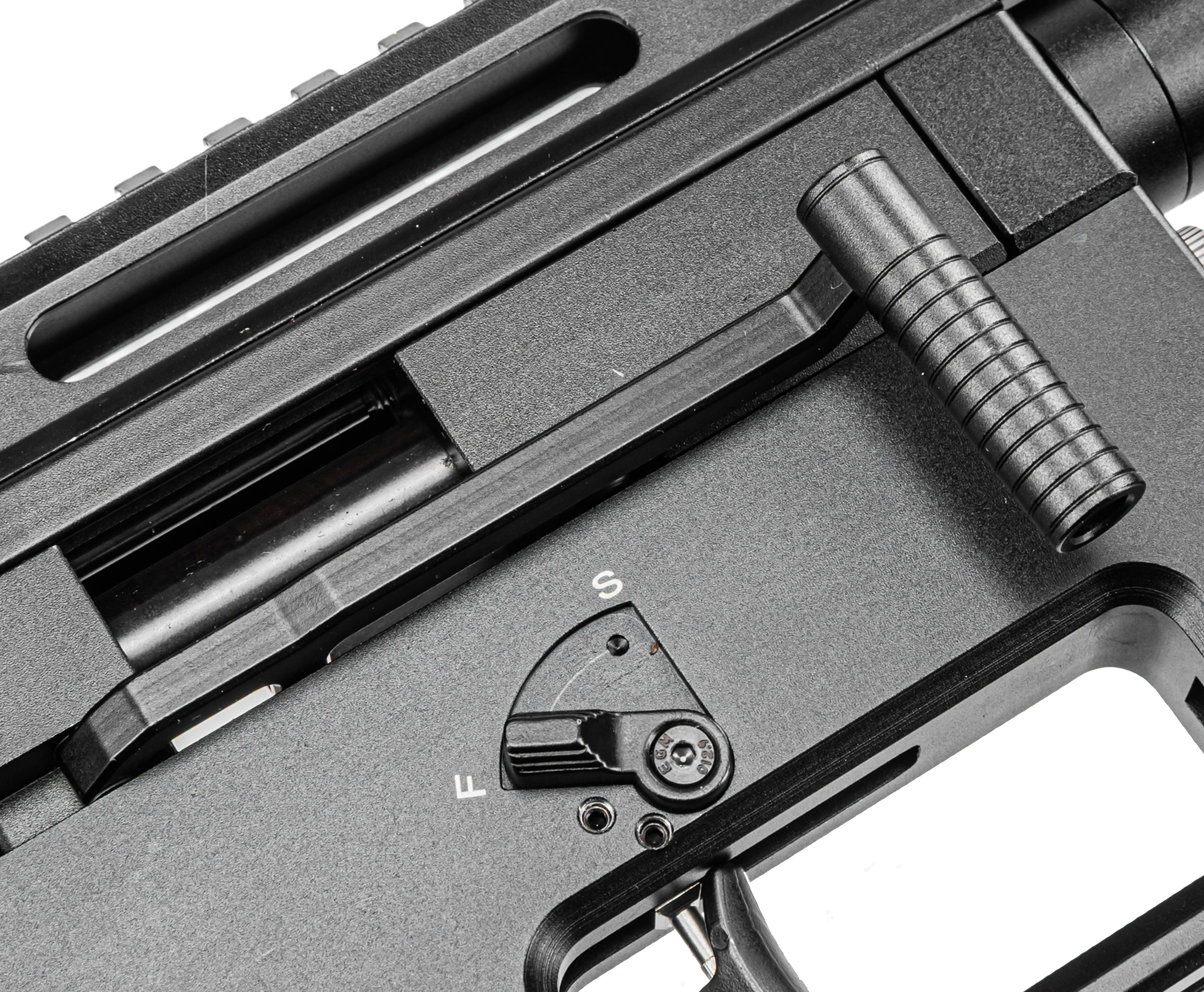 Стрелковая единица построена по БуллПап схеме, за счет чего выделяется компактным размером 925 мм. Габарит можно дополнительно сократить, если снять дульную насадку. Модератор фиксируется на резьбу M15x1.5 и исполняет функцию приглушения громкости выстрела.