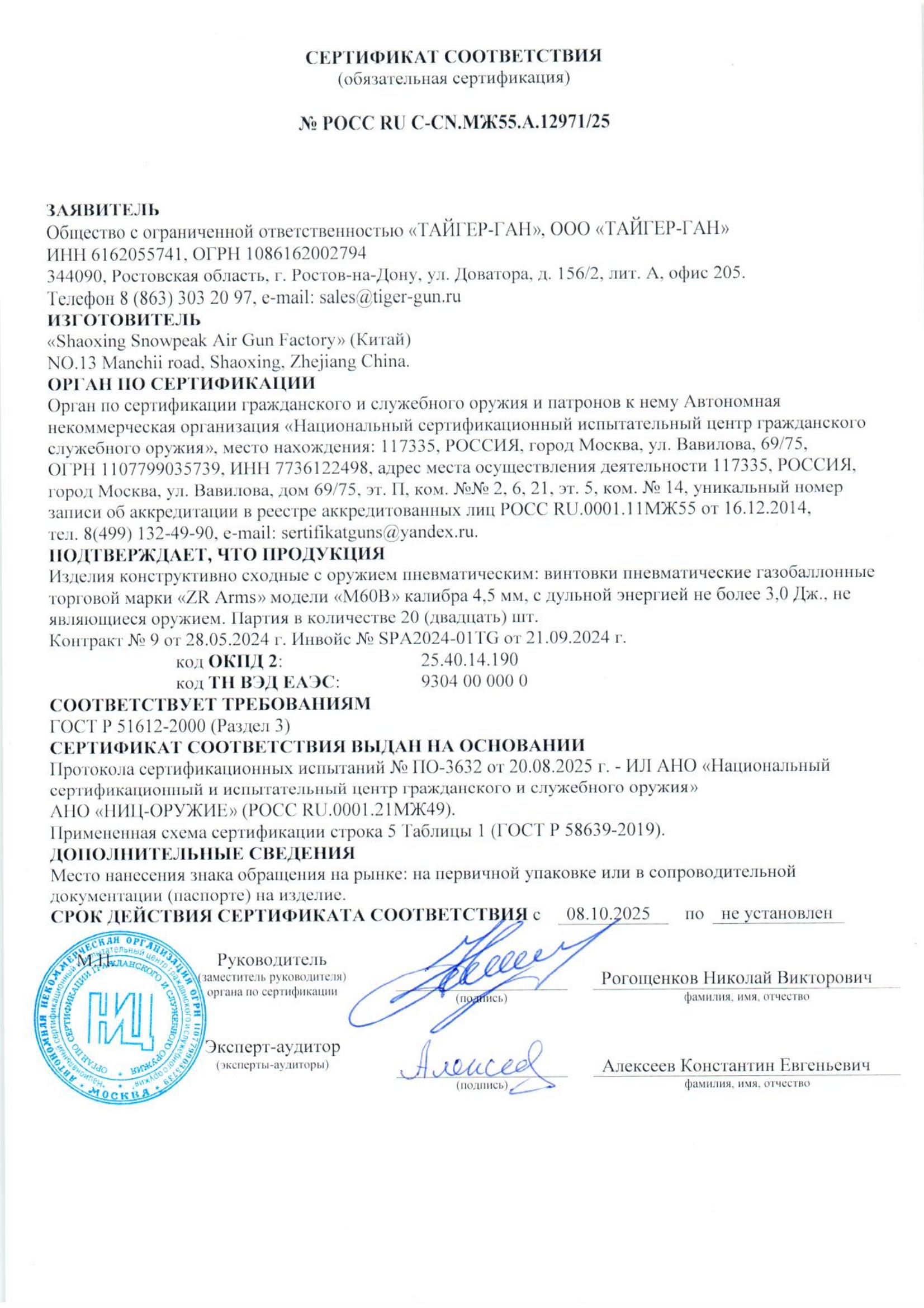 | Комплектация | Винтовка, магазин, упаковка, заправочный штуцер, краткая документация, копия сертификата (по запросу покупателя) |