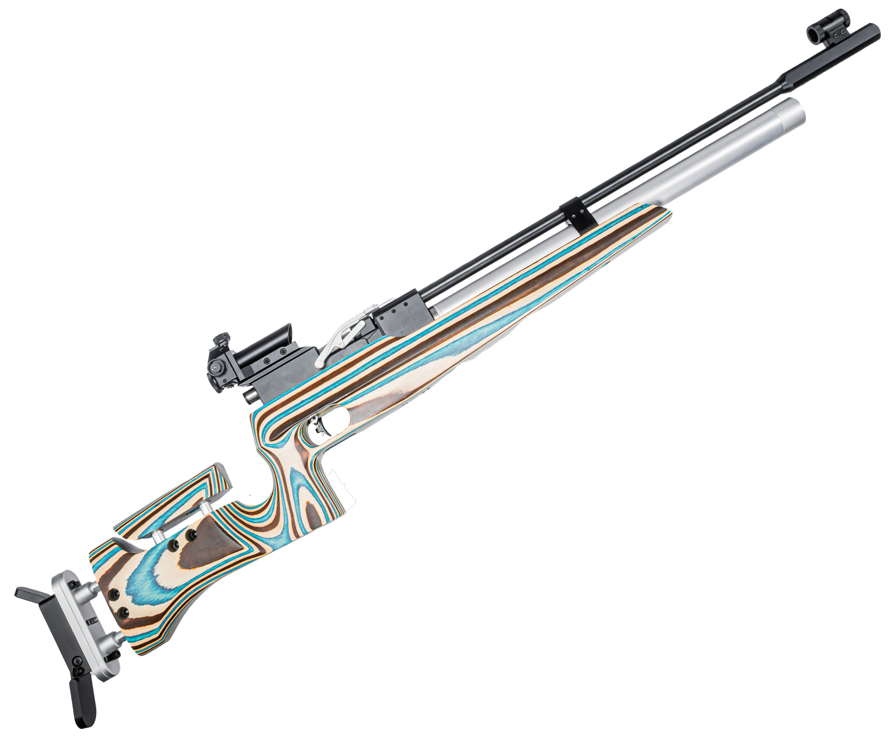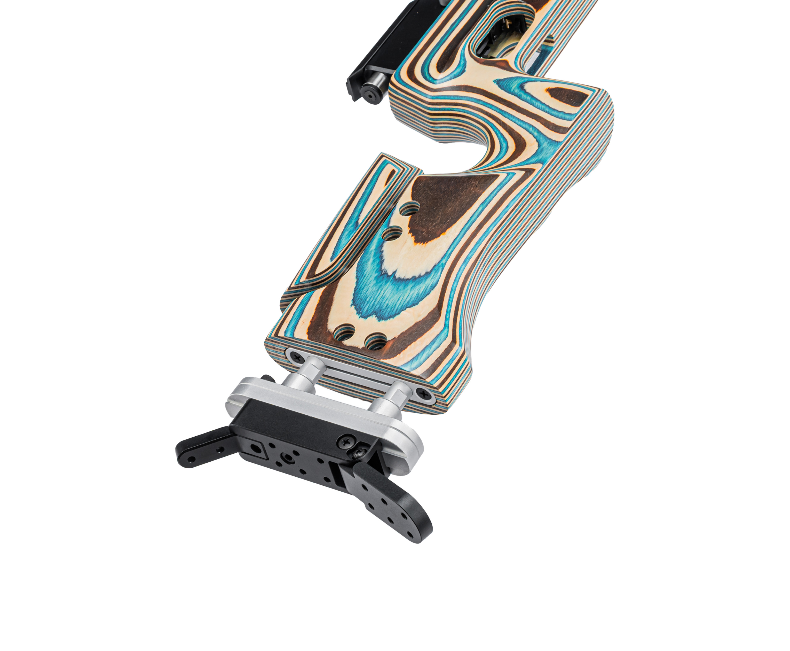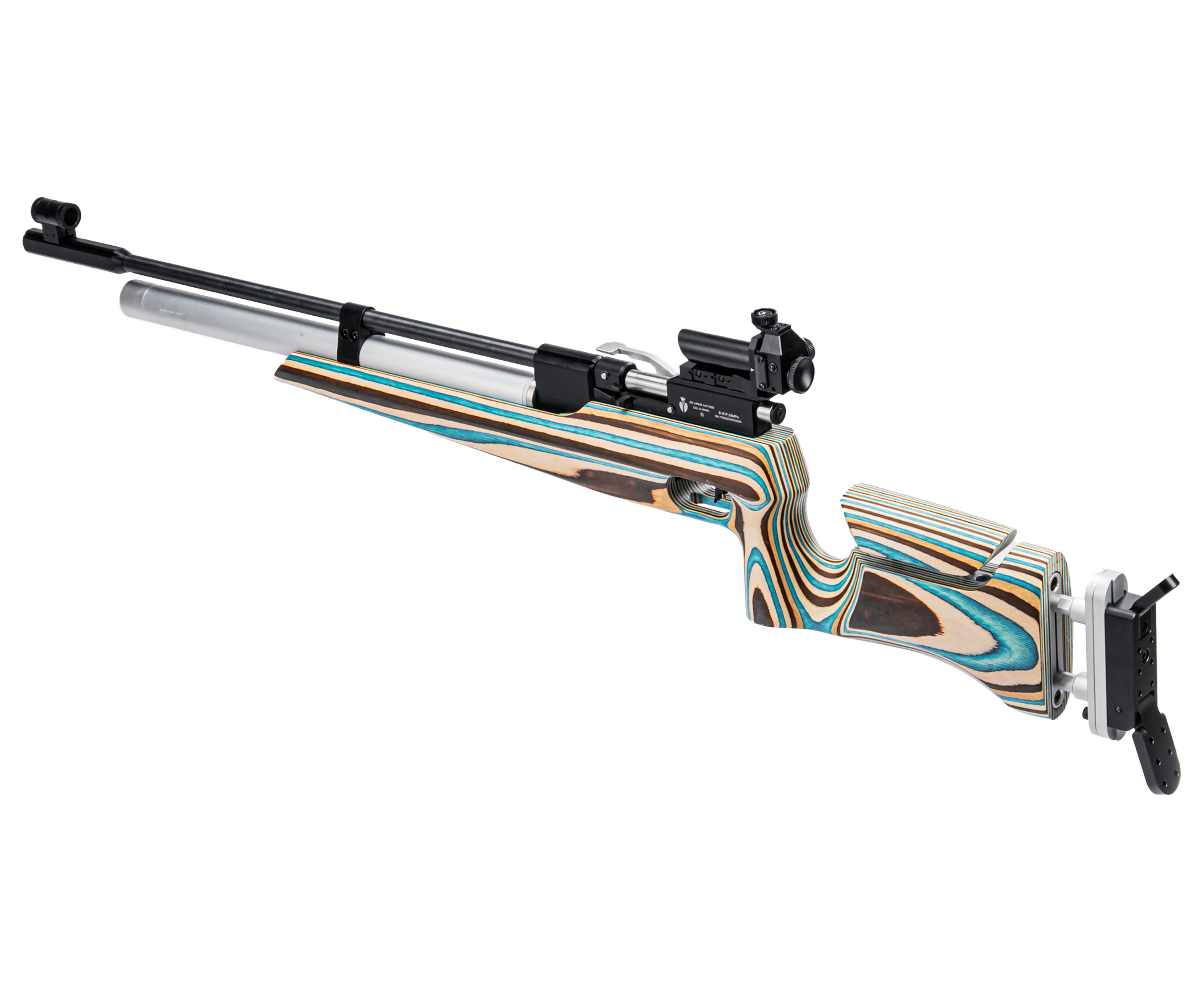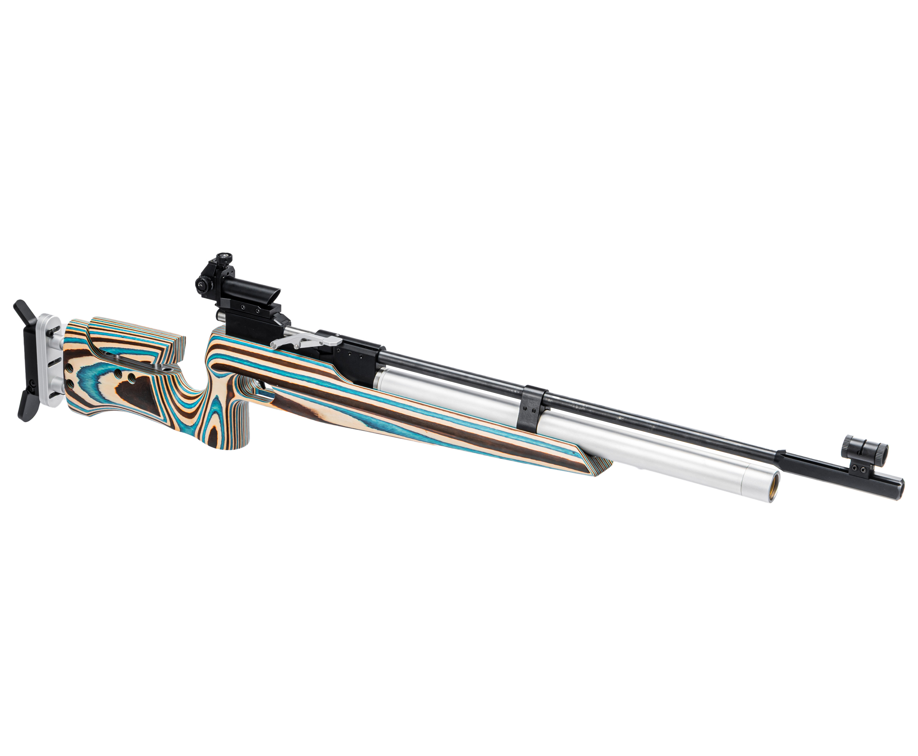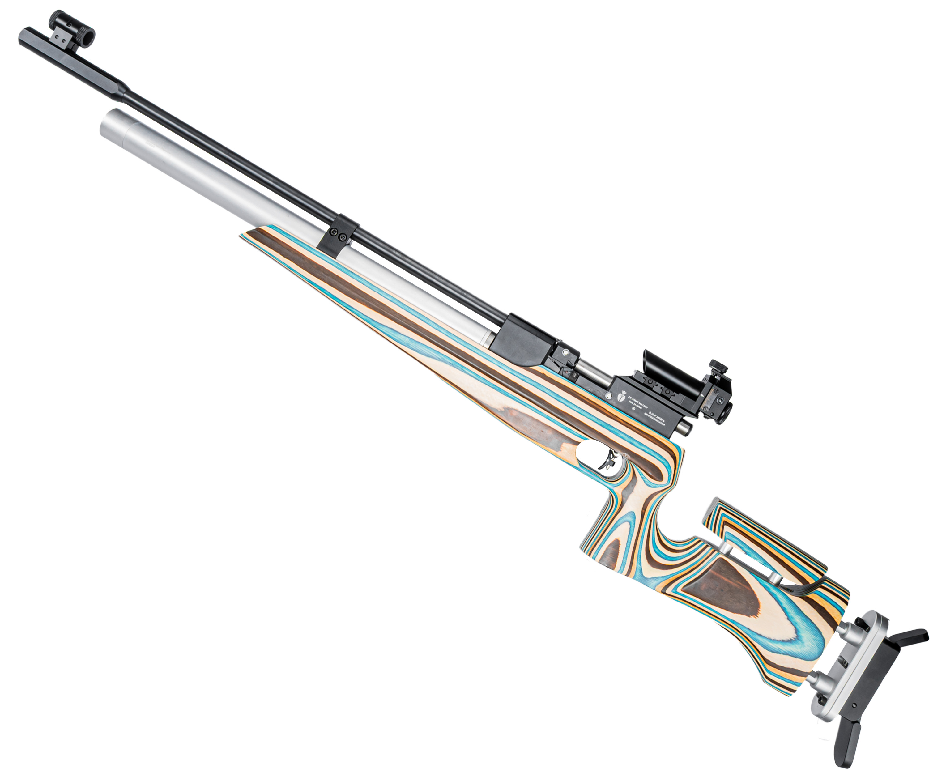Деревянное ламинатное ложе, помимо внешней привлекательности, также наделили полезным функционалом - здесь присутствует настраиваемый тыльник приклада вкупе с подщечником. Длина оружия 106 см - компромисс для разных спортсменов разных комплекций. При этом параметр массы приближен к 3.31 килограмма - в контексте дисциплины это достоинство, т.к. вес помогает избежать колебаний тела в стойке.