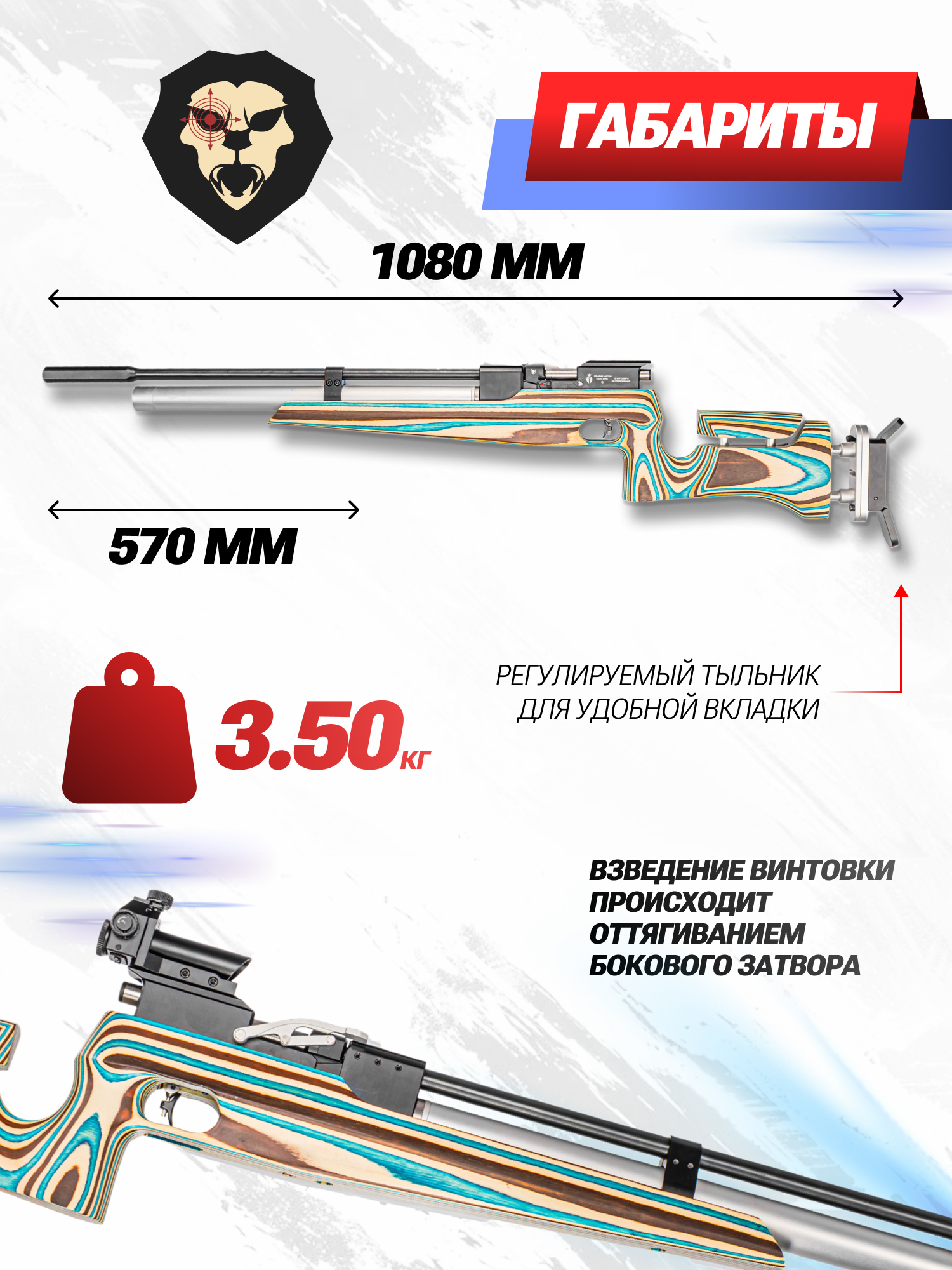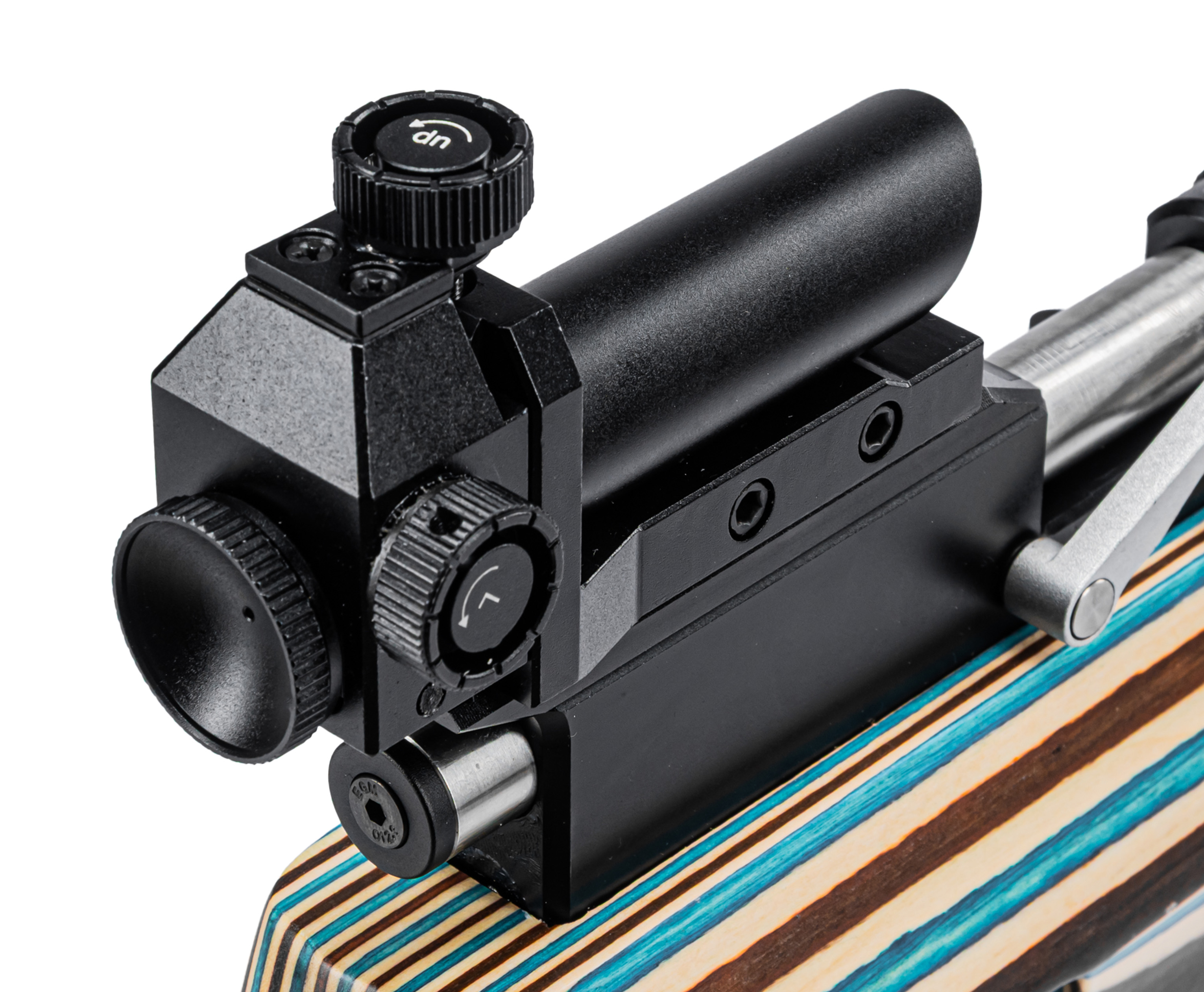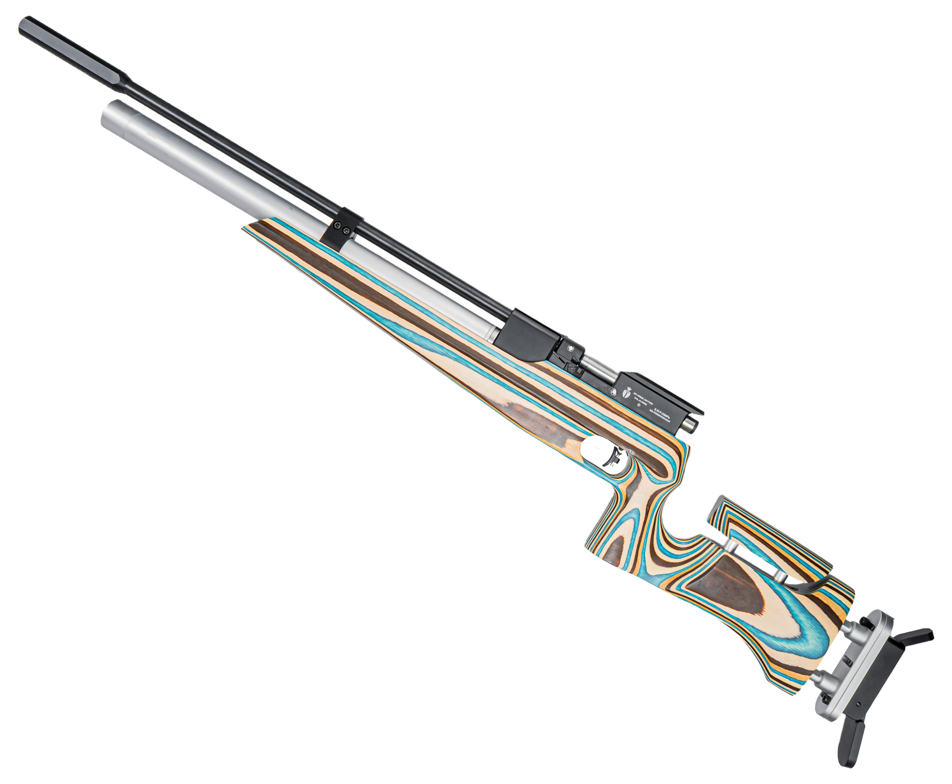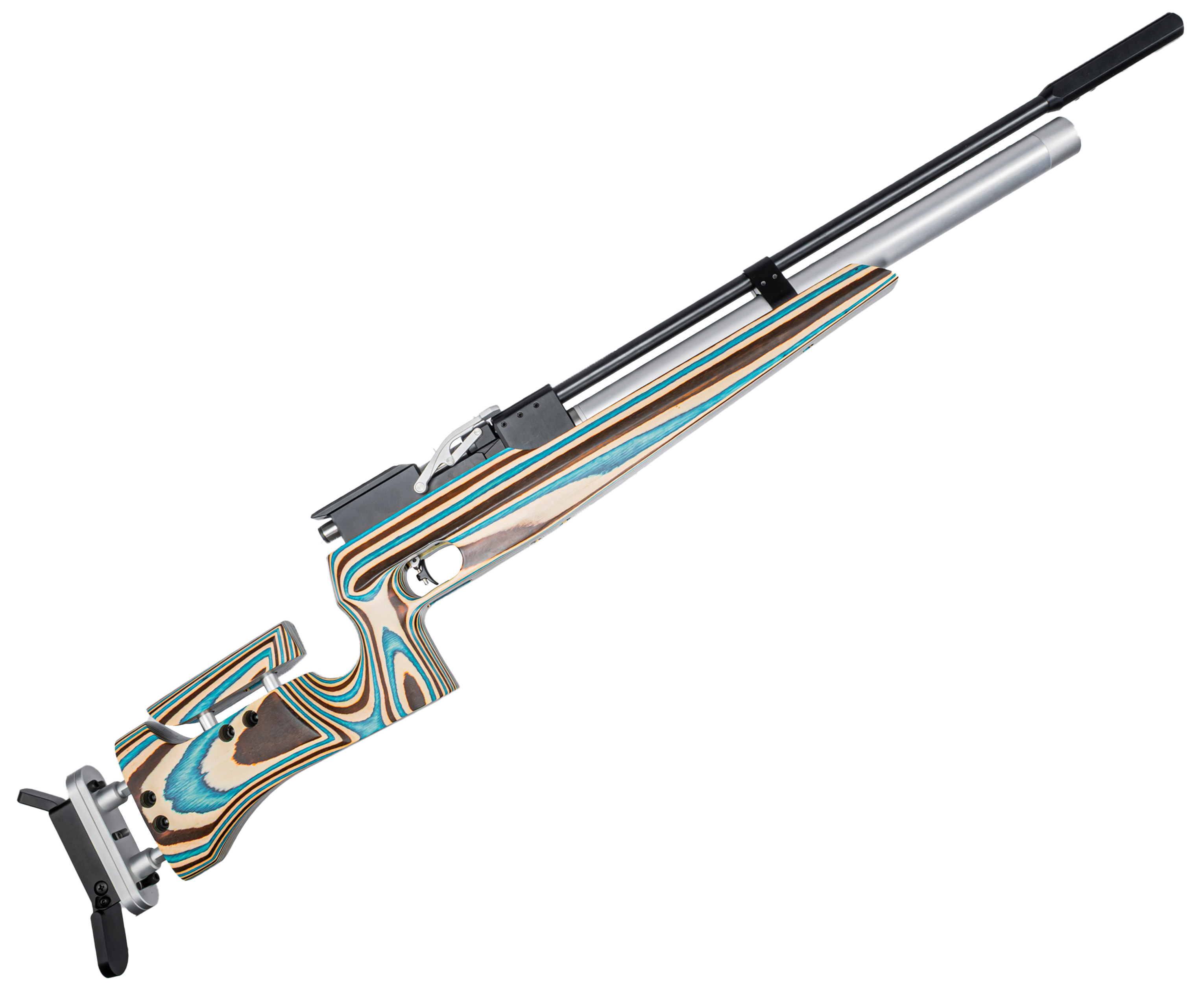 Деревянное ламинатное ложе, помимо внешней привлекательности, также наделили полезным функционалом - здесь присутствует настраиваемый тыльник приклада вкупе с подщечником. Длина оружия 106 см - компромисс для разных спортсменов разных комплекций. При этом параметр массы приближен к 3.31 килограмма - в контексте дисциплины это достоинство, т.к. вес помогает избежать колебаний тела в стойке.