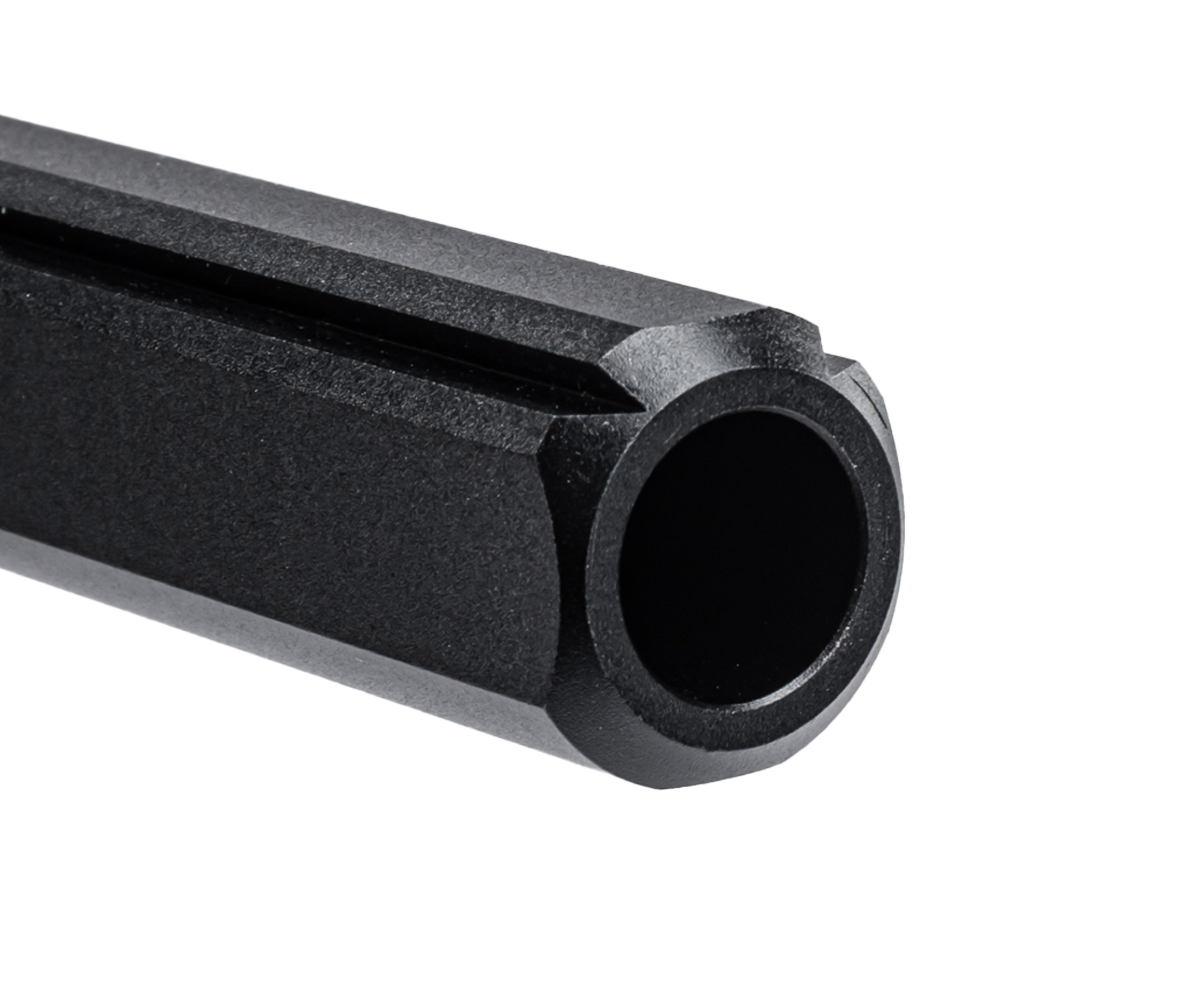 Исходя из особенностей олимпийской стрельбы, оружие однозарядное - пульки нужно вставлять в ствол поштучно после выстрела. Бланк выполнили в распространенном диаметре 15 мм для возможности самостоятельного перестволивания.
