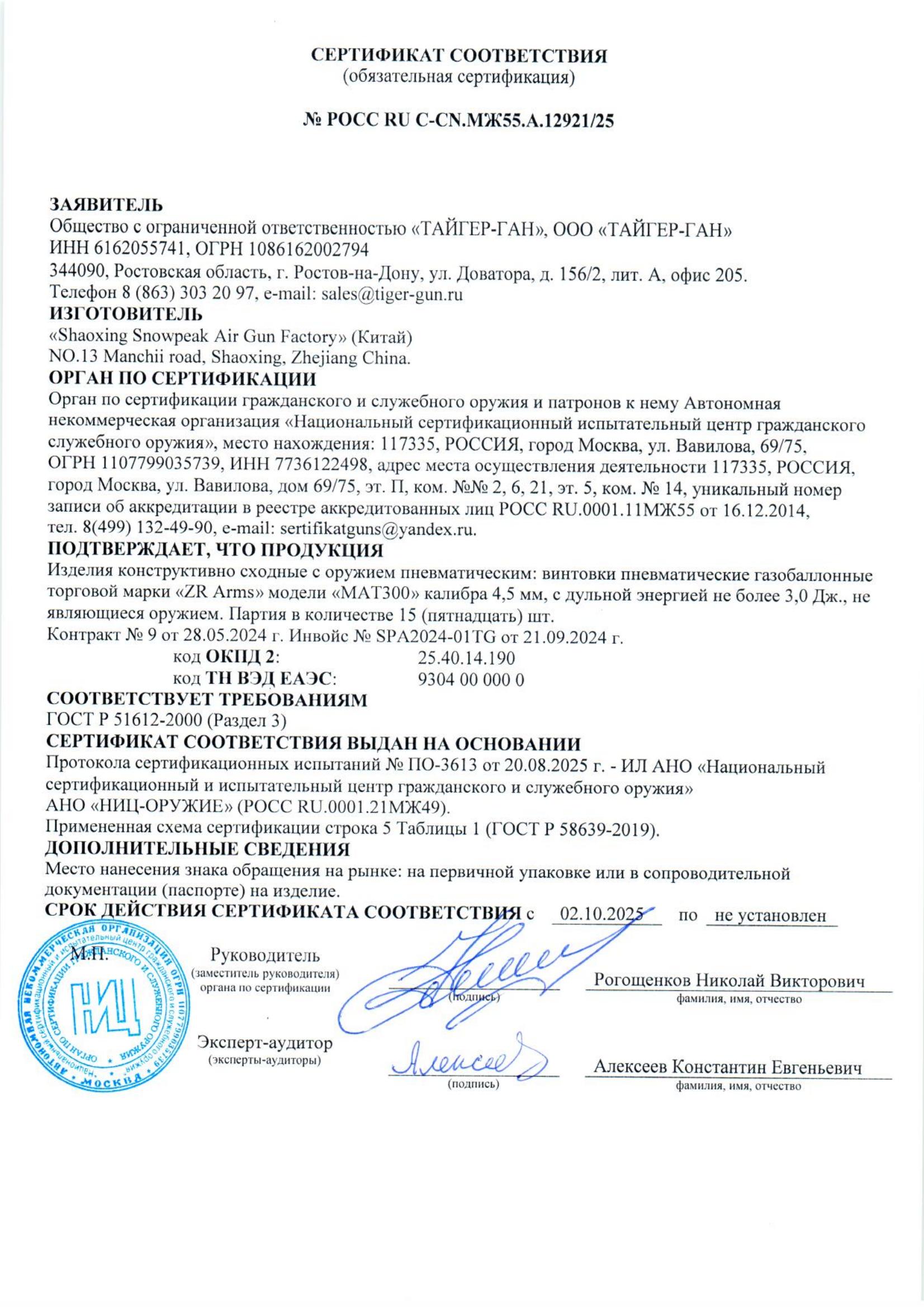 Информация о товаре "Пневматическая винтовка ZR Arms MAT300 4.5 мм (ламинат, PCP)" носит ознакомительный характер, и не является публичной офертой, определяемой положениями Статьи 437 Гражданского кодекса Российской Федерации, характеристики, внешний вид, цвет и комплектация могут быть изменены производителем без уведомления.