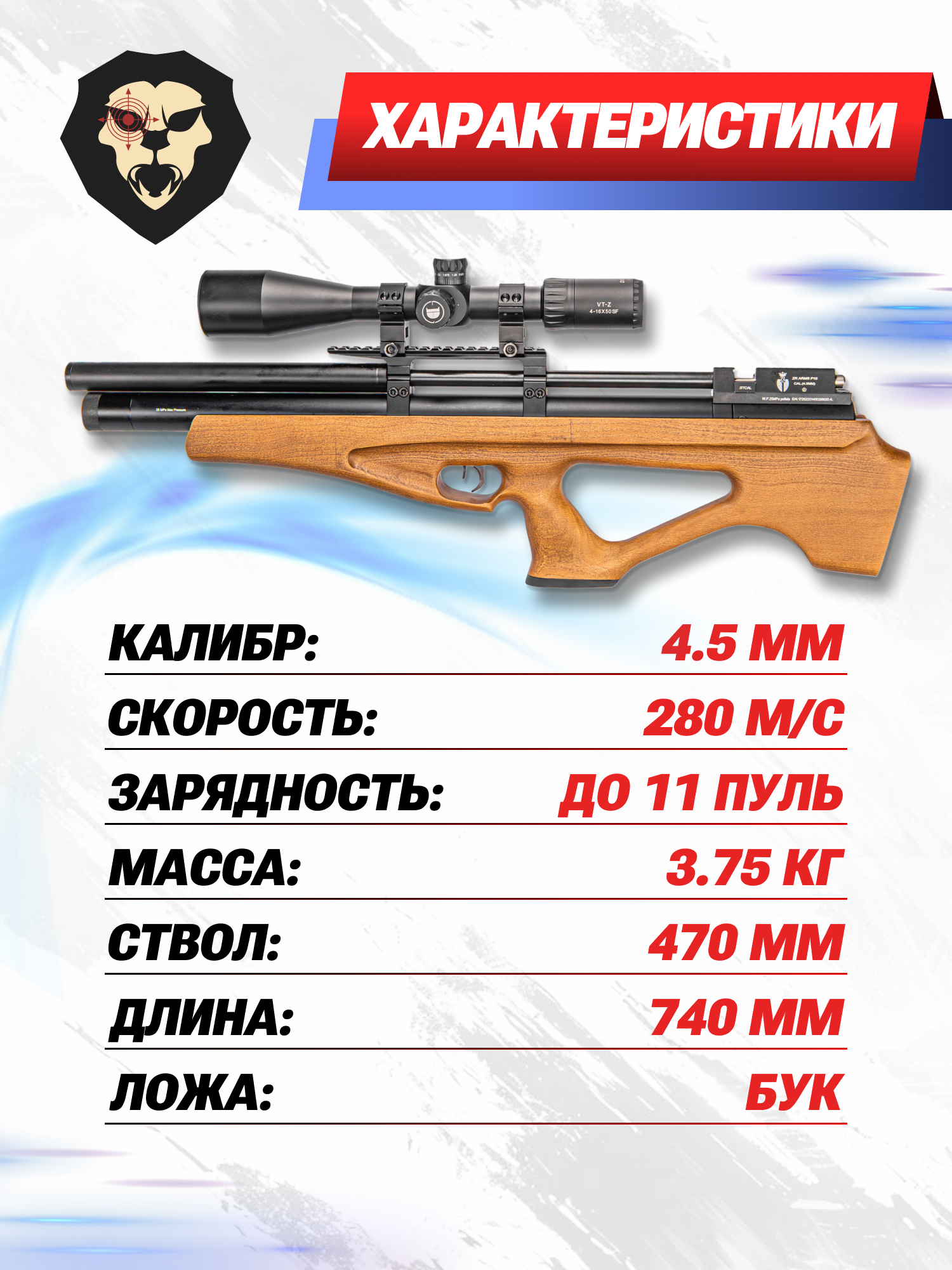 Пневматическая винтовка ZR Arms P10 4.5 мм (бук, ПСП) купить в интернет-магазине Popadiv10.