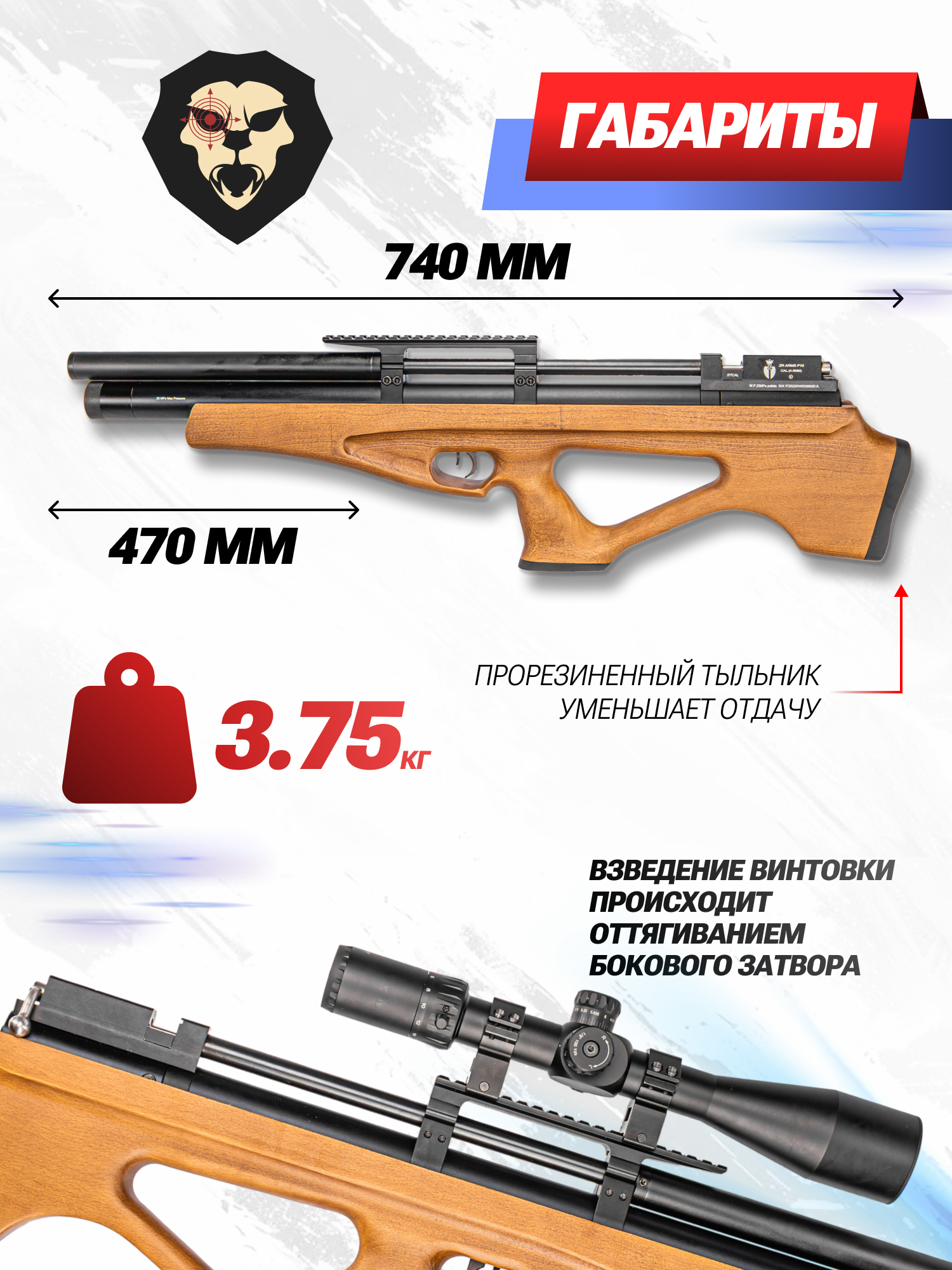 Пневматика собрана в компоновке БуллПап, следовательно, она характеризуется компактными габаритами. Заявленный размер оружия не превышает 74 сантиметра, благодаря чему изделие порадует управляемостью и удобством транспортировки. В то же время конфигурация позволила сохранить длину ствола.