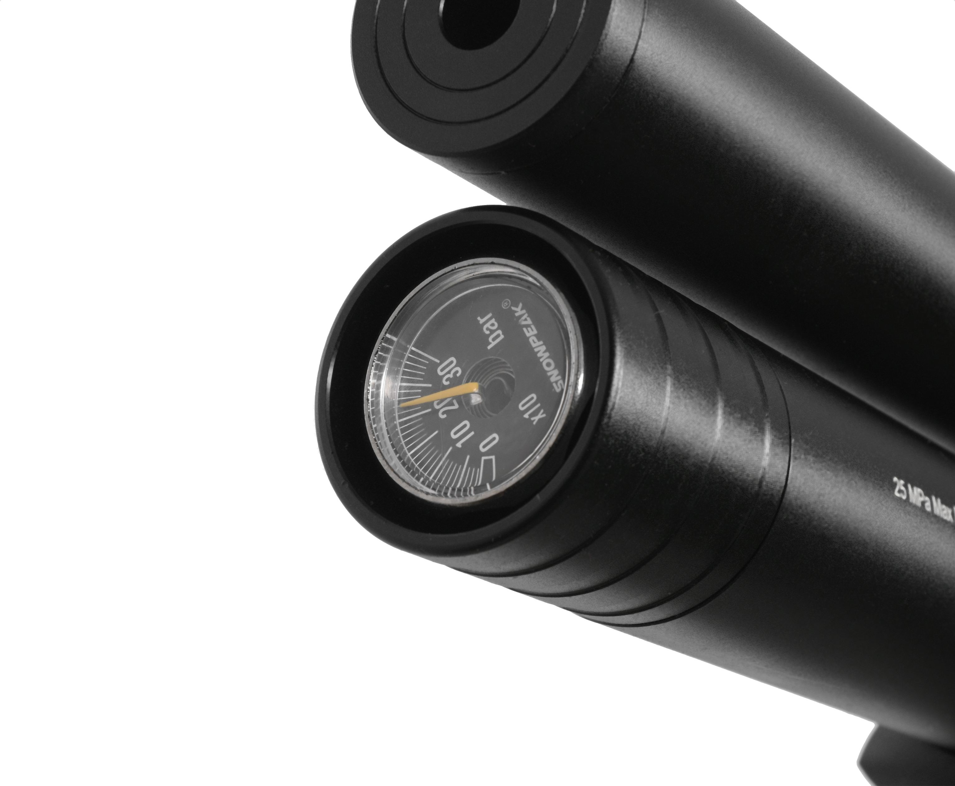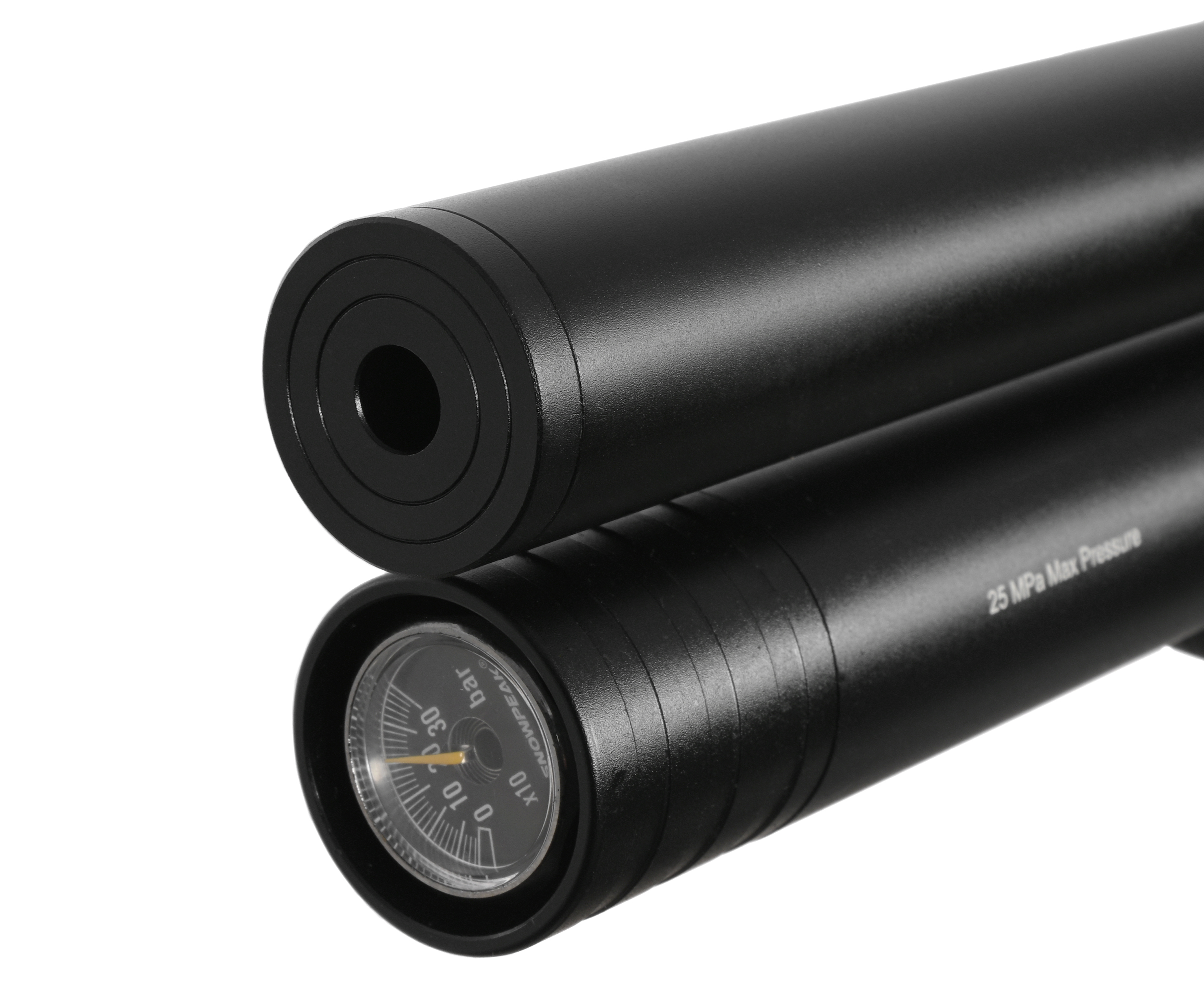 Ресивер рассчитан на максимальный рабочий показатель 250 Бар. В системе заявлено присутствие редуктора. Узел позволяет повысить стабильность работы пневматики путем регулировки давления воздуха, пропускаемого через боевой клапан в ствол.