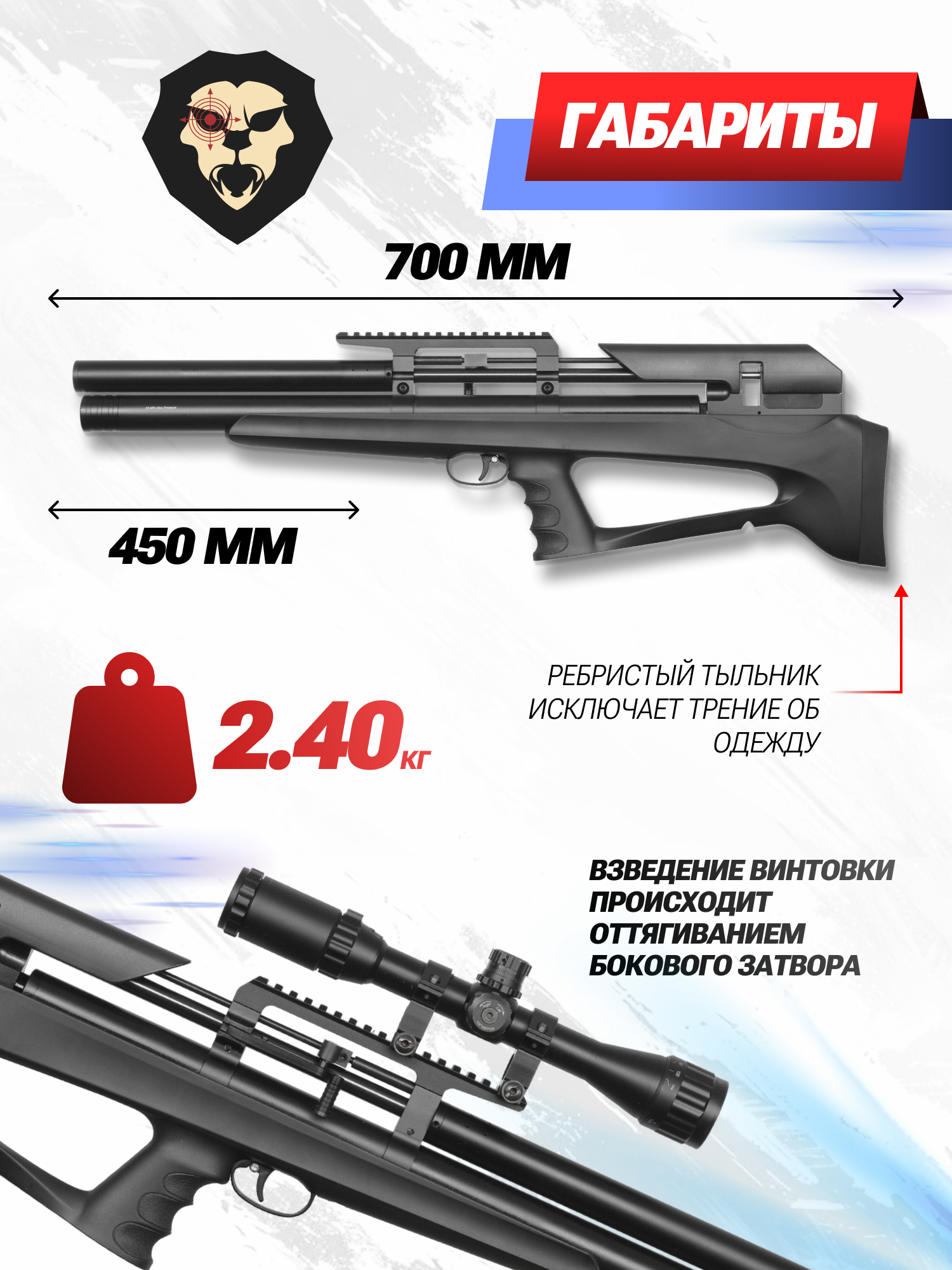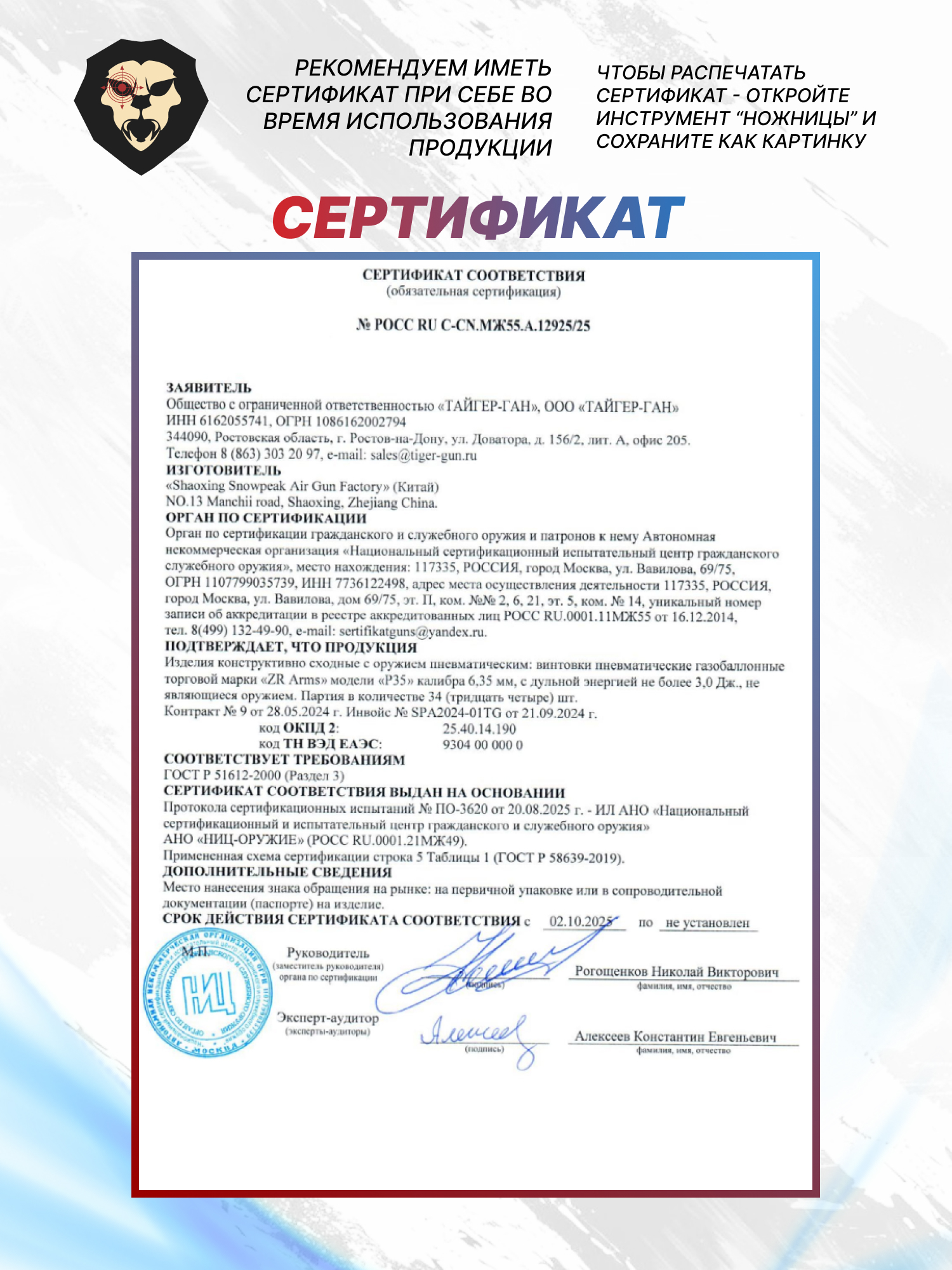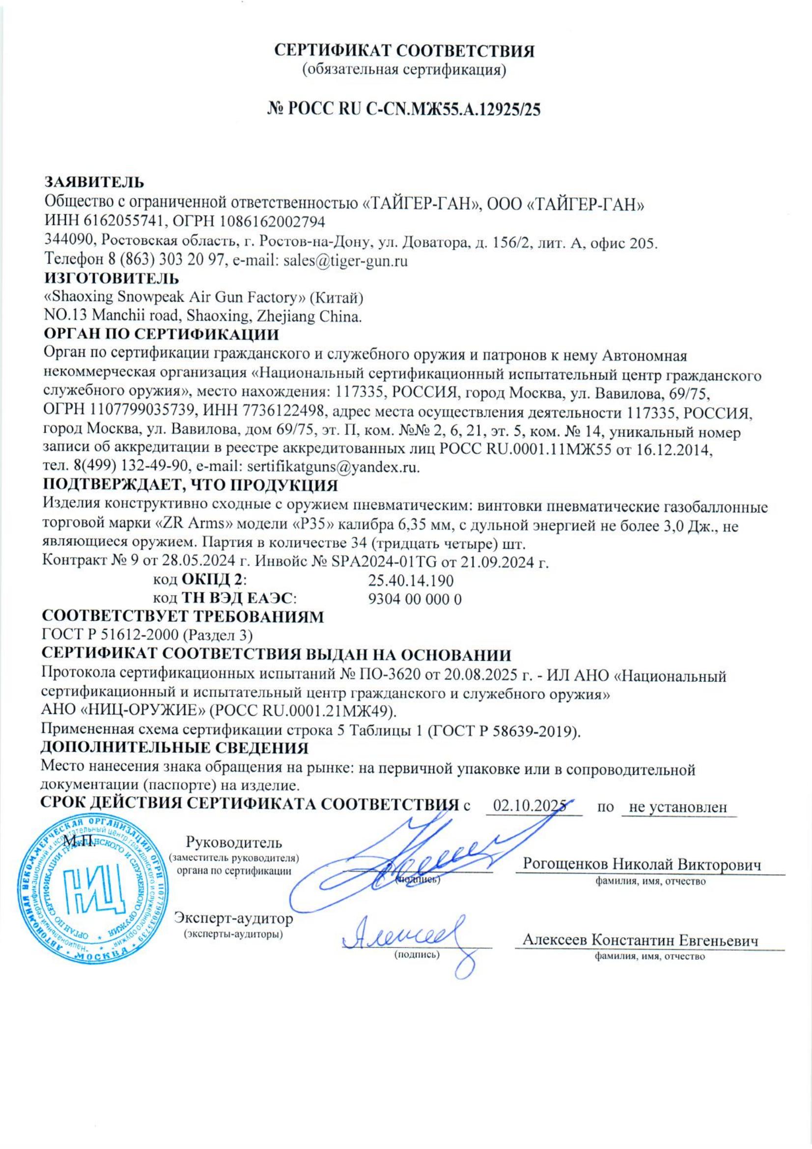 | Комплектация | Винтовка, магазин, заправочный штуцер, упаковка, краткая документация, копия сертификата (по запросу покупателя) |