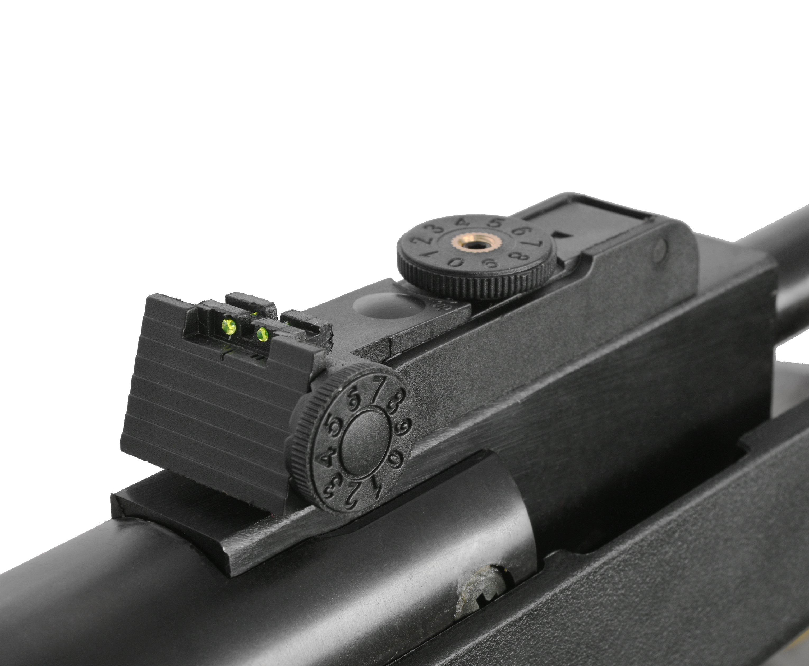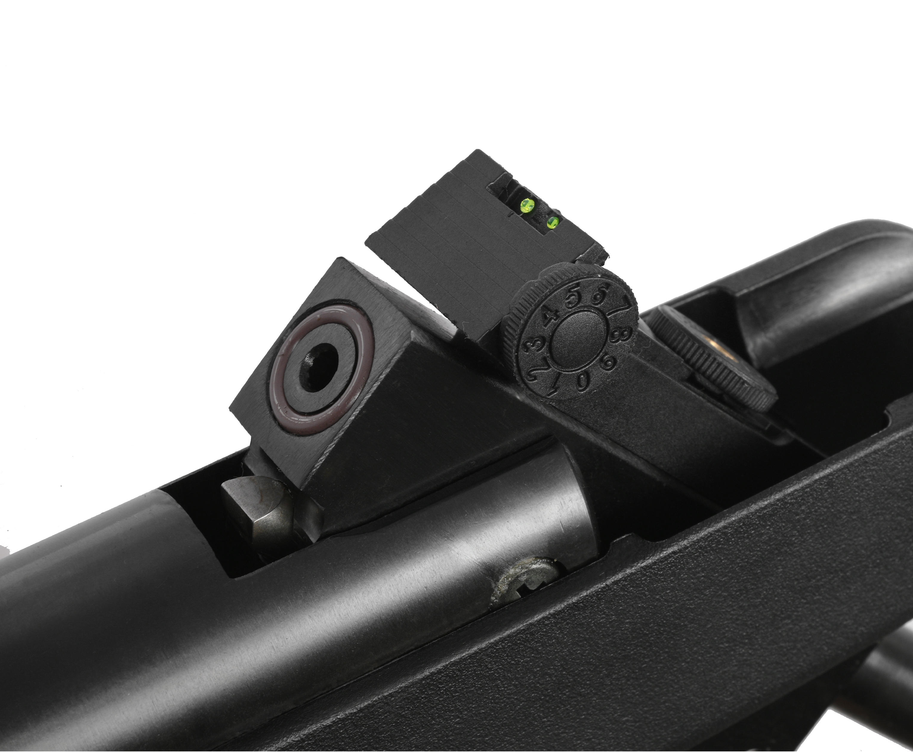 Пневматическая винтовка пружинно поршневая ZR Arms оснащается стандартными приспособлениями в виде мушки и целика. Элементы дополняются светоотражающими вставками из фибергласса. Помимо этого конструкция экземпляра предрасполагает к монтажу оптики на кольцах, совместимых с пазами «Ласточкин хвост».