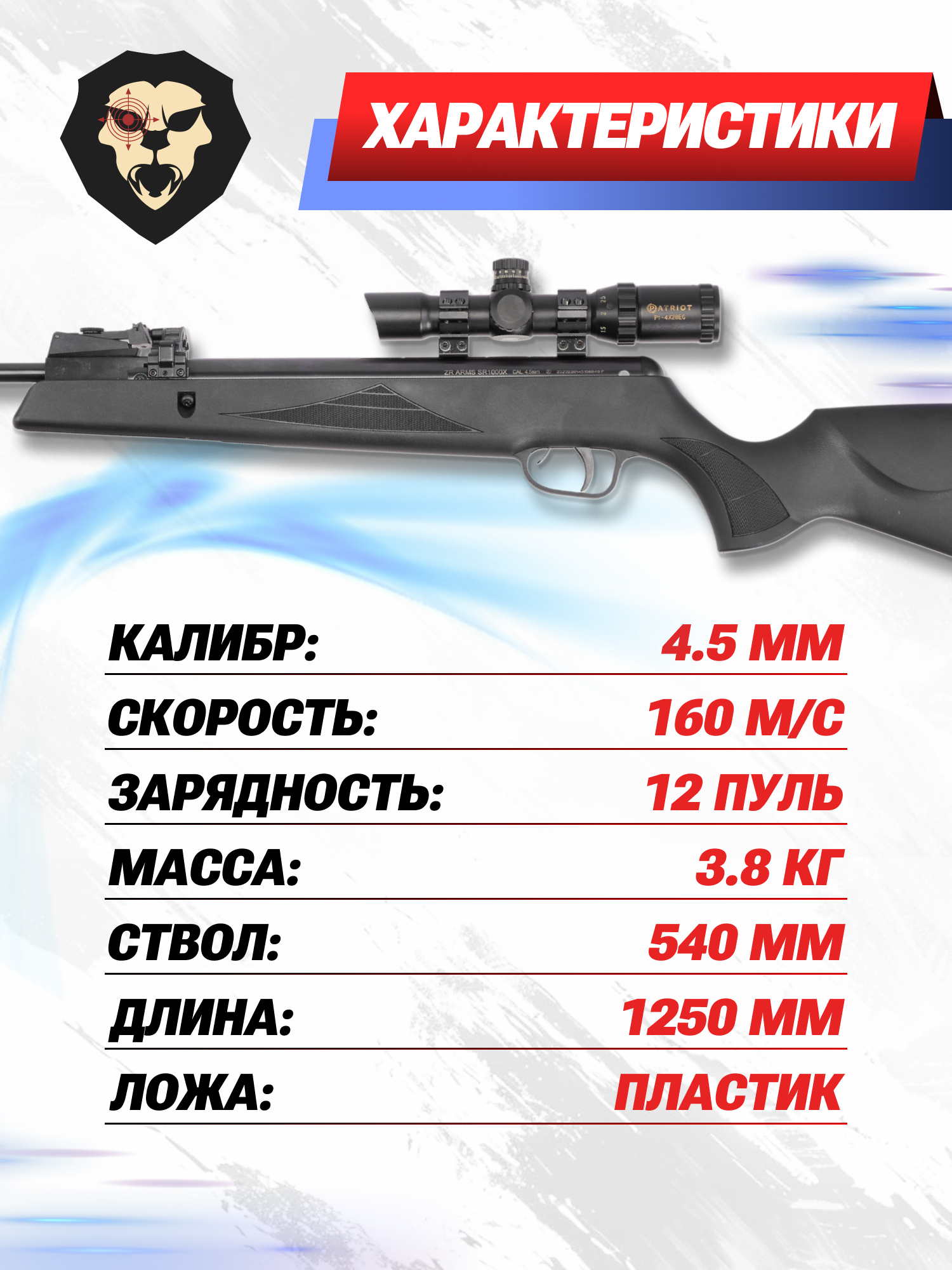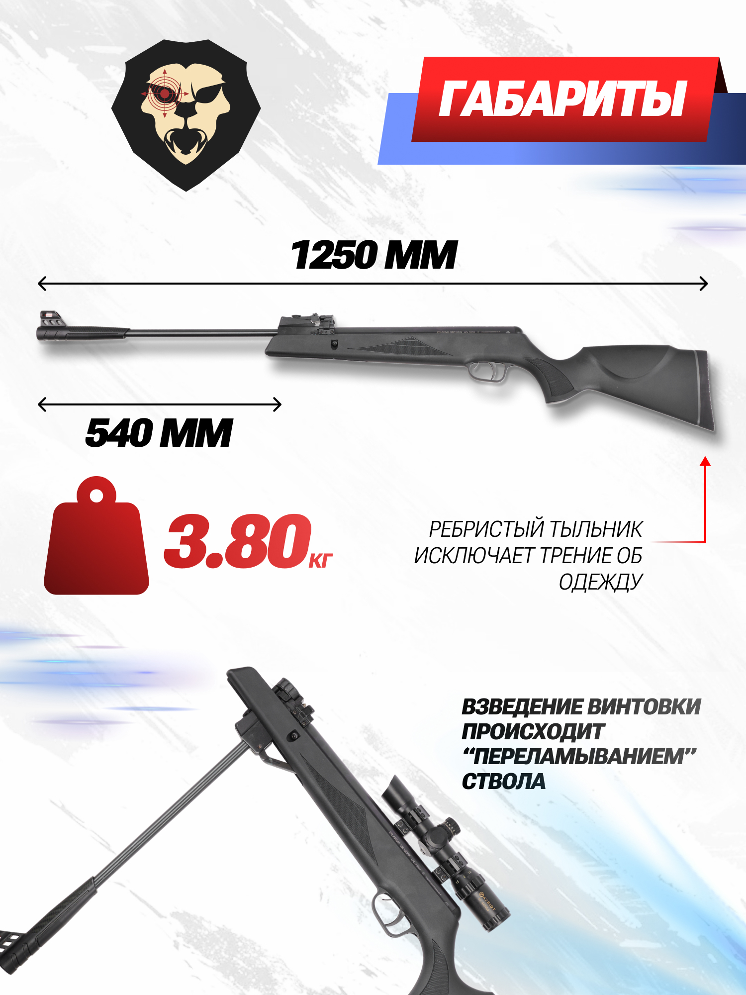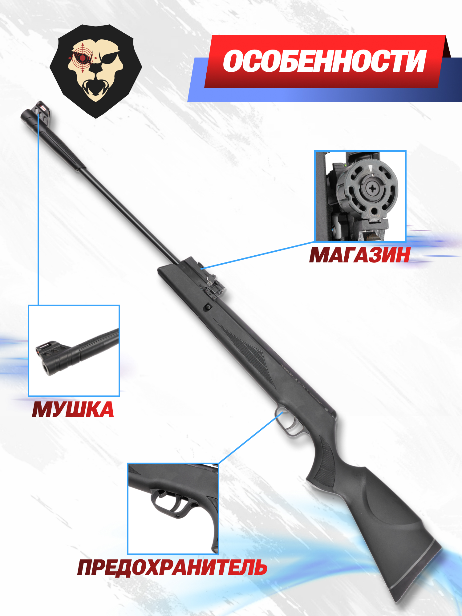 В момент выстрела боеприпас разгоняется до скоростной отметки выше 160-170 метров в секунду, что в сочетании с нарезным 54-сантиметровым стволом позволяет добиться стабильной средней точки попадания при стрельбе по целям, которые расположены на большой дистанции. При этом, изготовитель учитывает требования российского оружейного законодательства и ограничивает мощность изделия в пределе 3 Дж, благодаря чему приобретается пневматика без лицензии.