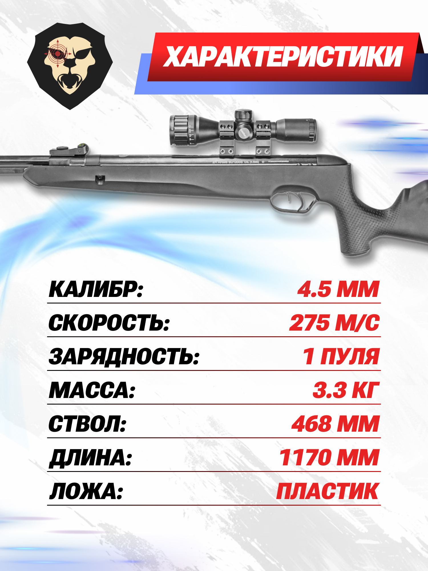 Согласно информации производителя, в заводском исполнении представленная пневматическая винтовка способна разгонять стандартную по весу пулю до скорости больше 275 метров в секунду. Важно отметить, что для российского рынка значение дульной энергии выстрела пневматики ограничивается в пределе значения, равного трем Джоулям. Такая характеристика свидетельствует о возможности свободной покупки изделия без оформления лицензии на оружие.