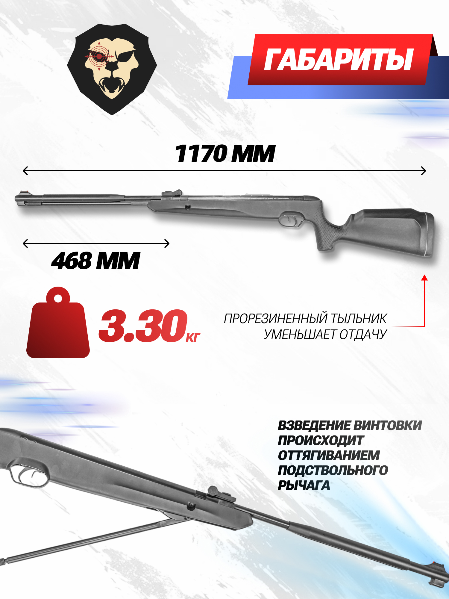 Также упоминания требуют массогабаритные характеристики изделия, поскольку при длине в 1160 миллиметров, масса пневматической винтовки не превышает 3040 грамм. Добиться таких показателей позволило использование ударопрочного полимера в качестве материала для изготовления ложа.