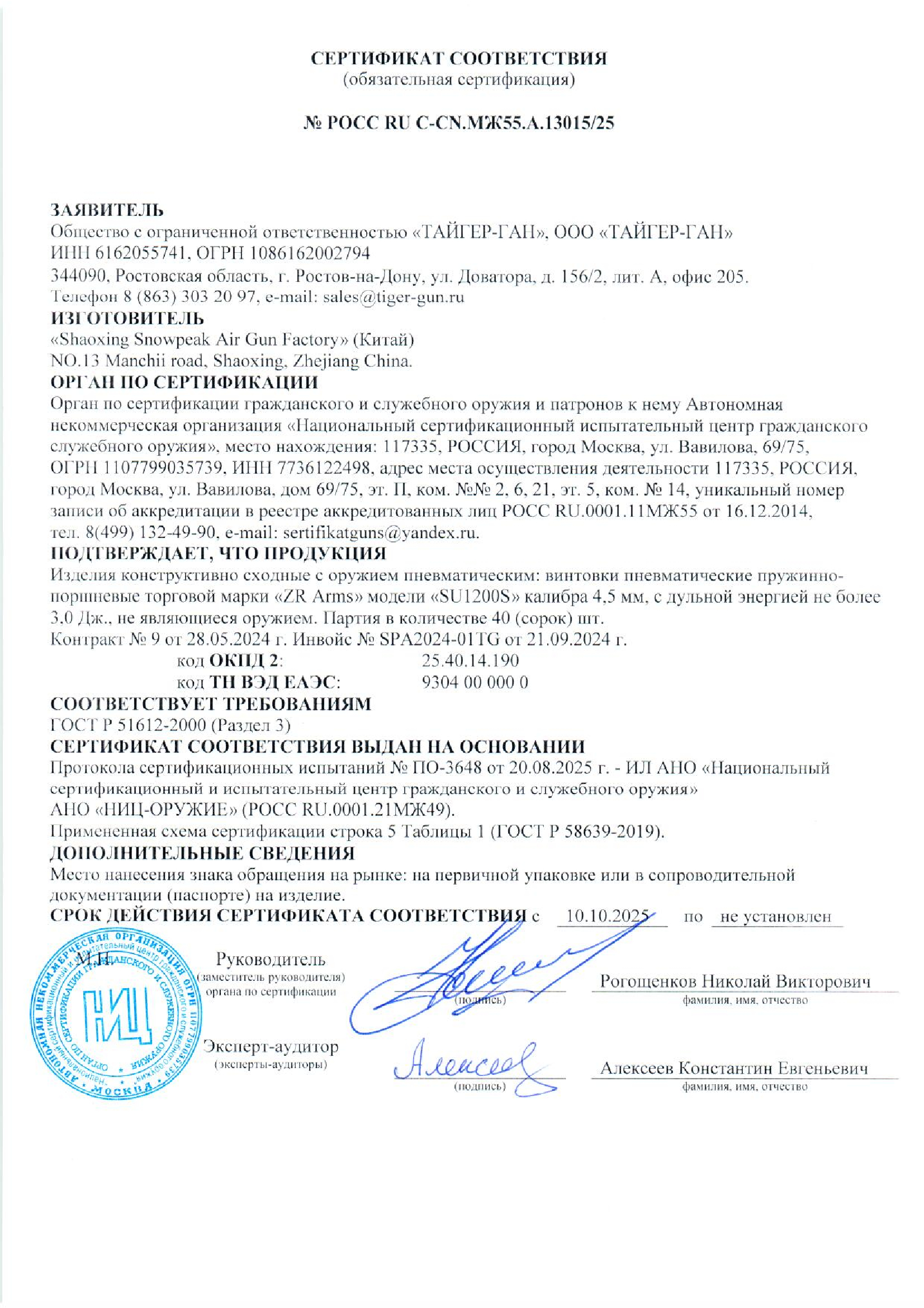 | Комплектация | Винтовка, упаковка, краткая документация, копия сертификата (по запросу покупателя) |