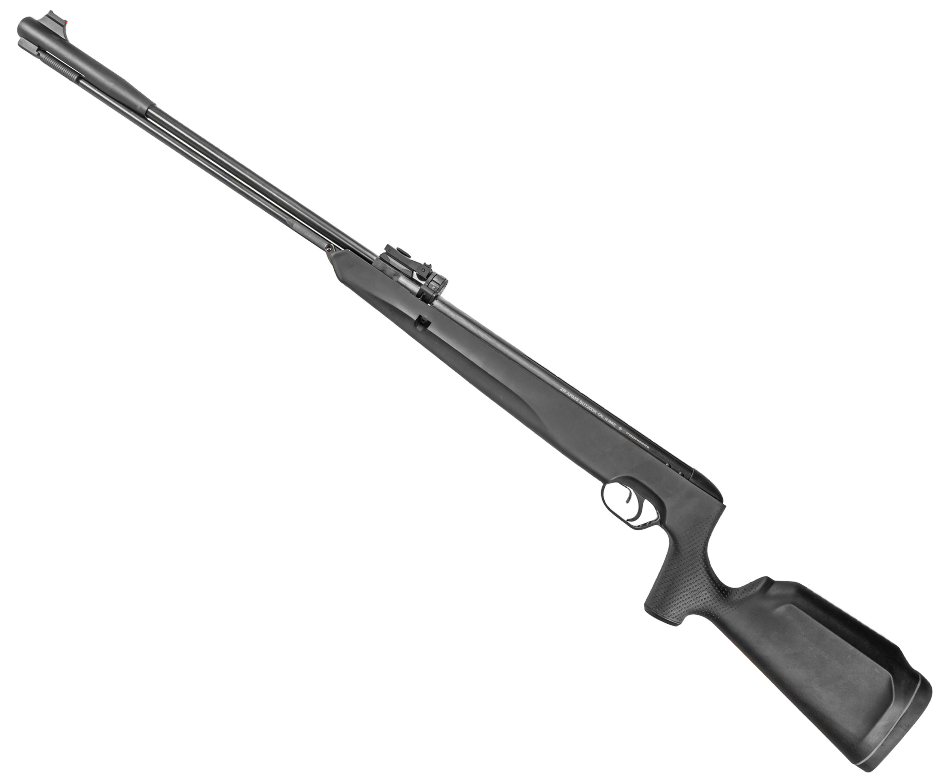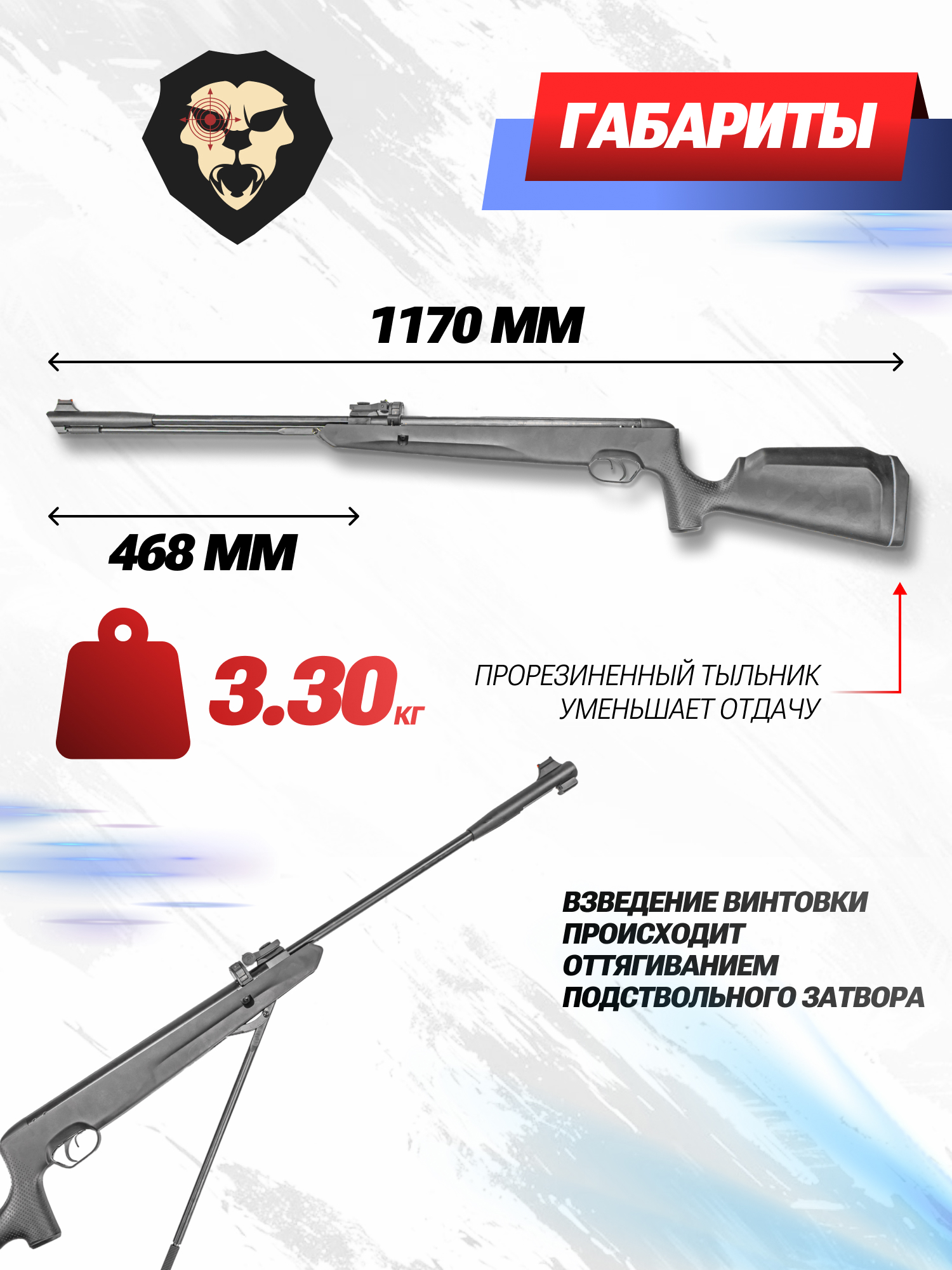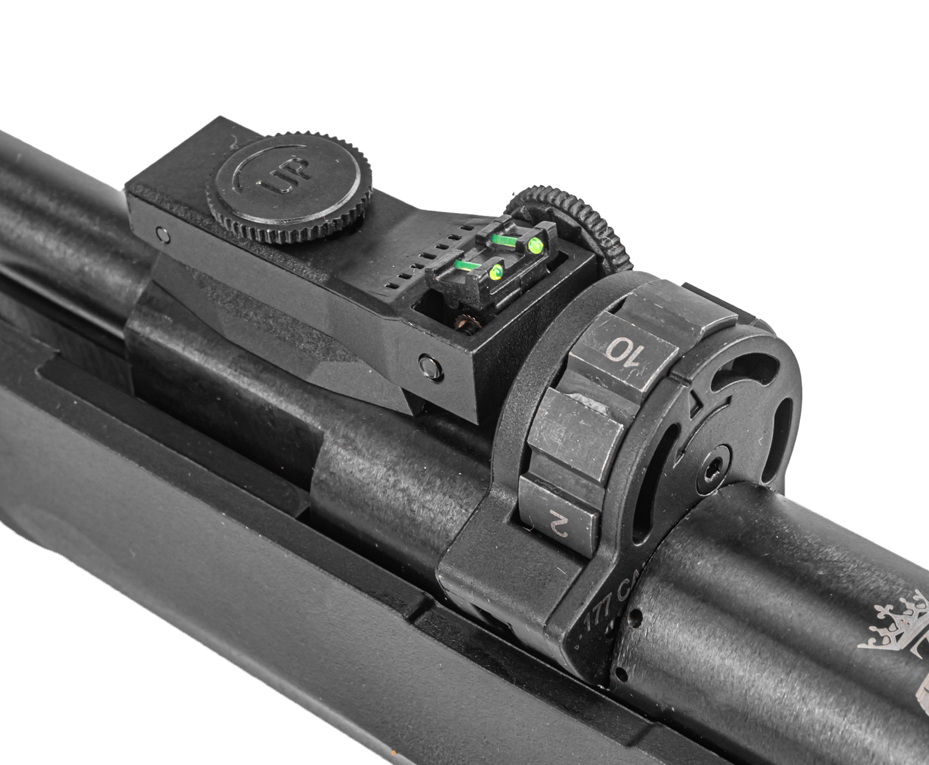 Говоря про ствол, требуется отметить, что его длина составляет 468 миллиметров, что при наличии во внутренней части канала 12 классических нарезов позволяет добиться выделяющихся показателей точности выстрела при работе с целями на средней для пневматического оружия дистанции. В свою очередь, снарядами для стрельбы из винтовки выступают традиционные и привычные воланчиковые пульки калибра 4.5 миллиметра. В роли элемента боепитания выступает барабанный магазин с 10 ячейками под боеприпасми - слот для его размещения находится непосредственно перед целиком.
