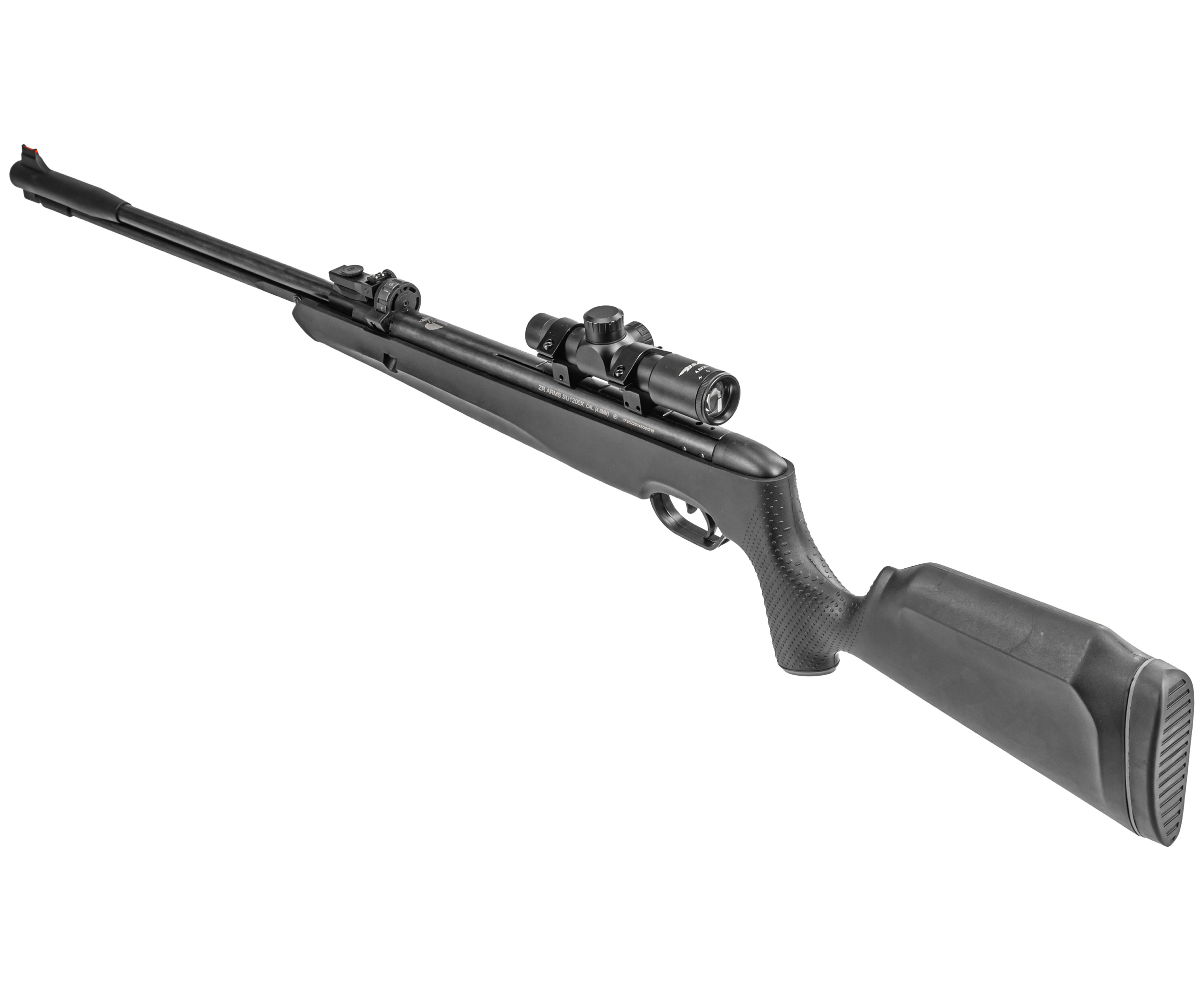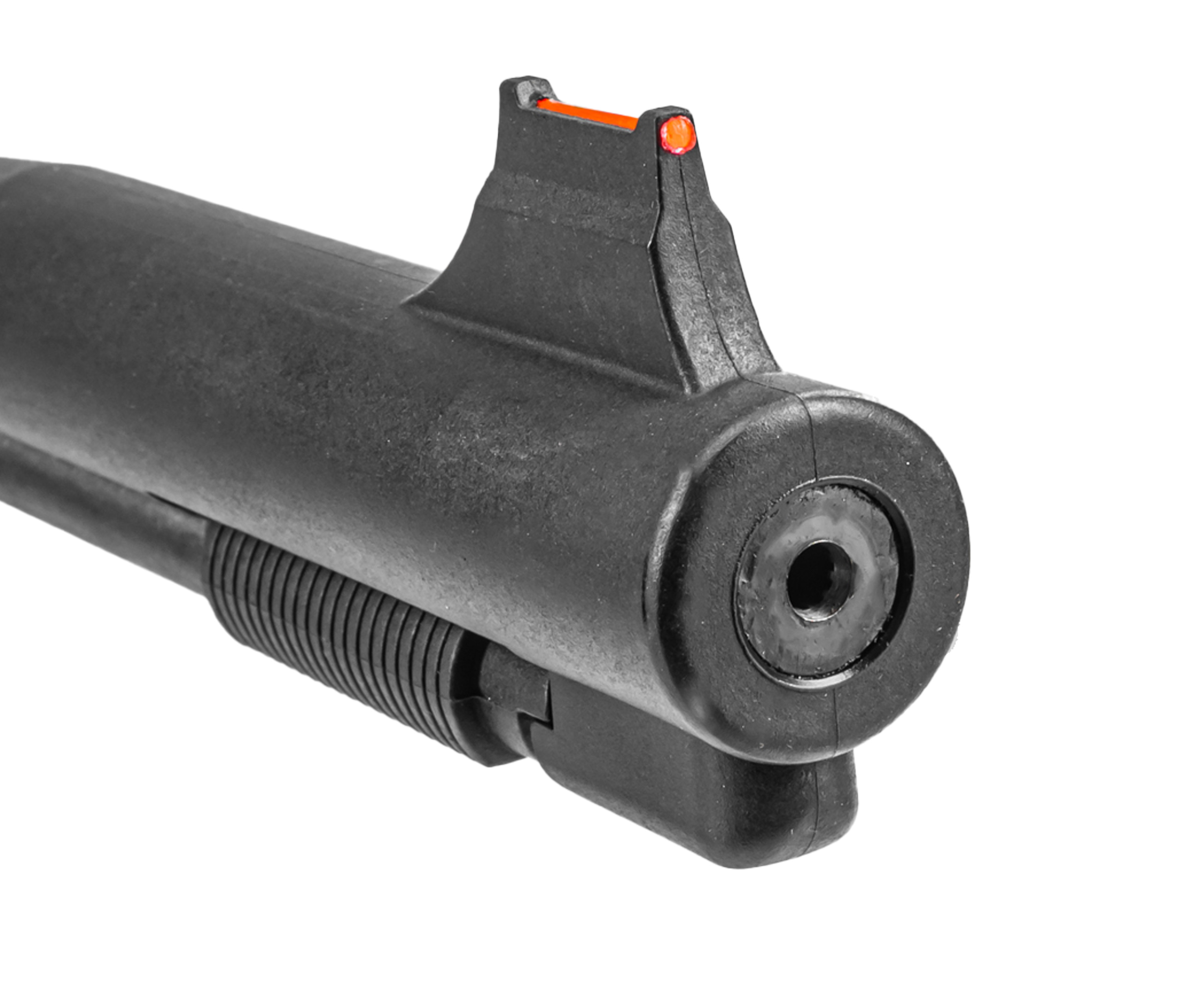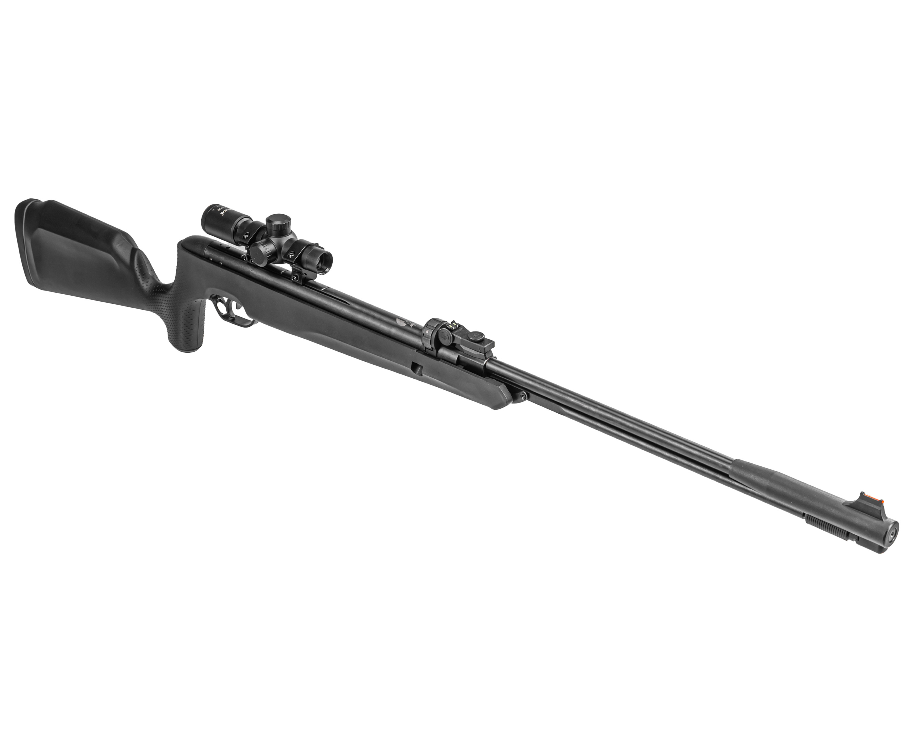 Говоря про ствол, требуется отметить, что его длина составляет 468 миллиметров, что при наличии во внутренней части канала 12 классических нарезов позволяет добиться выделяющихся показателей точности выстрела при работе с целями на средней для пневматического оружия дистанции. В свою очередь, снарядами для стрельбы из винтовки выступают традиционные и привычные воланчиковые пульки калибра 4.5 миллиметра. В роли элемента боепитания выступает барабанный магазин с 10 ячейками под боеприпасми - слот для его размещения находится непосредственно перед целиком.